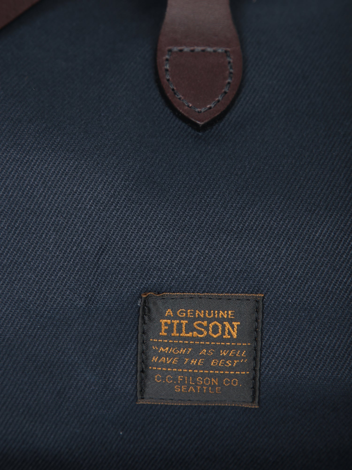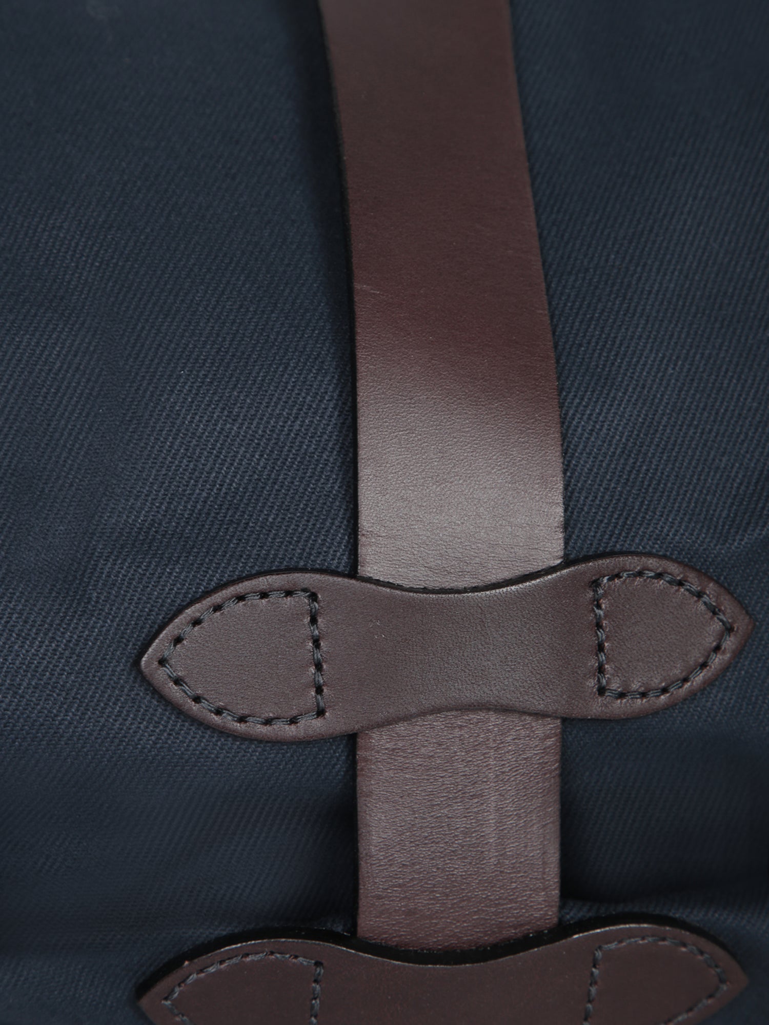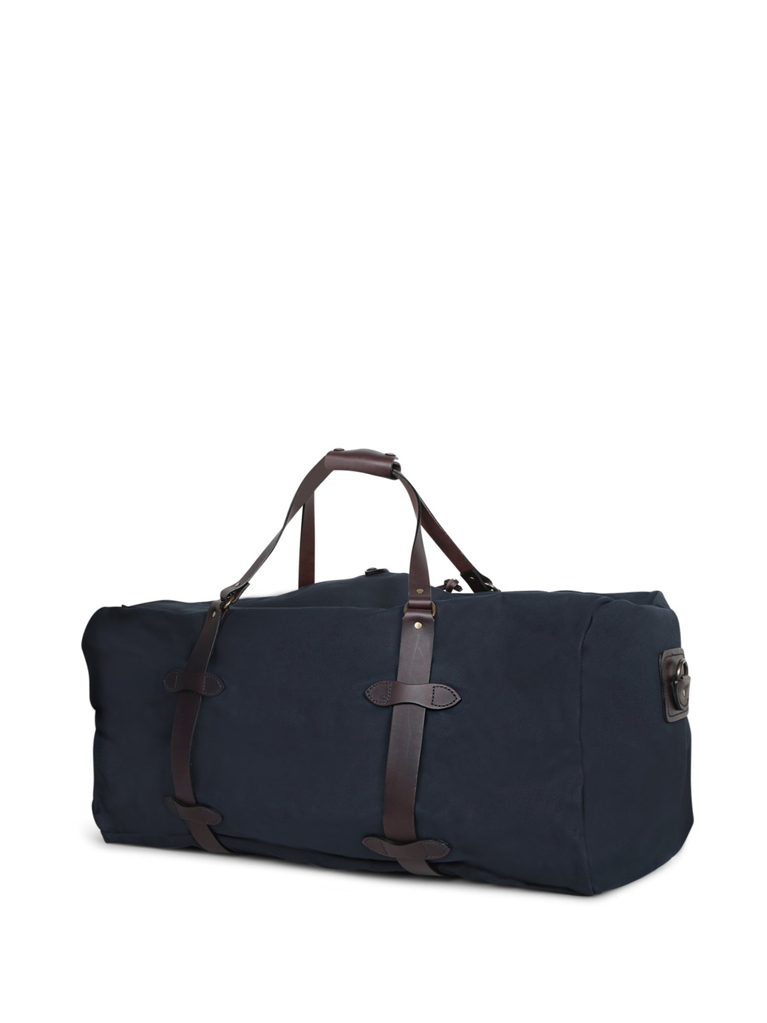 Spacious travel bag in durable canvas with leather details. Features an adjustable and removable shoulder strap, leather handles, and metal closures.