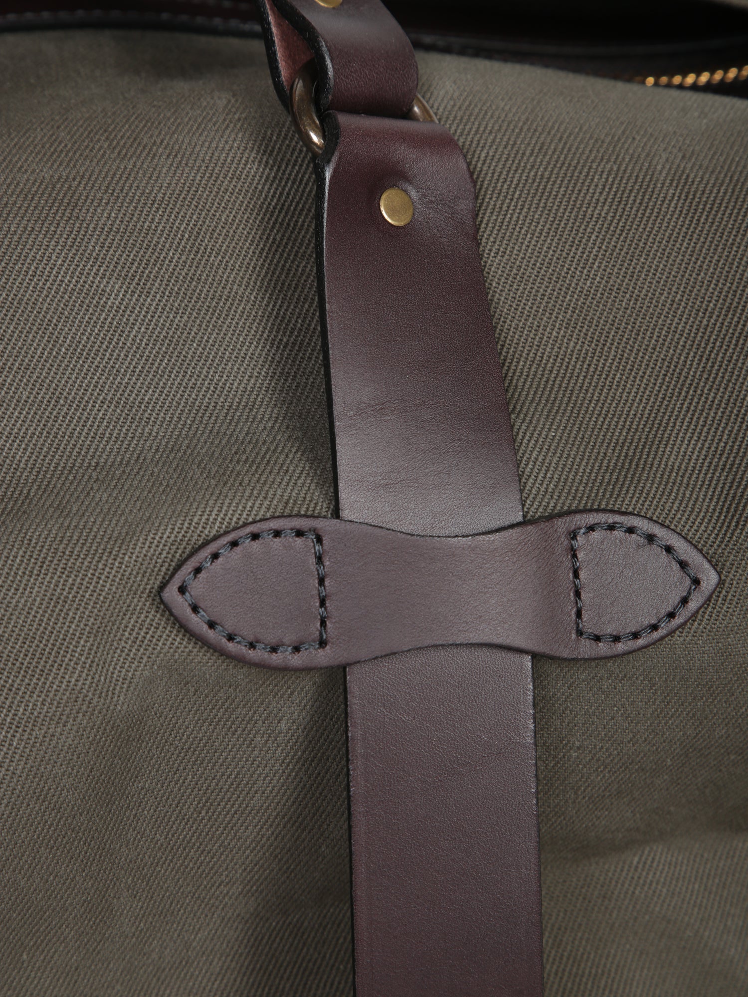 Crafted from durable water-resistant fabric. Leather trim. Top zip closure.