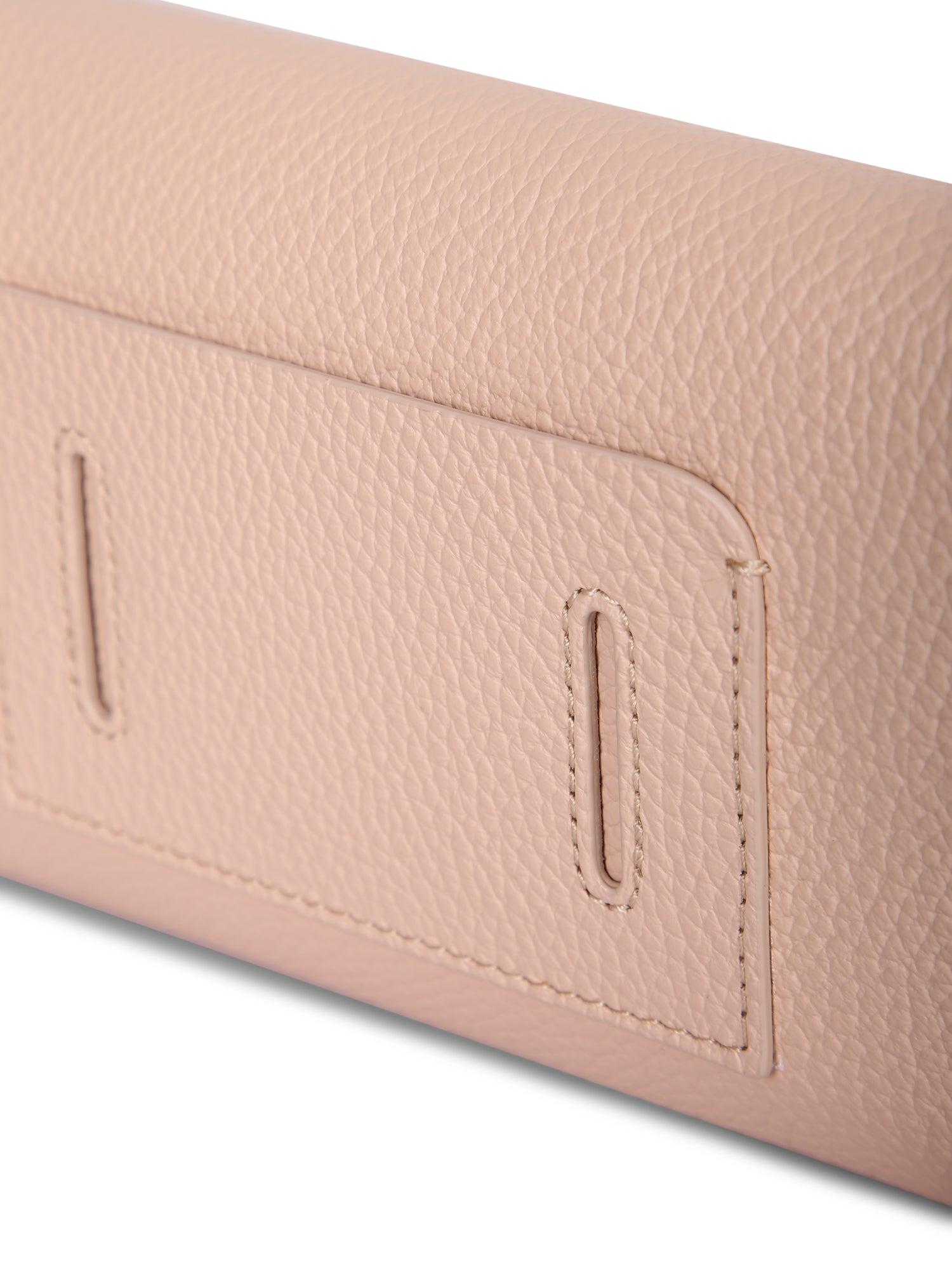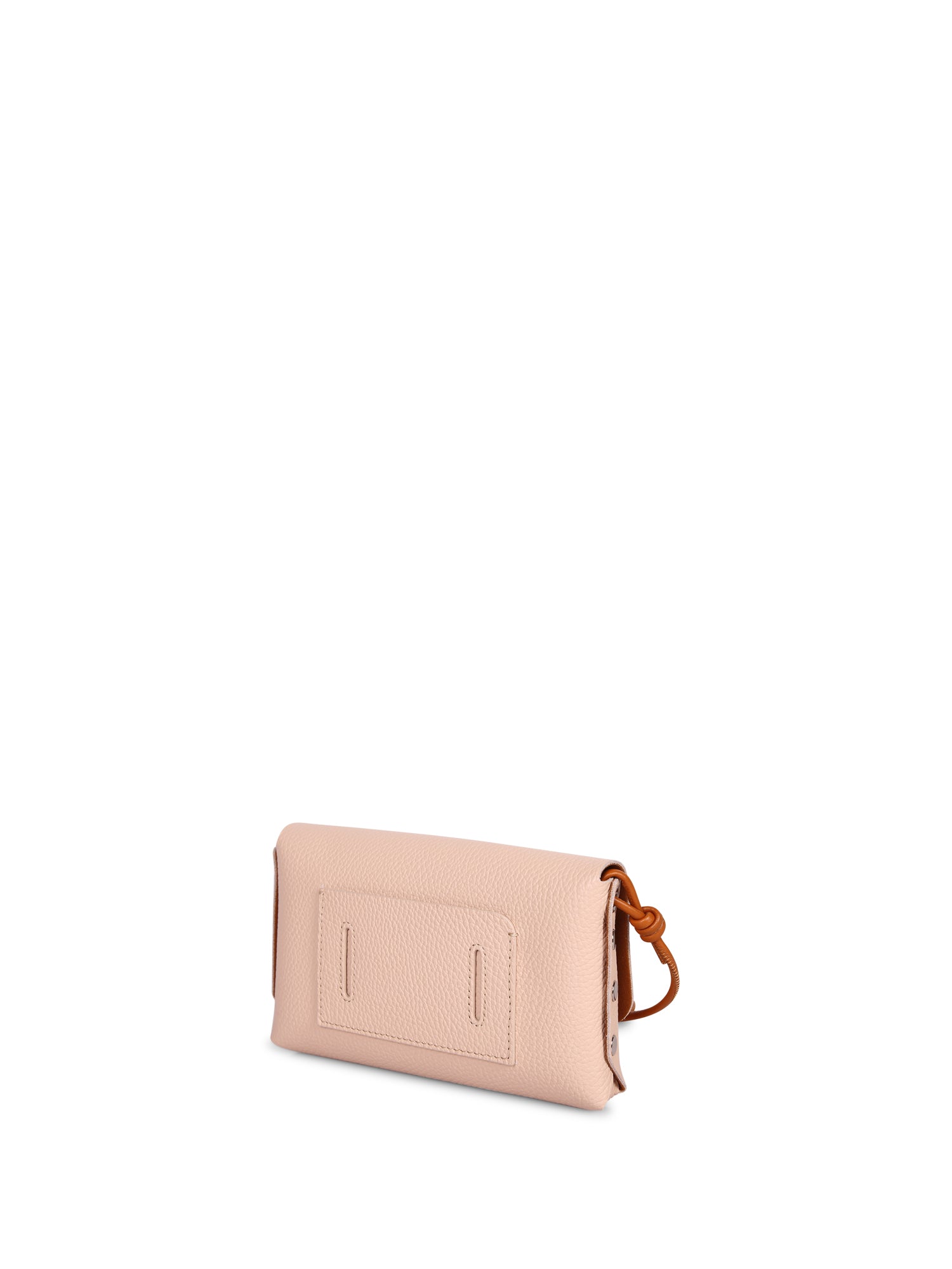 Fine pebbled leather. Metal twist-lock closure. Leather shoulder strap.