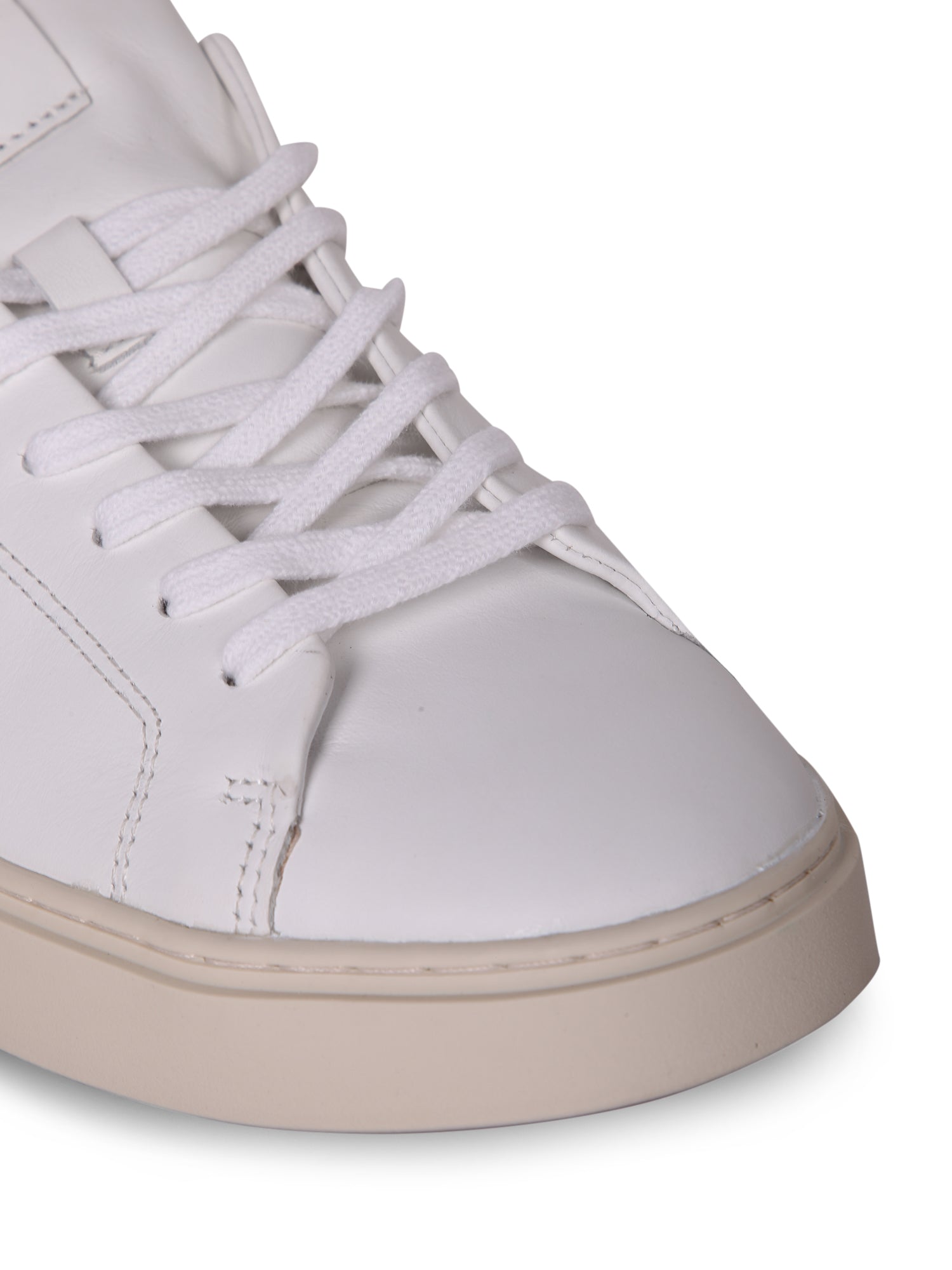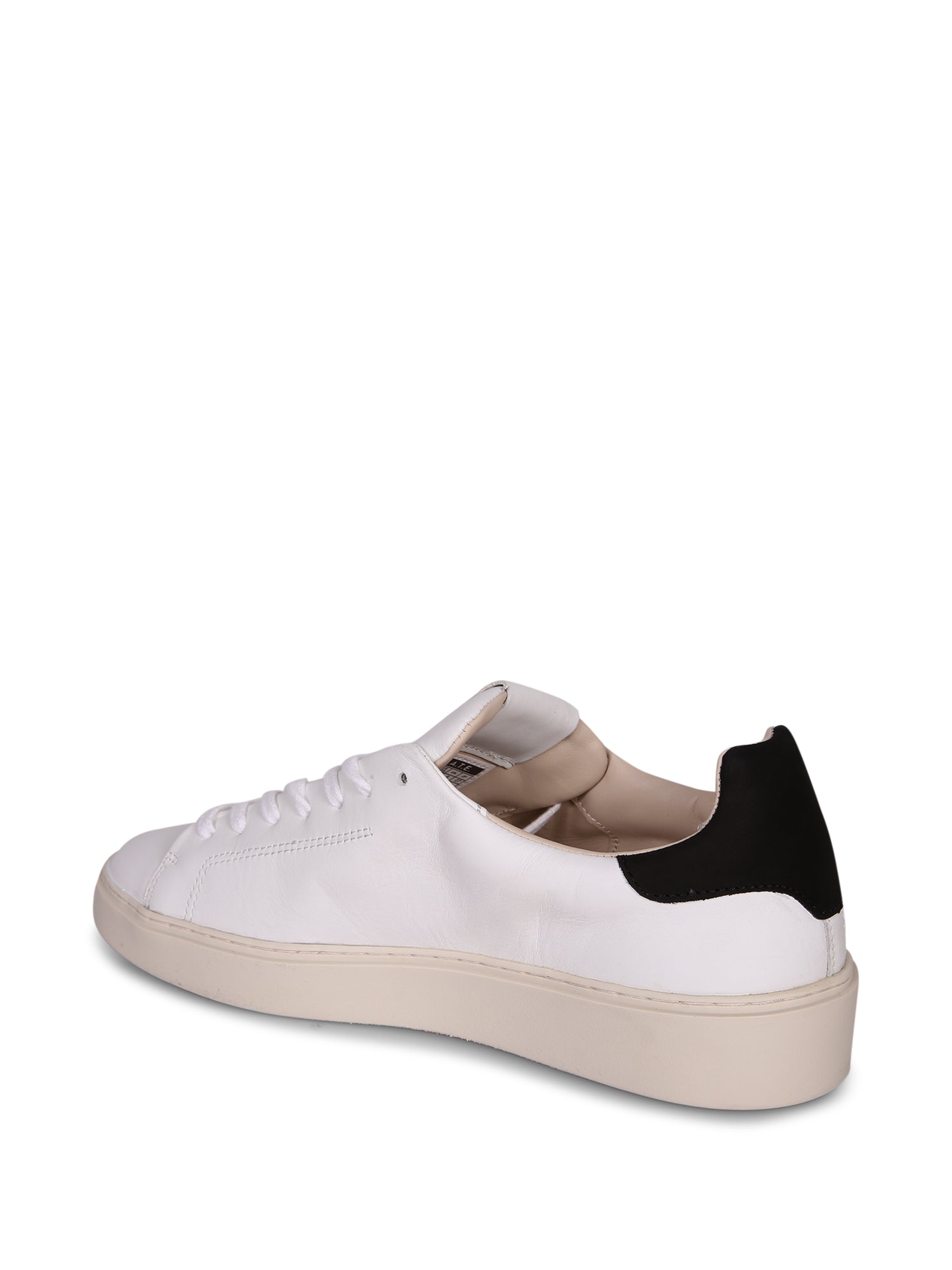 White leather sneakers with black back detail. Square logo on the outer side. Beige rubber sole.
