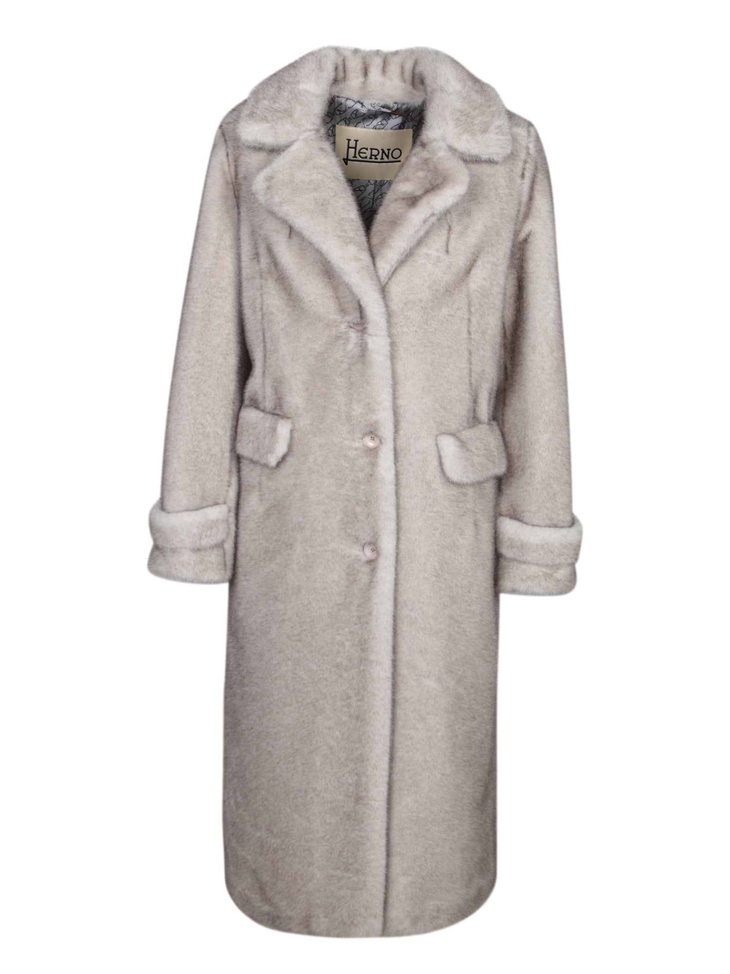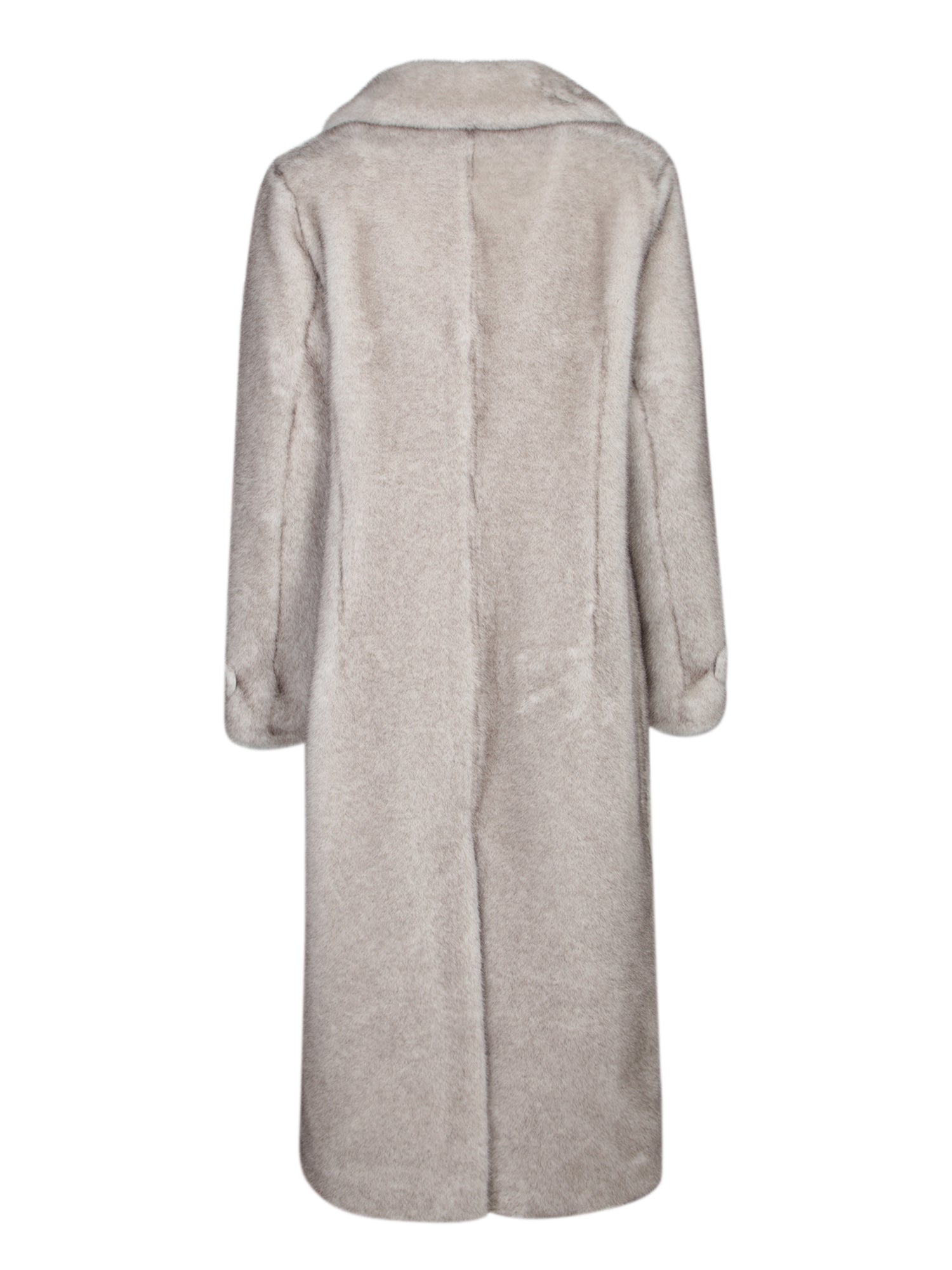 Long coat in soft fabric with faux fur collar, button closure, and patch pockets.