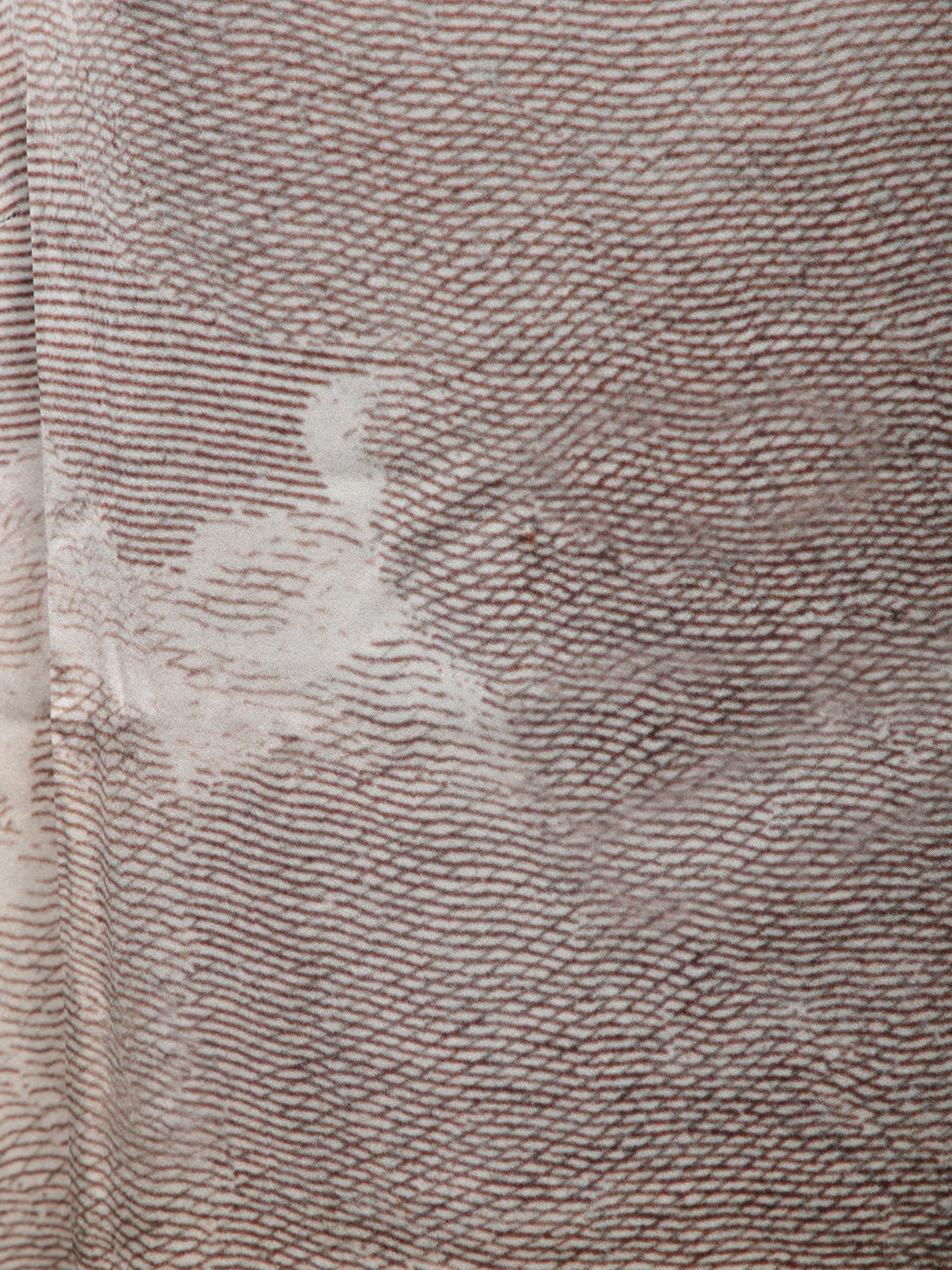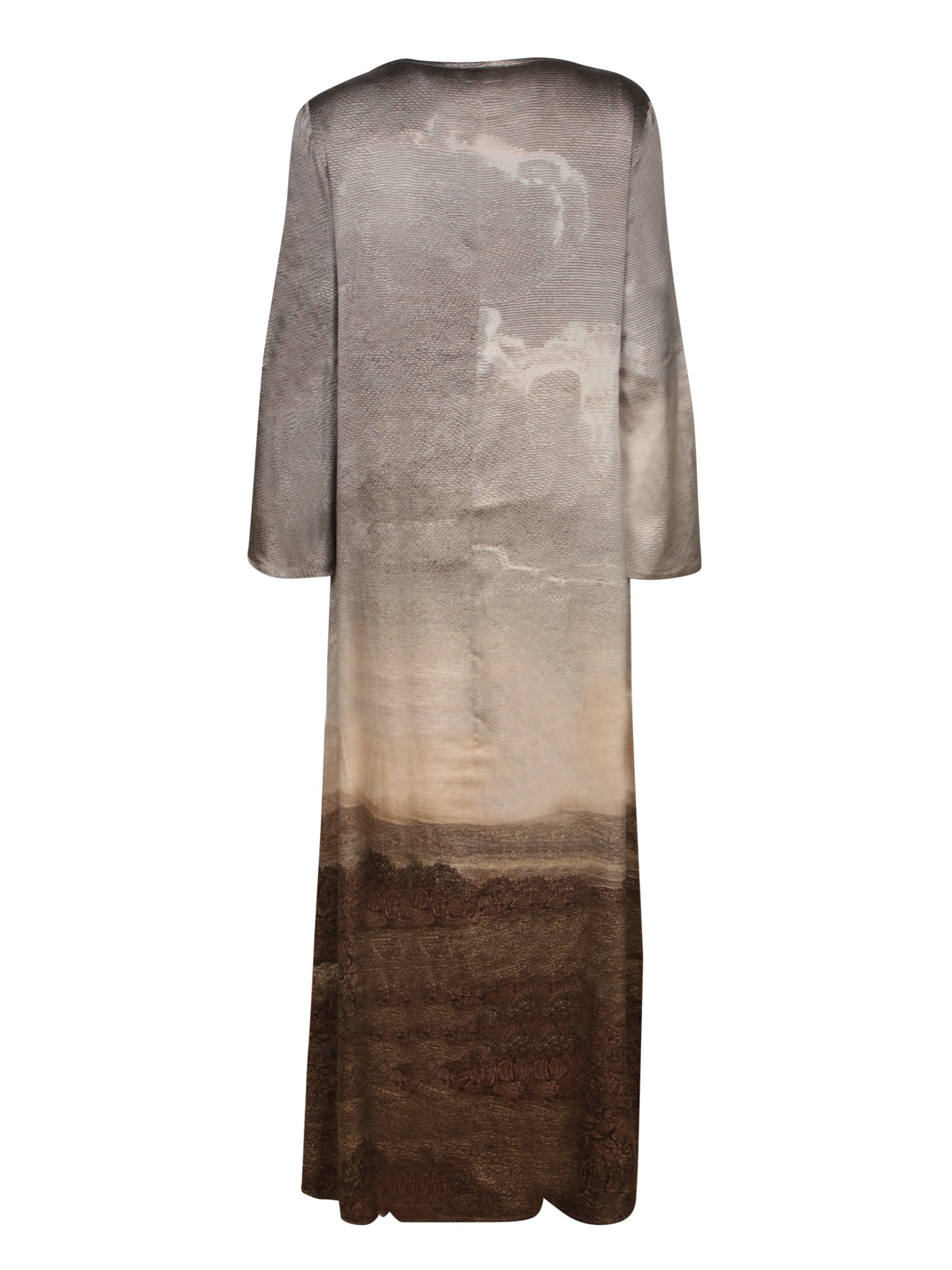 Long dress with long sleeves. Jacquard fabric with landscape pattern. Crew neck.