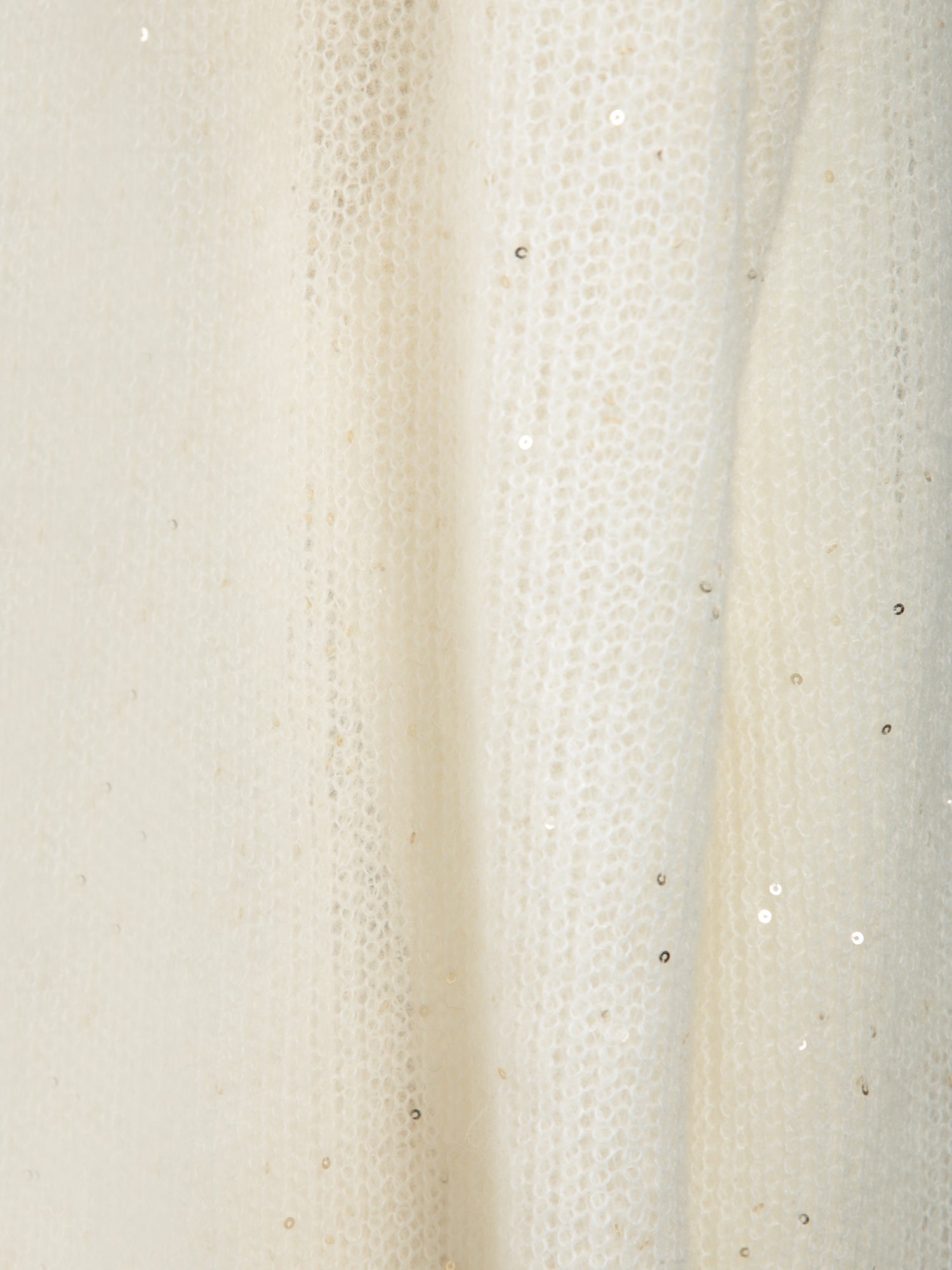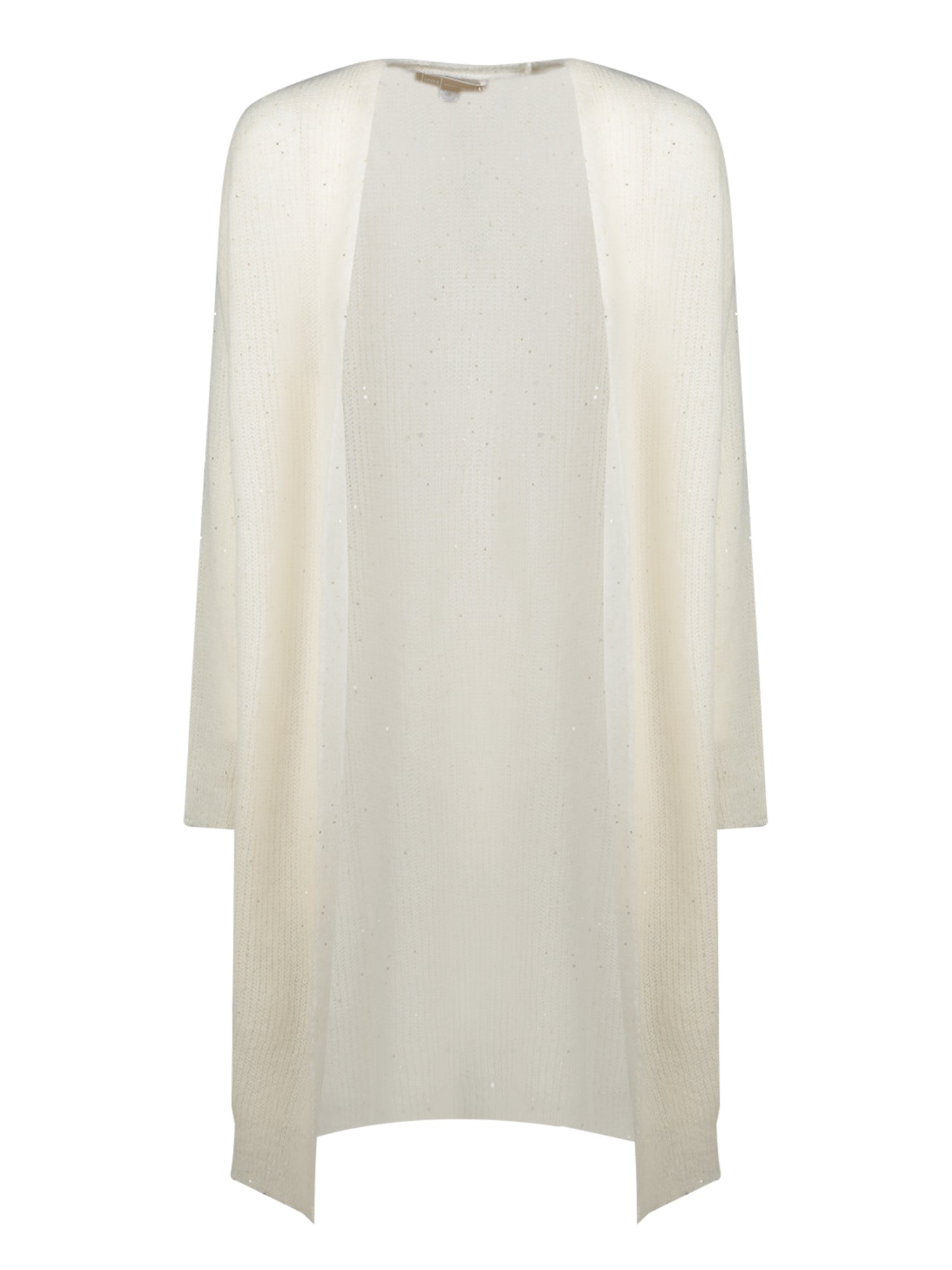 Open-front fine knit cardigan with sparkling details, long sleeves, and an asymmetrical hem.