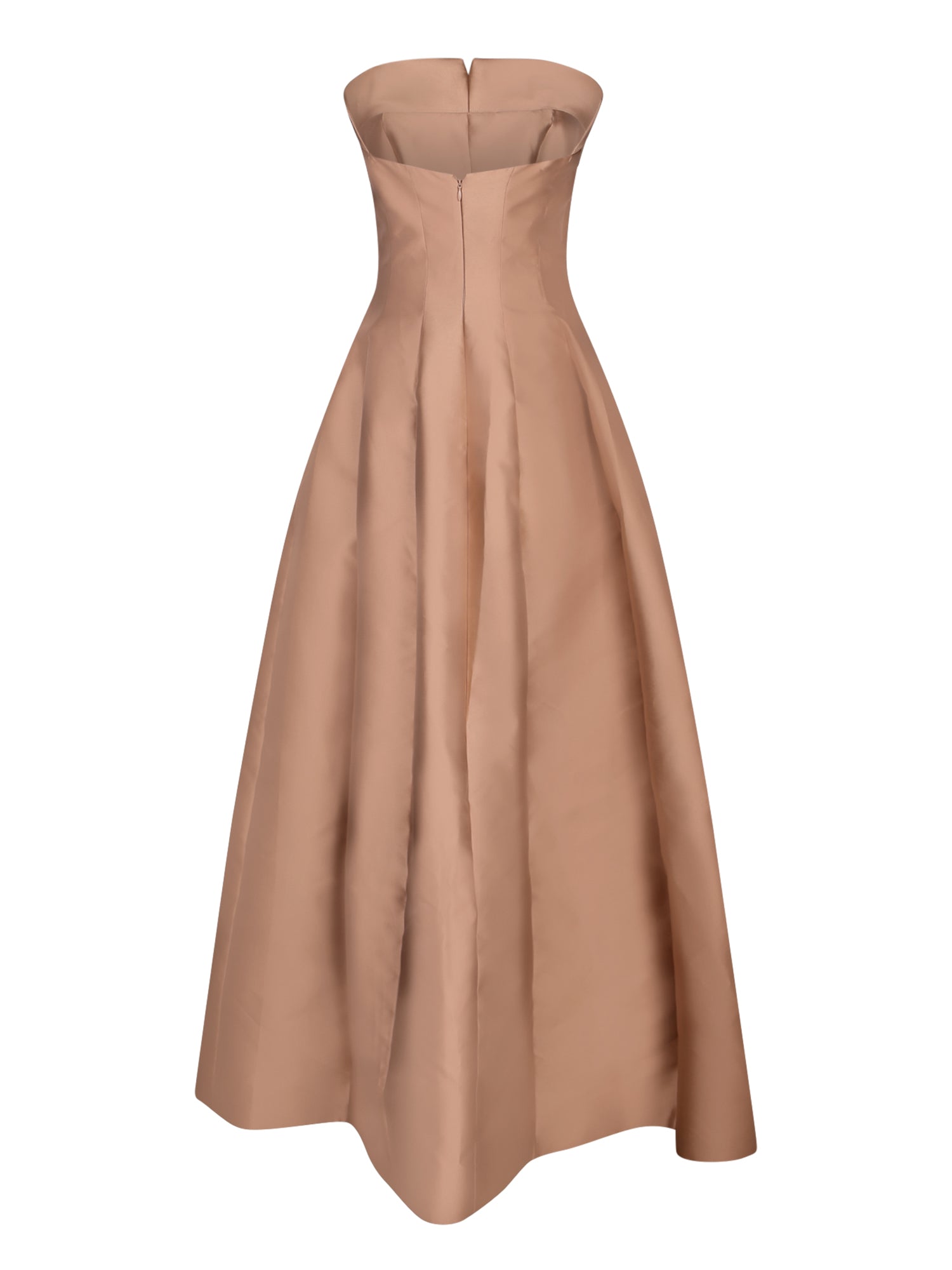 Sleeveless structure. Full-length silhouette. Rear zip closure.