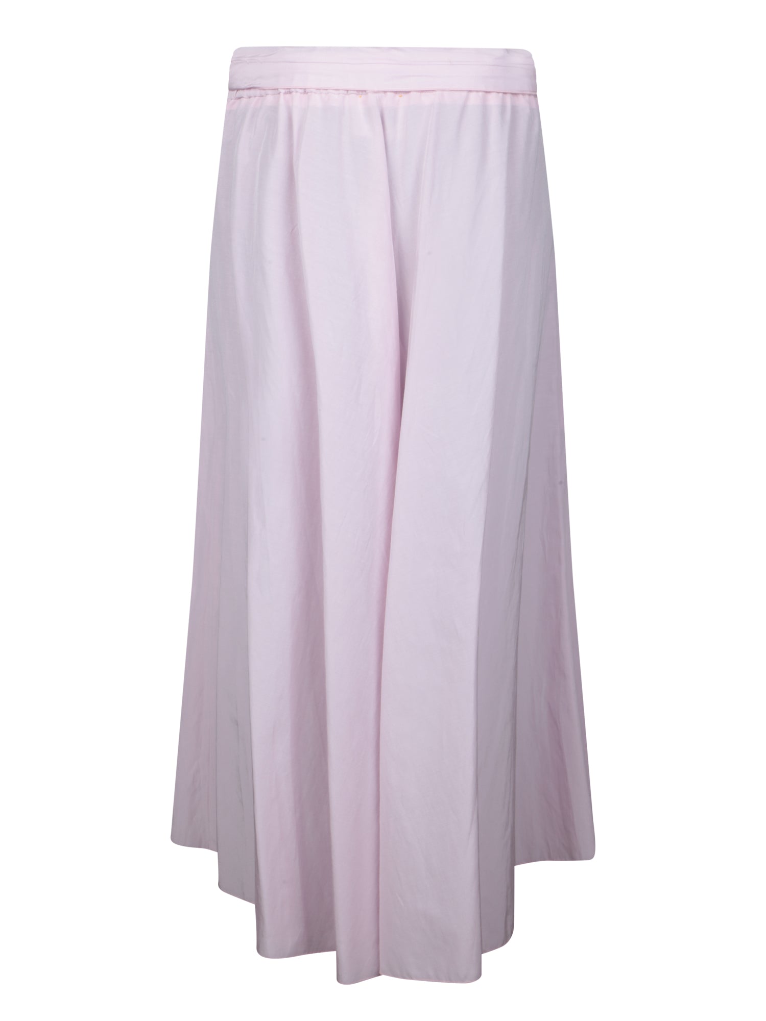 This long skirt by Forte Forte enchants with its wraparound silhouette and delicate pink hue. The elegant design is completed by an asymmetrical hem that adds a touch of flowing movement, perfect for special occasions.