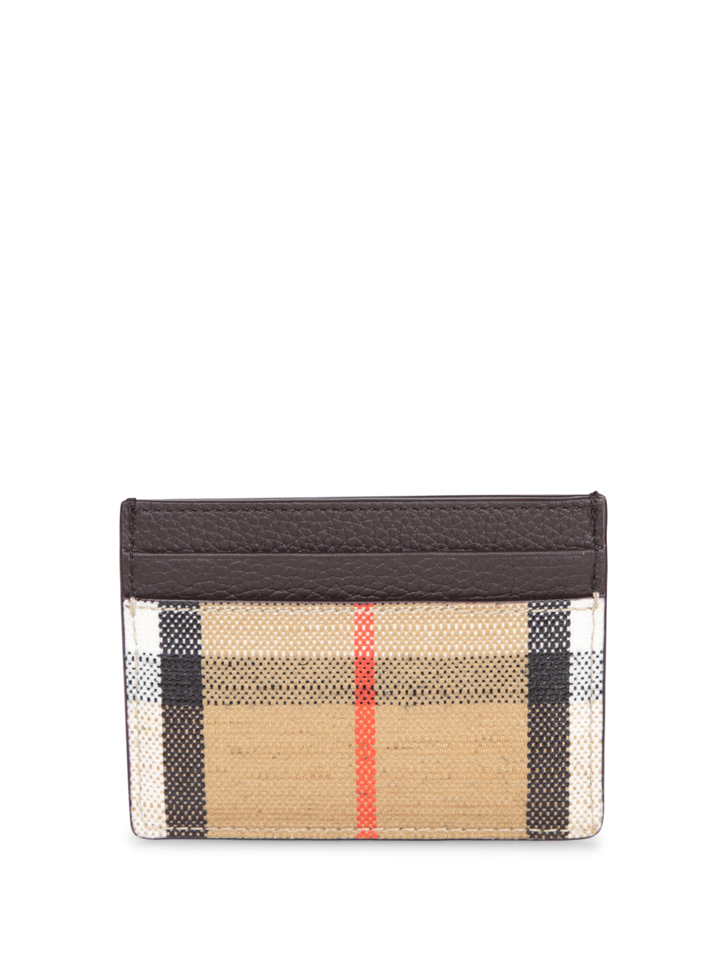 Check canvas card holder with leather details. Embossed brand logo on the front.