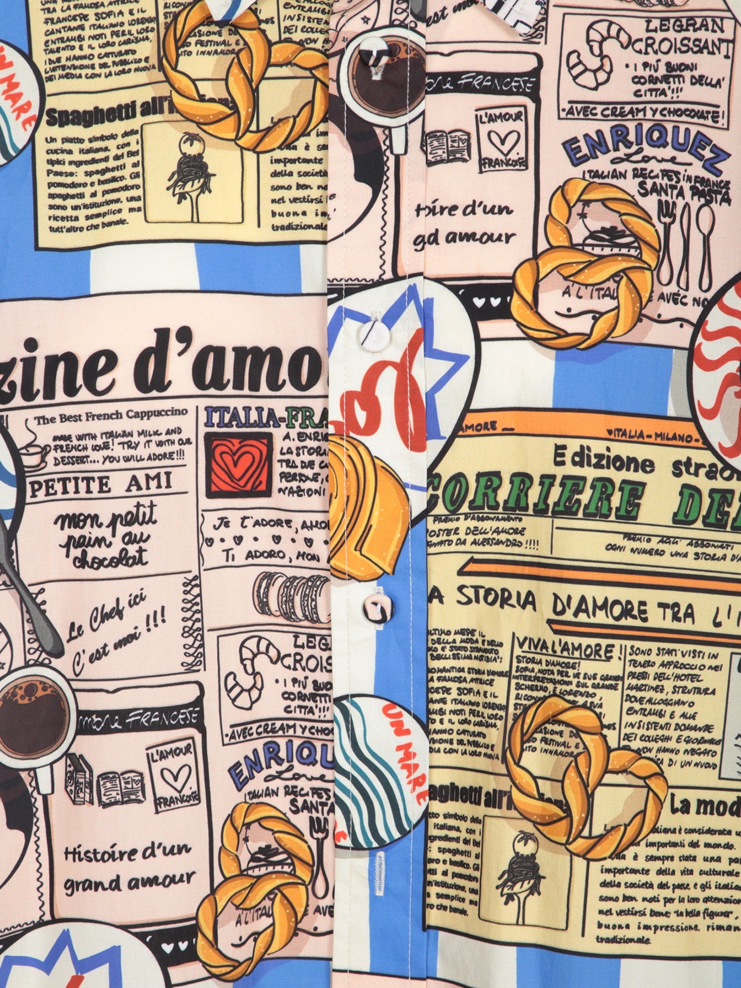 Long sleeve shirt. Classic collar. Multilingual newspaper print with graphic details.