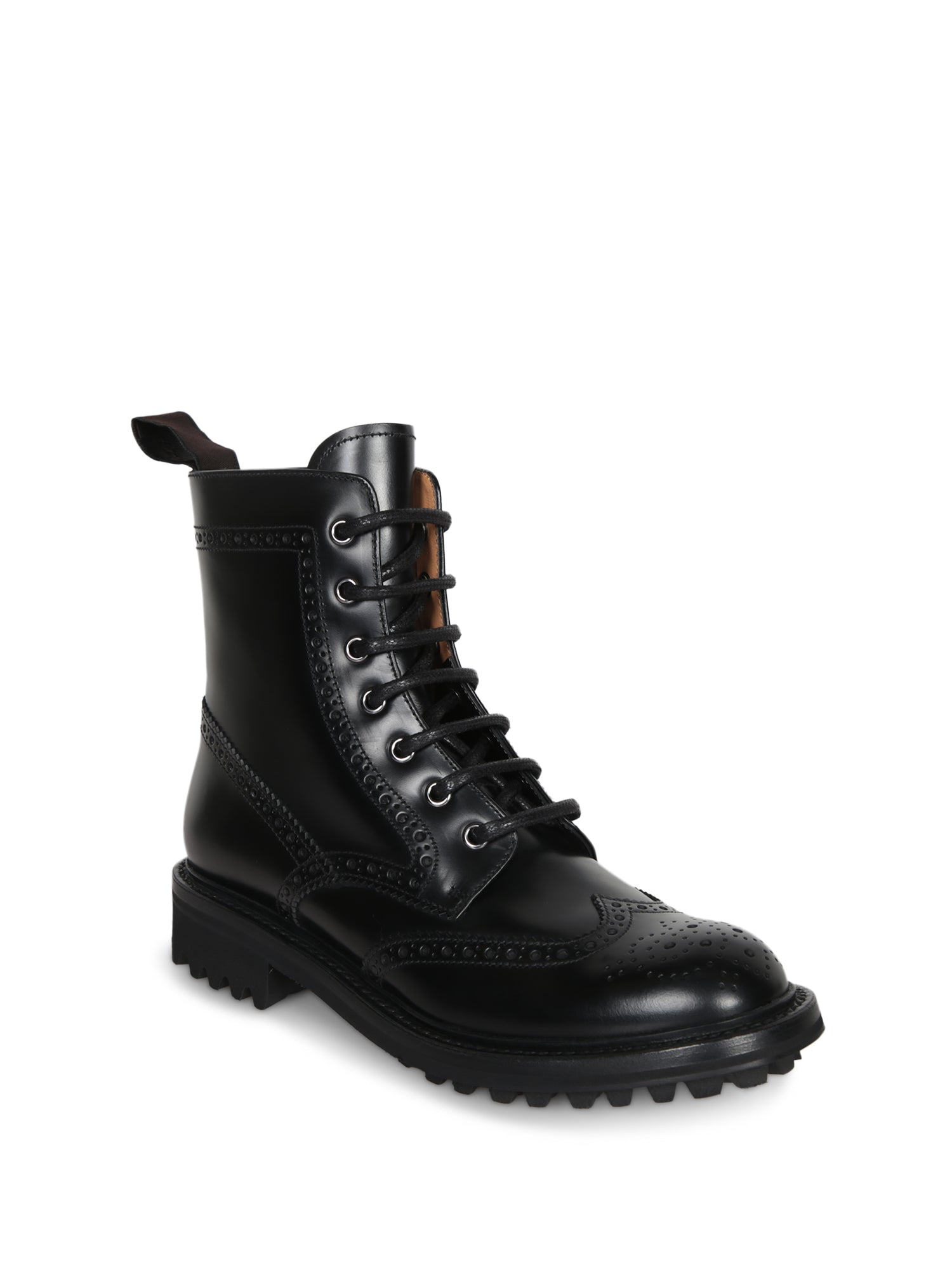 Black leather boot with brogue detailing. Lace-up closure. Rubber lug sole.