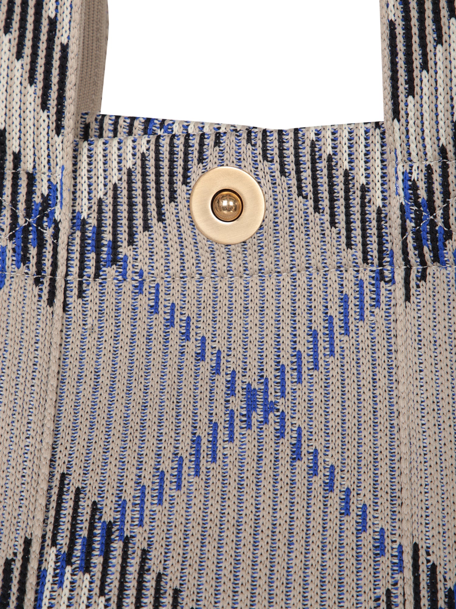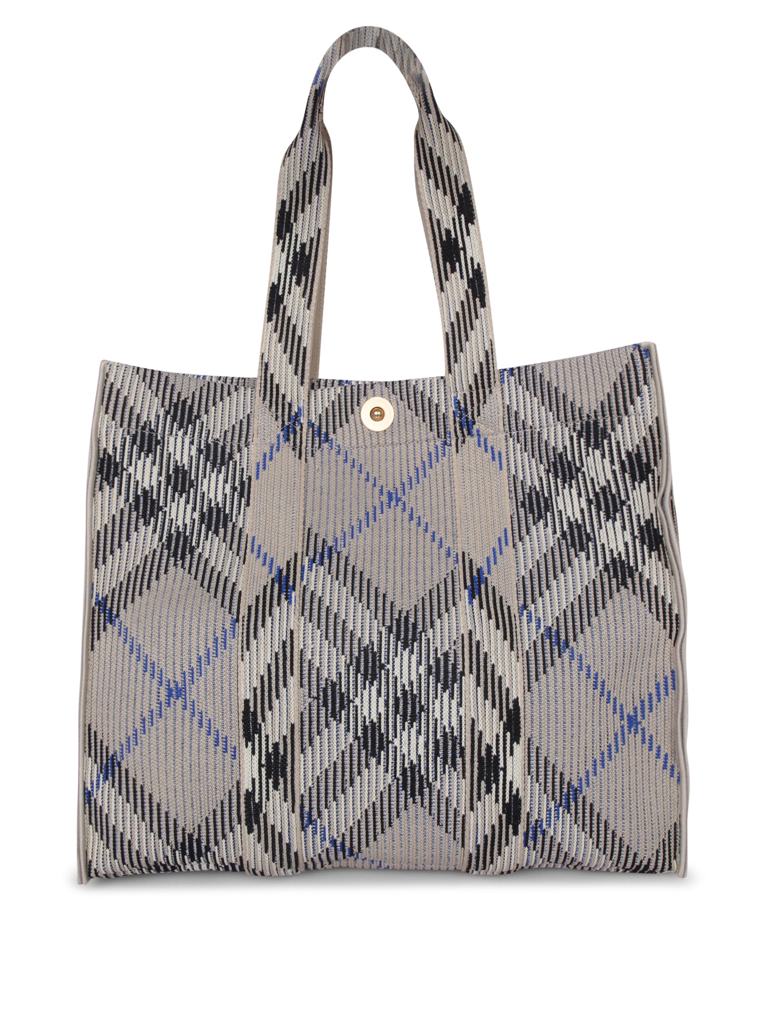 This stylish Burberry tote bag features an iconic Check print enhanced with touches of blue, paired with the practicality of a top button closure.