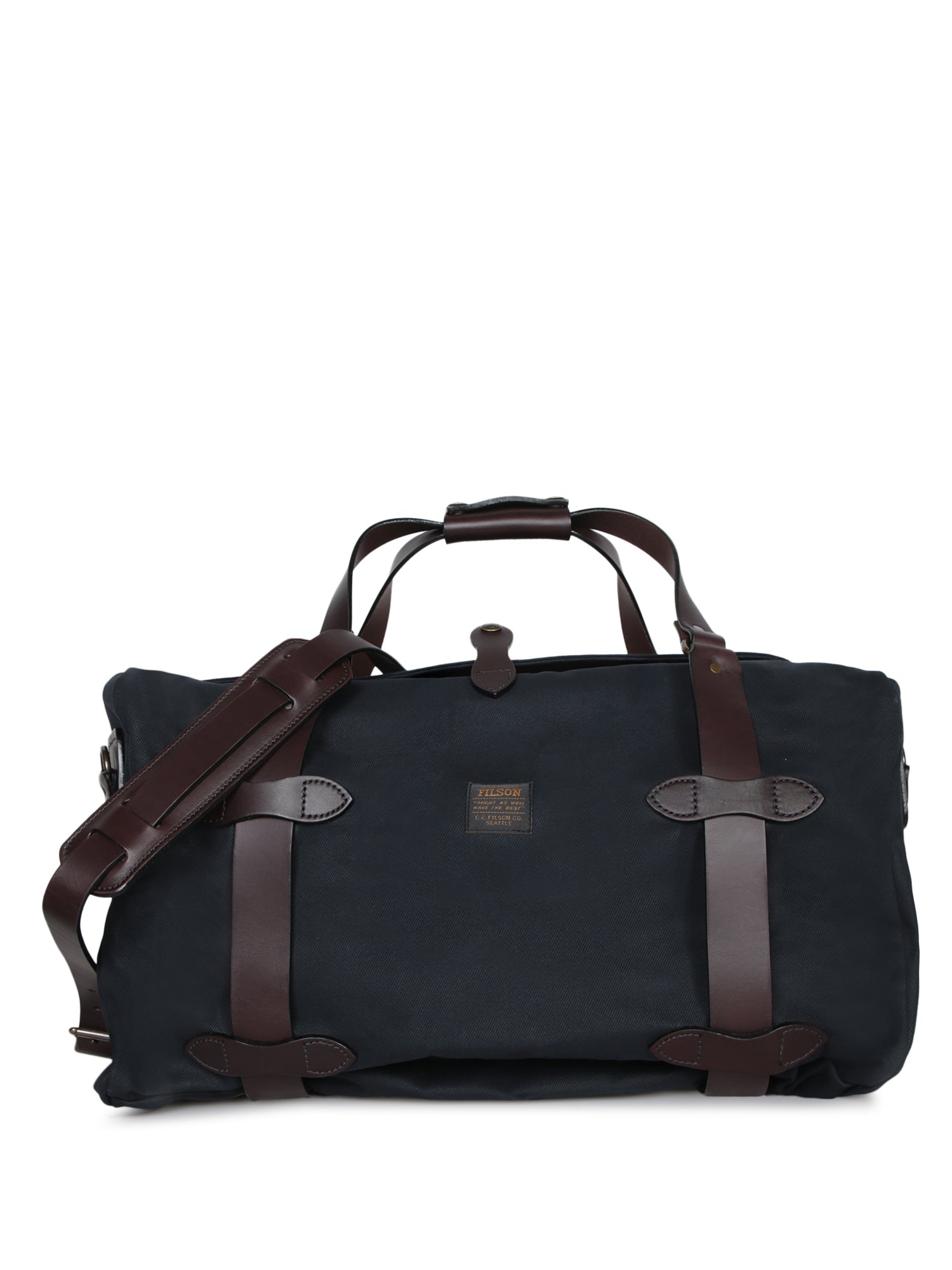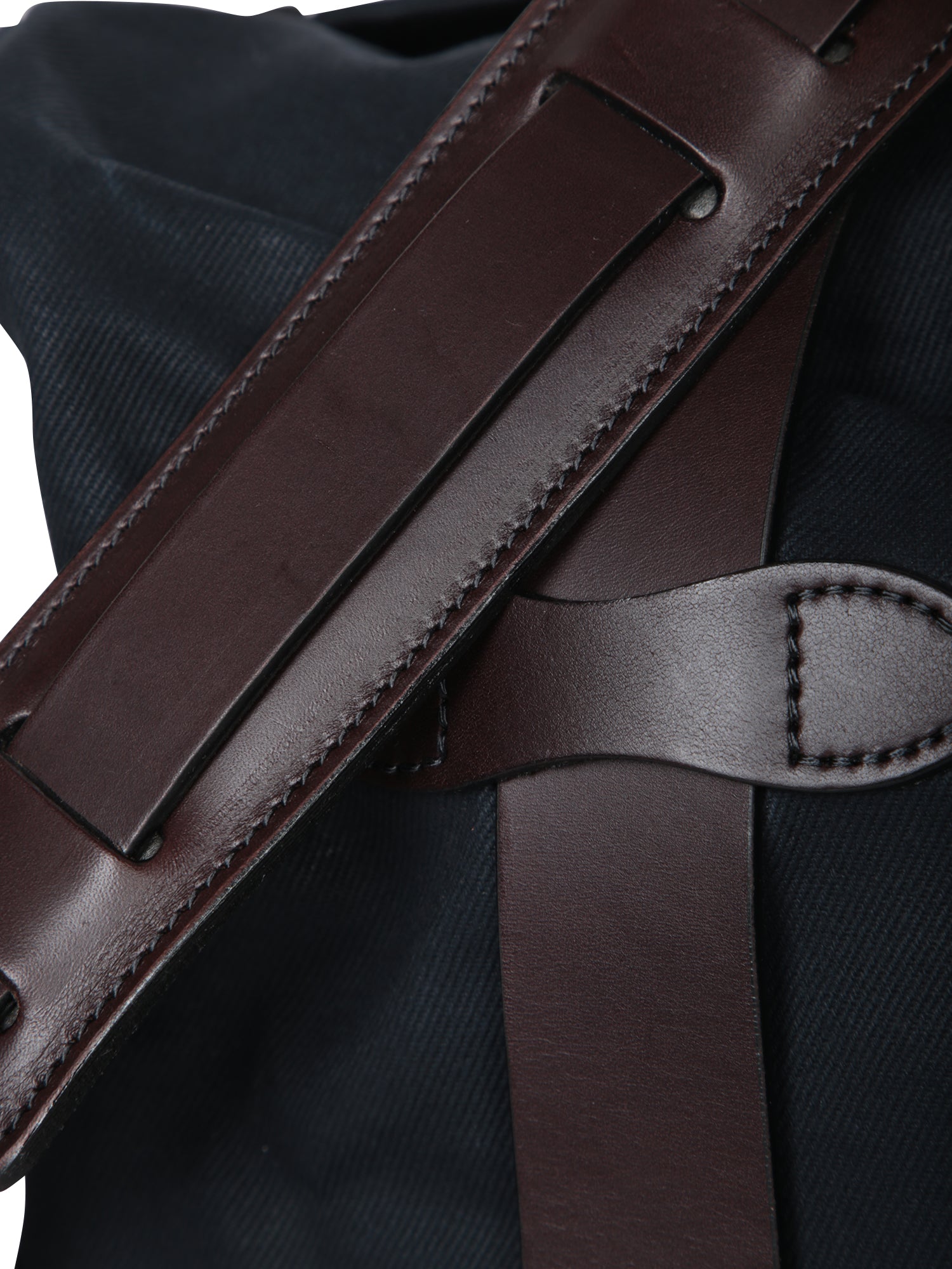 Sturdy canvas bag with brown leather details. Zip closure and adjustable, removable shoulder strap.
