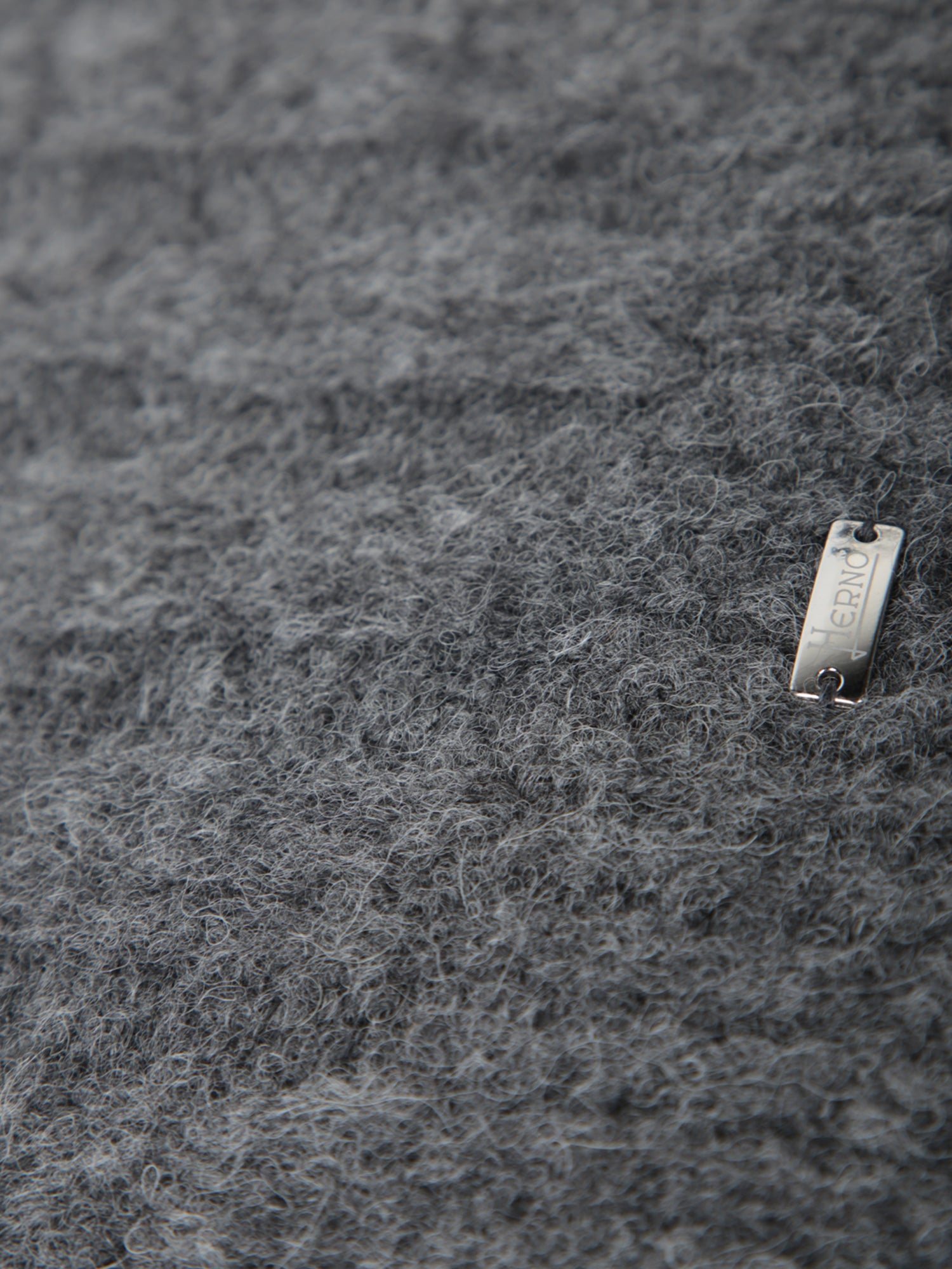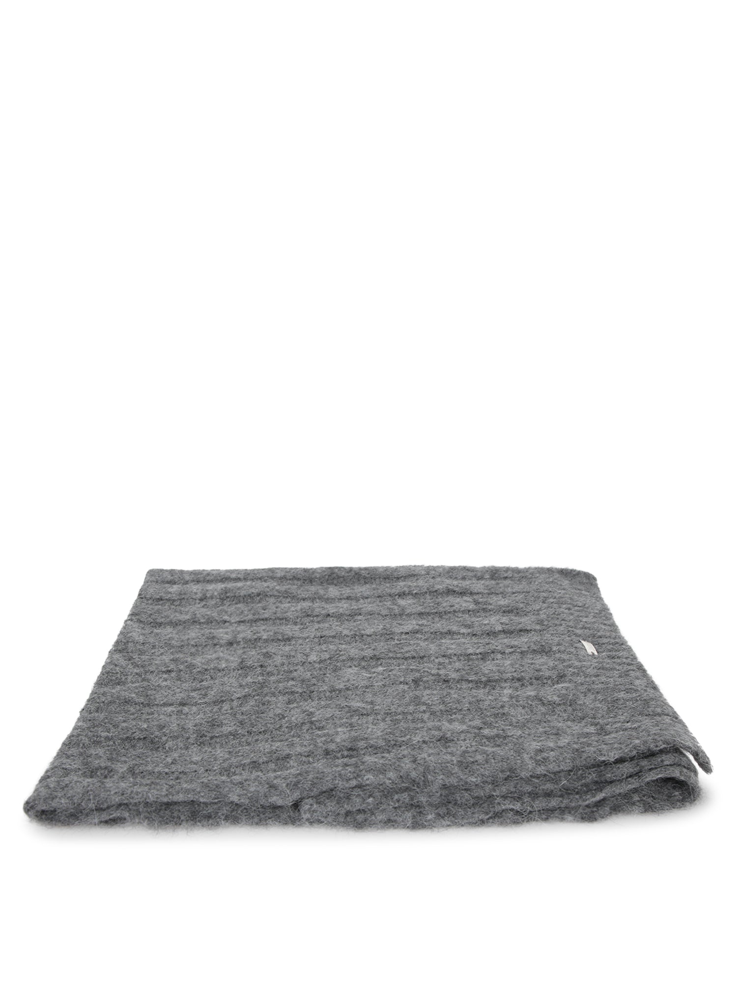 Knit scarf made of alpaca wool, metallic grey color, soft and enveloping fabric.