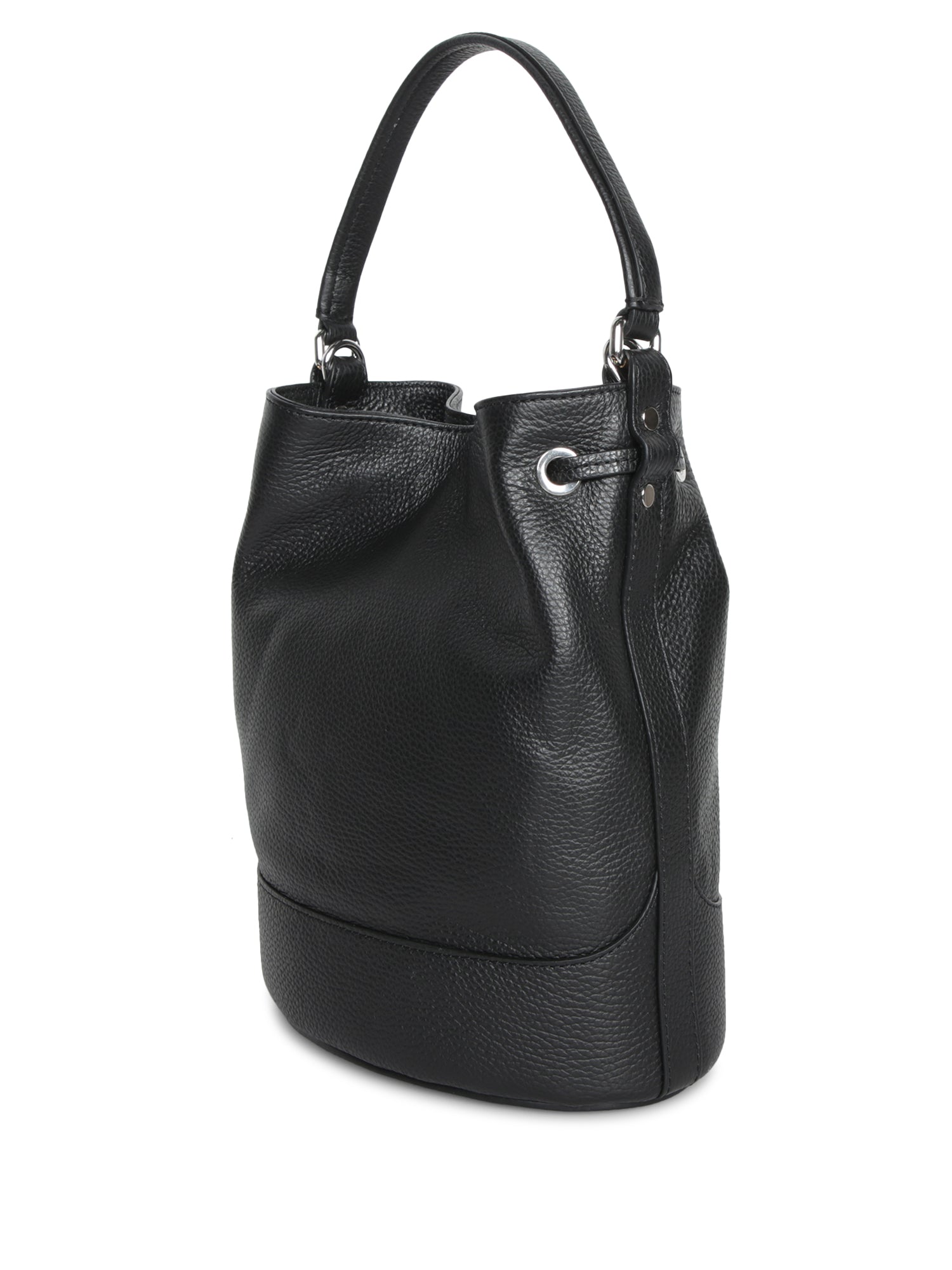 Black leather bag with silver metallic hardware. Snap closure with brand logo.