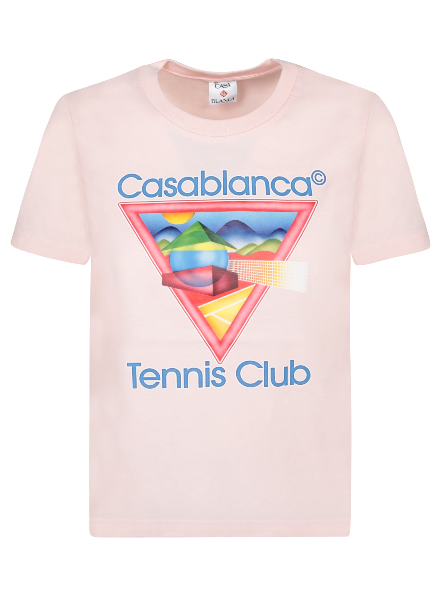 This pink Casablanca t-shirt is crafted from a soft fabric to ensure comfort during leisure. The central print features a colorful mountain landscape in a retro style, perfect for those who love a dynamic look.