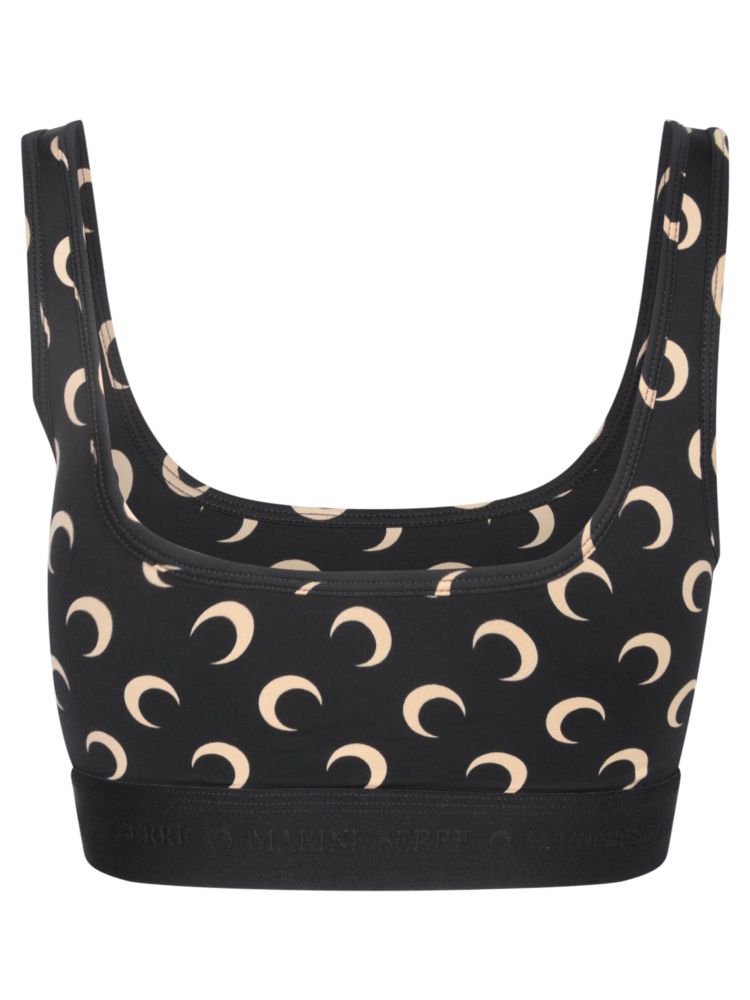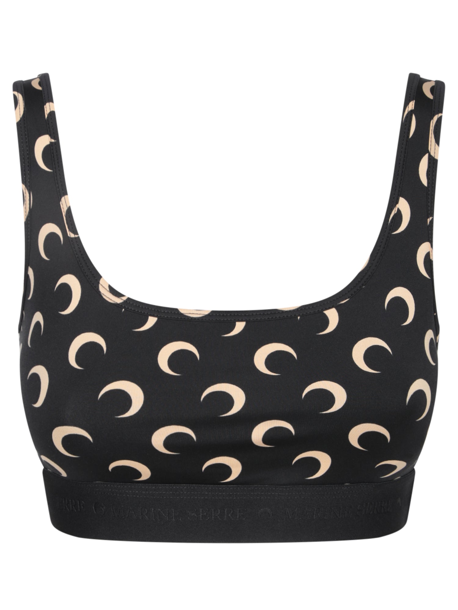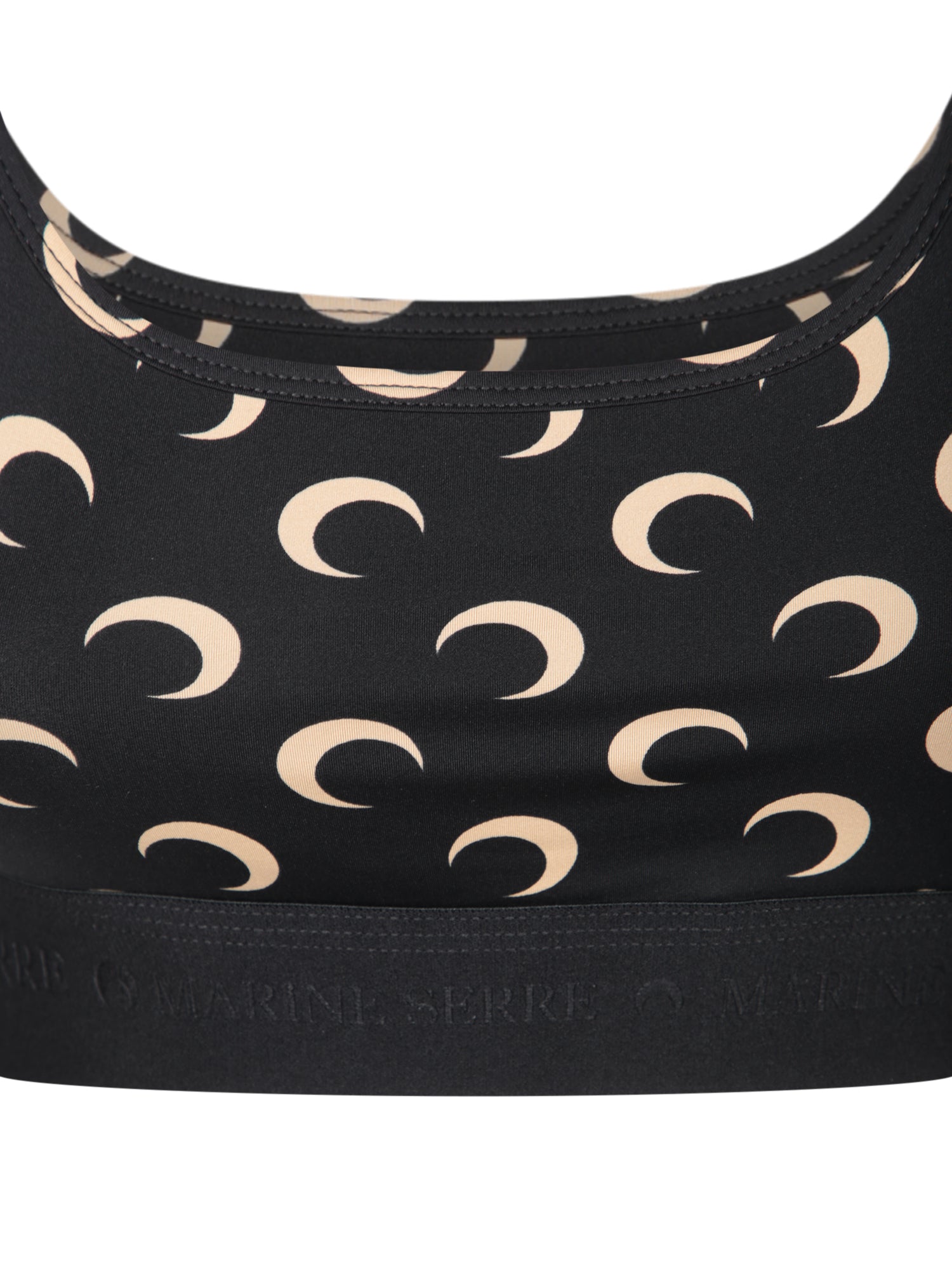 Crescent moon print sports bra. Elastic underband with logo branding. Seamless sides.