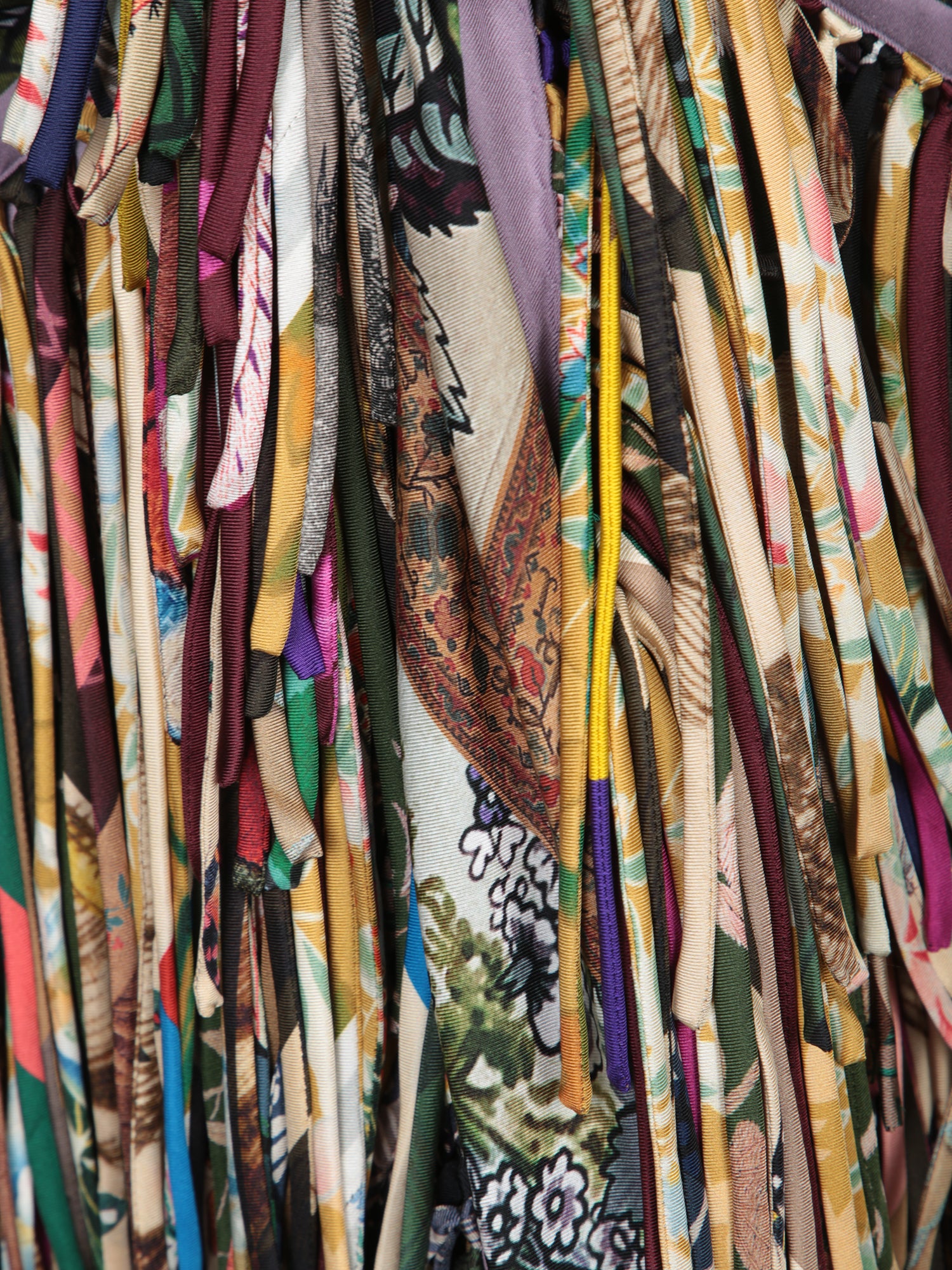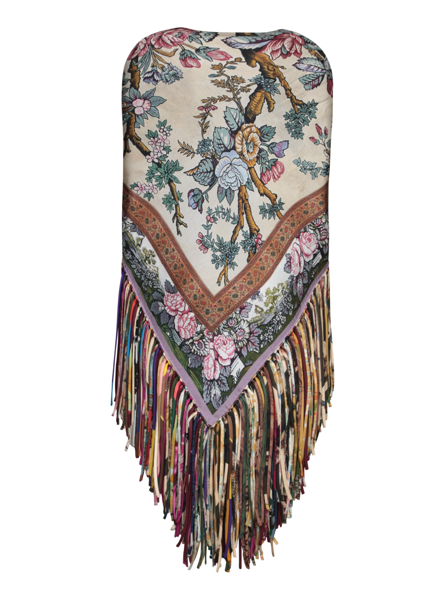 Square scarf in high-quality fabric with floral print and edges decorated with colorful fringes.