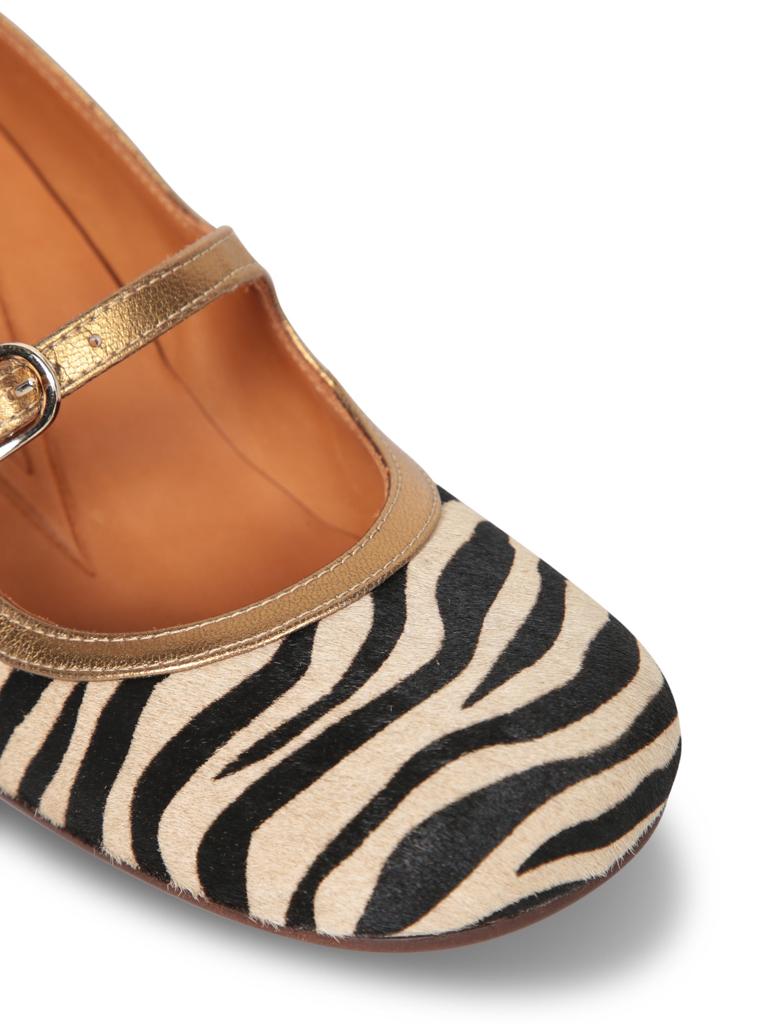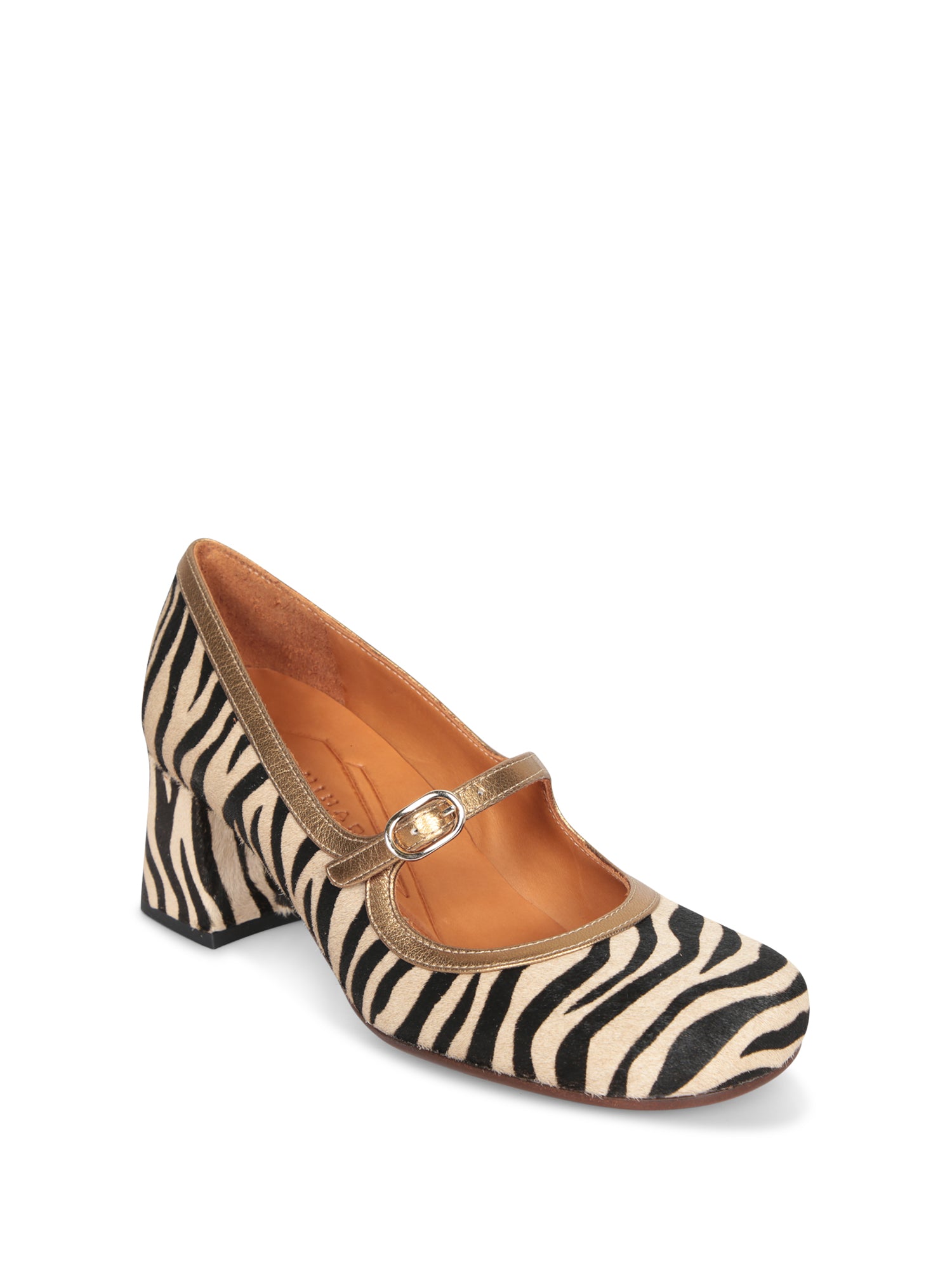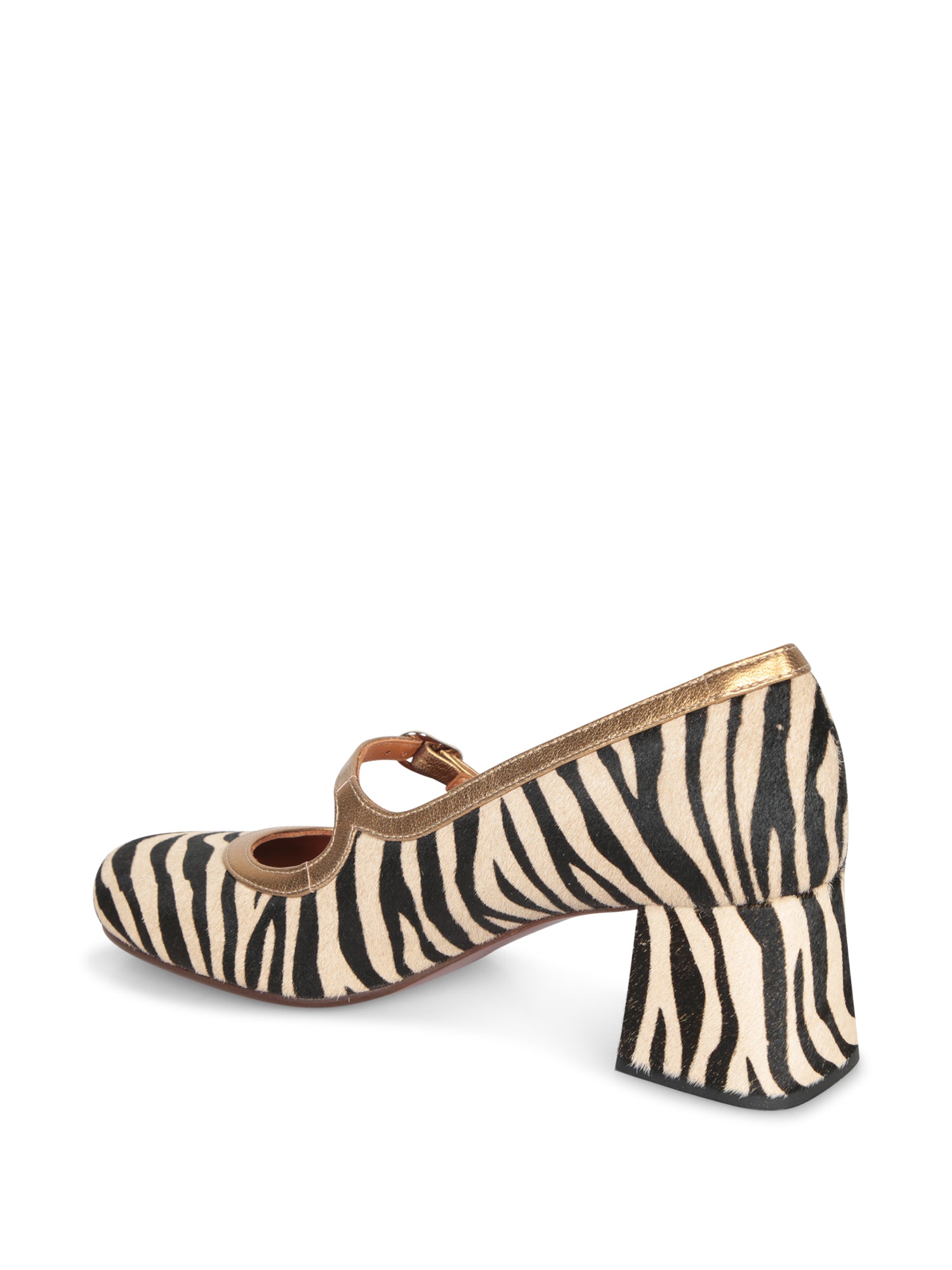 Pony hair upper with zebra print. Ankle strap with buckle. Solid block heel.