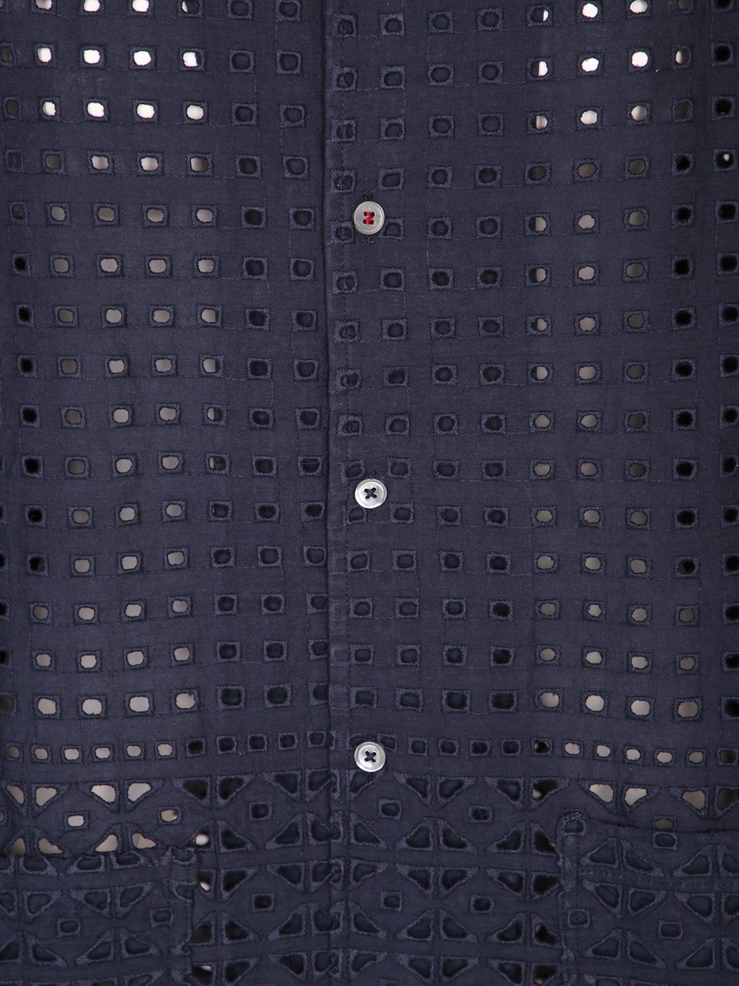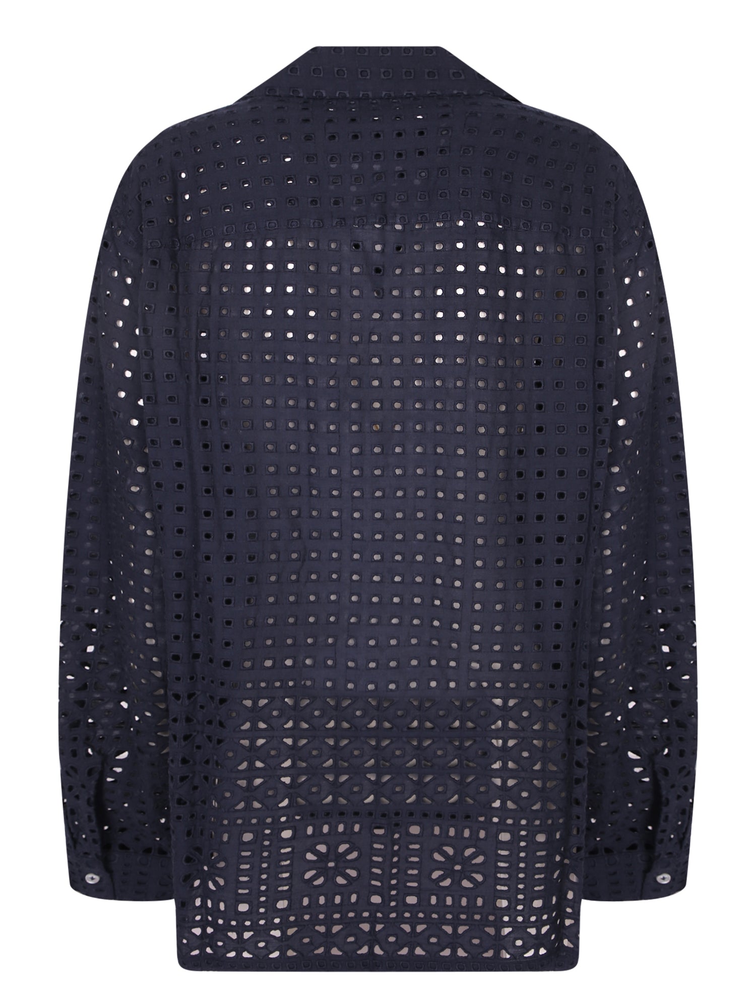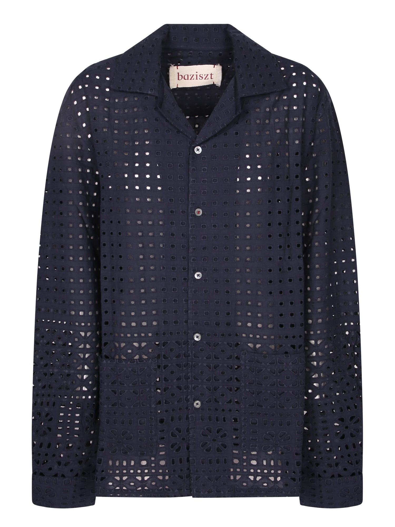 Long sleeve lace shirt. Classic collar and front button closure. Perforated floral pattern design.