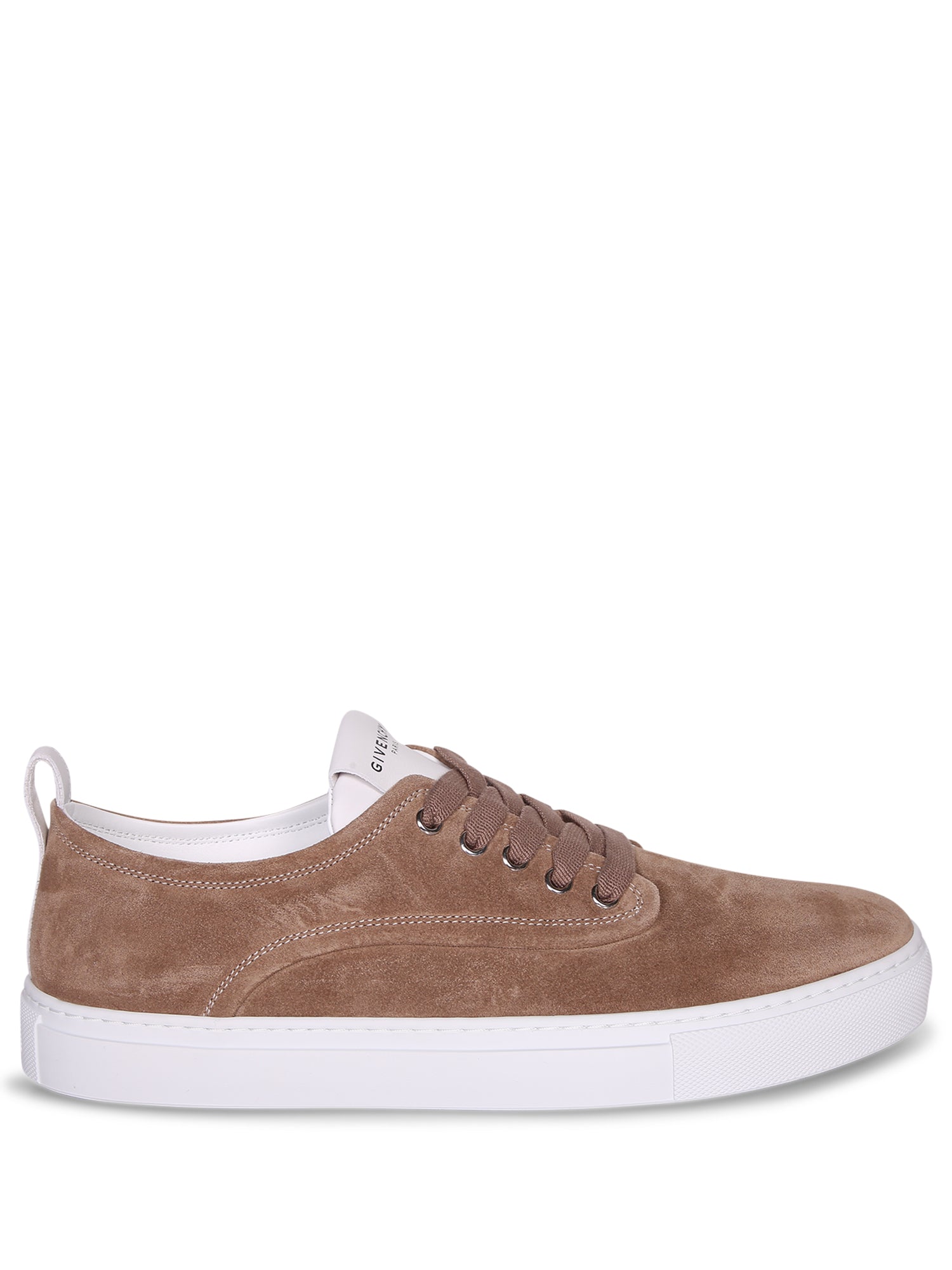 Beige suede upper. White rubber sole. Tonal lacing.