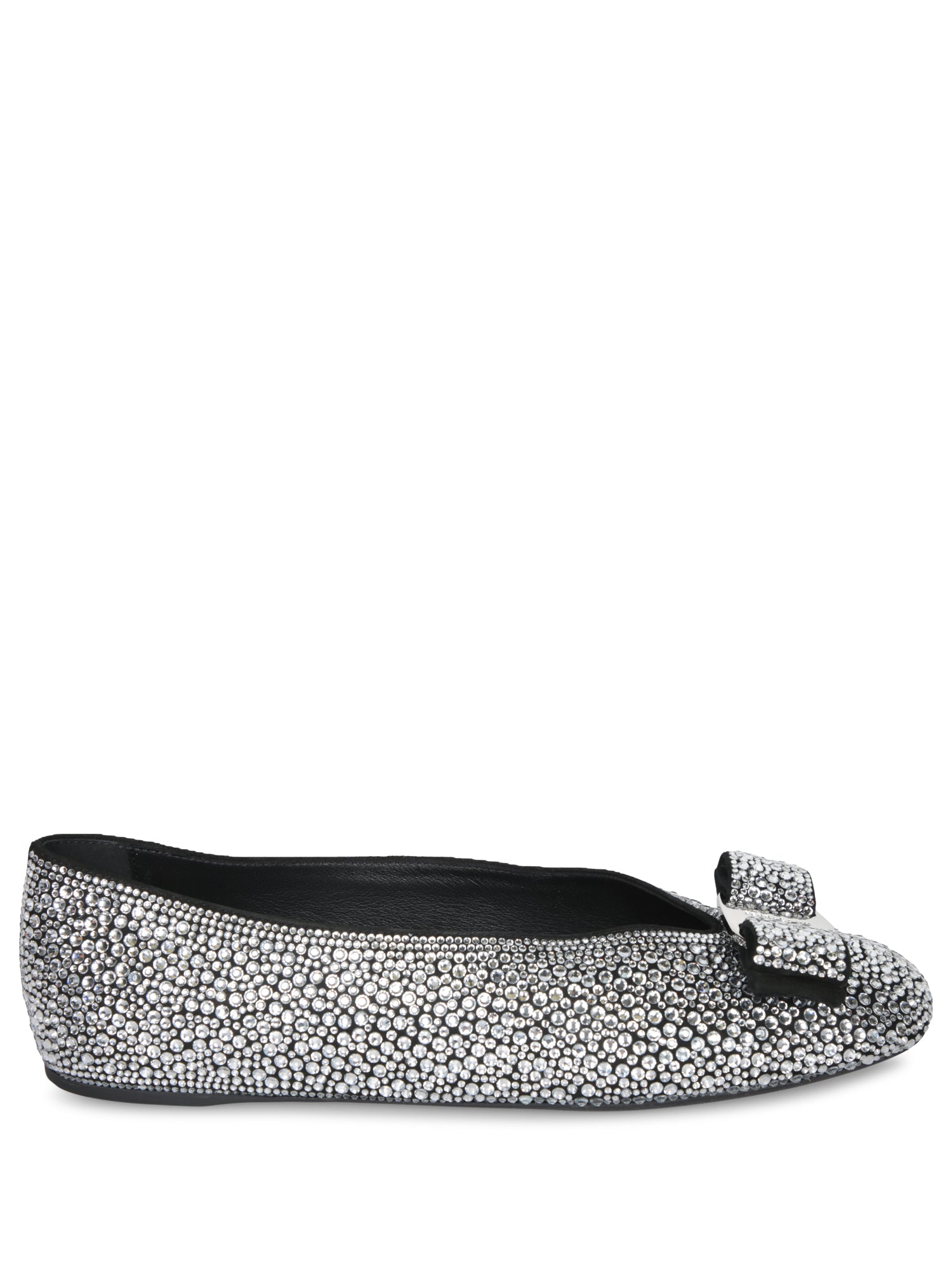 The New Vara Black Suede Ballerinas are adorned with myriad sparkling crystals, complemented by Ferragamo's distinctive bow and a metal logo plaque, making them a perfect addition to an elegant evening ensemble.