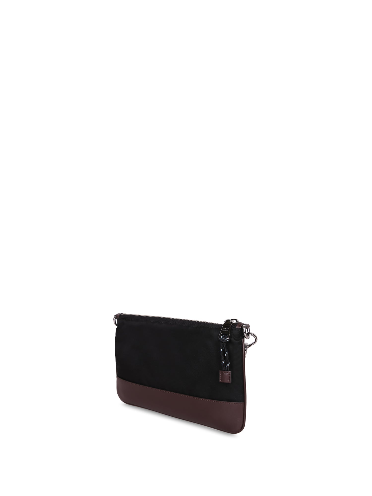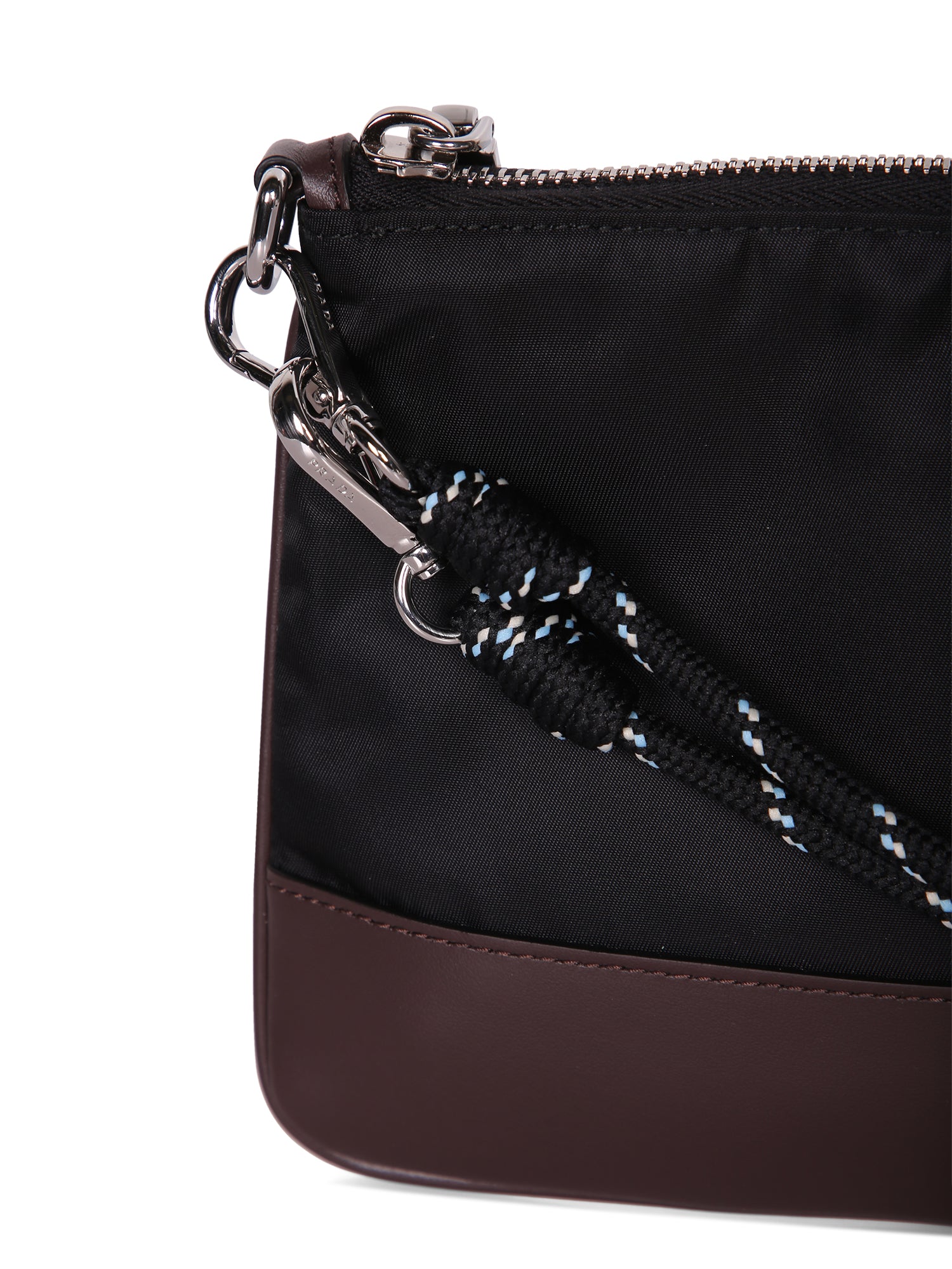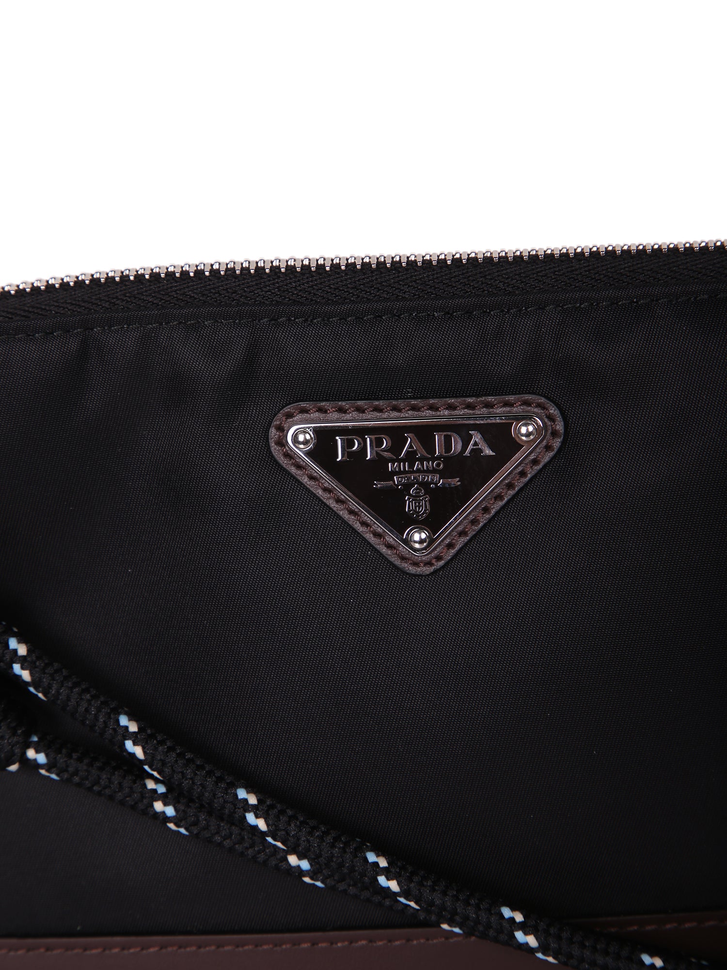 Adjustable woven shoulder strap. Top zip closure. Metal triangle logo.