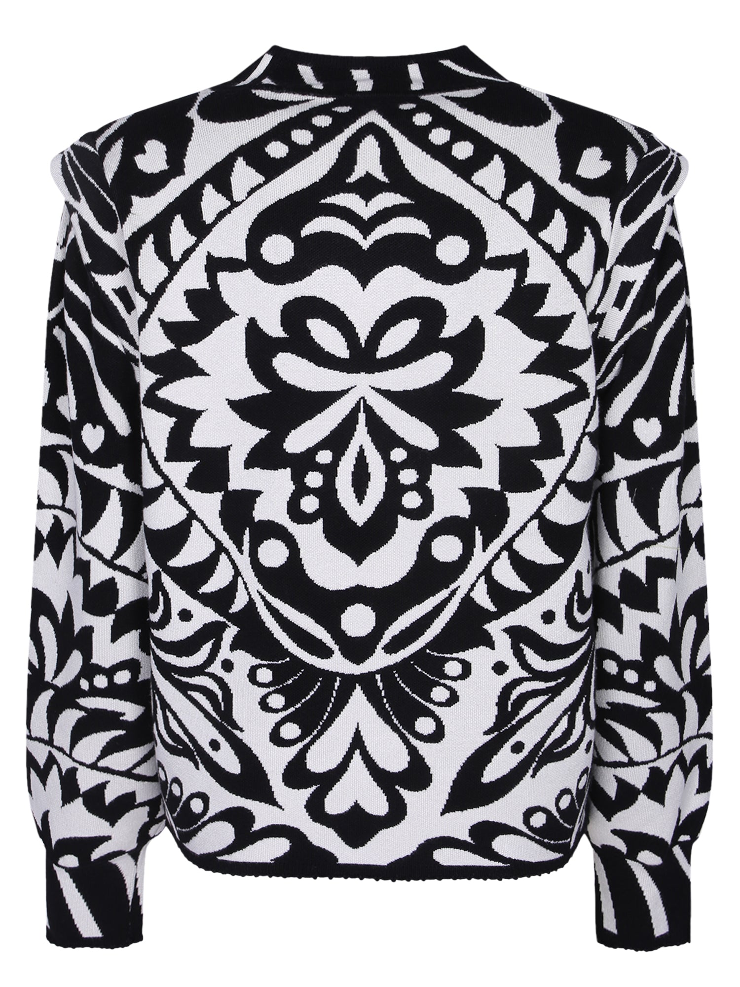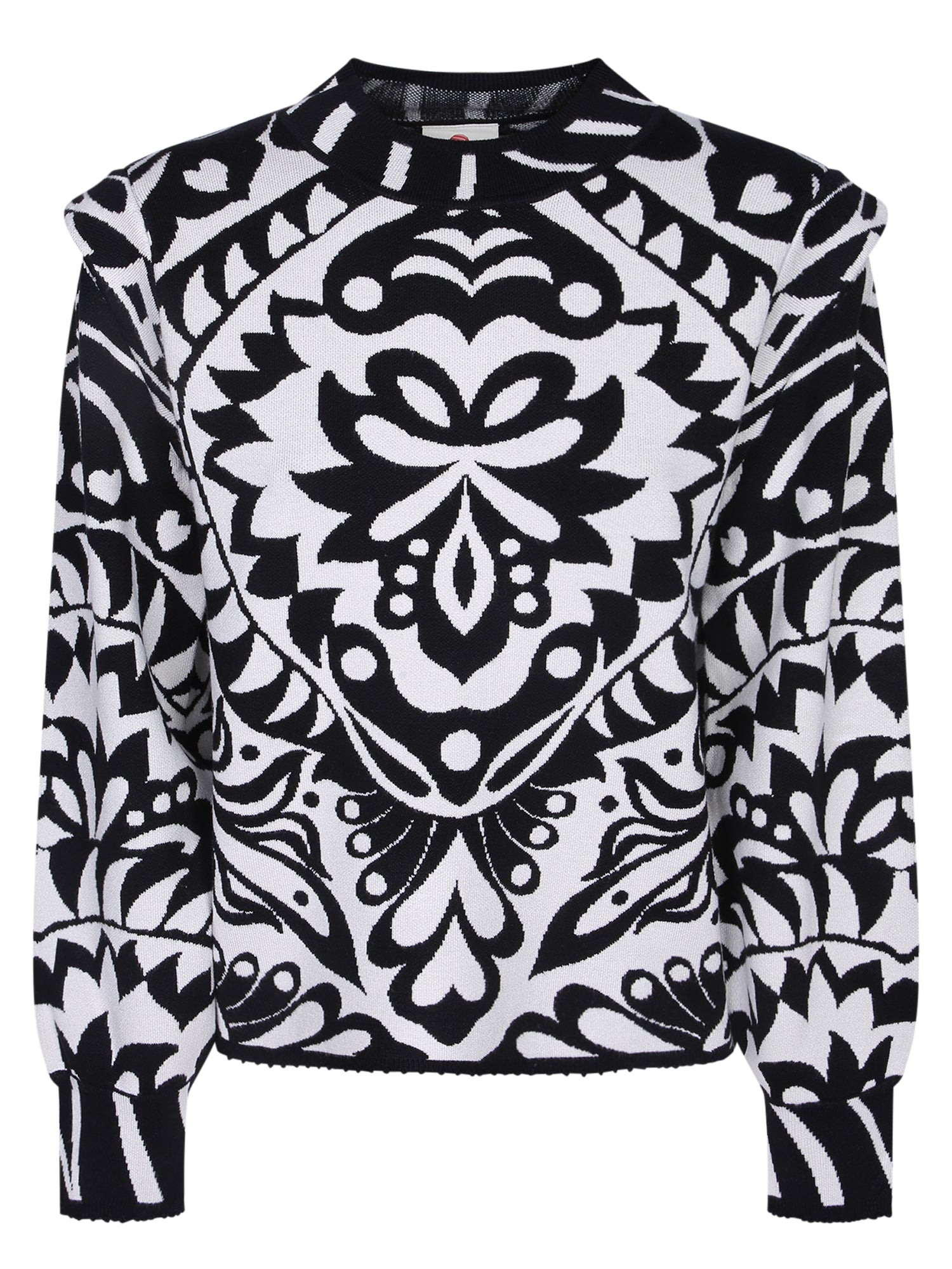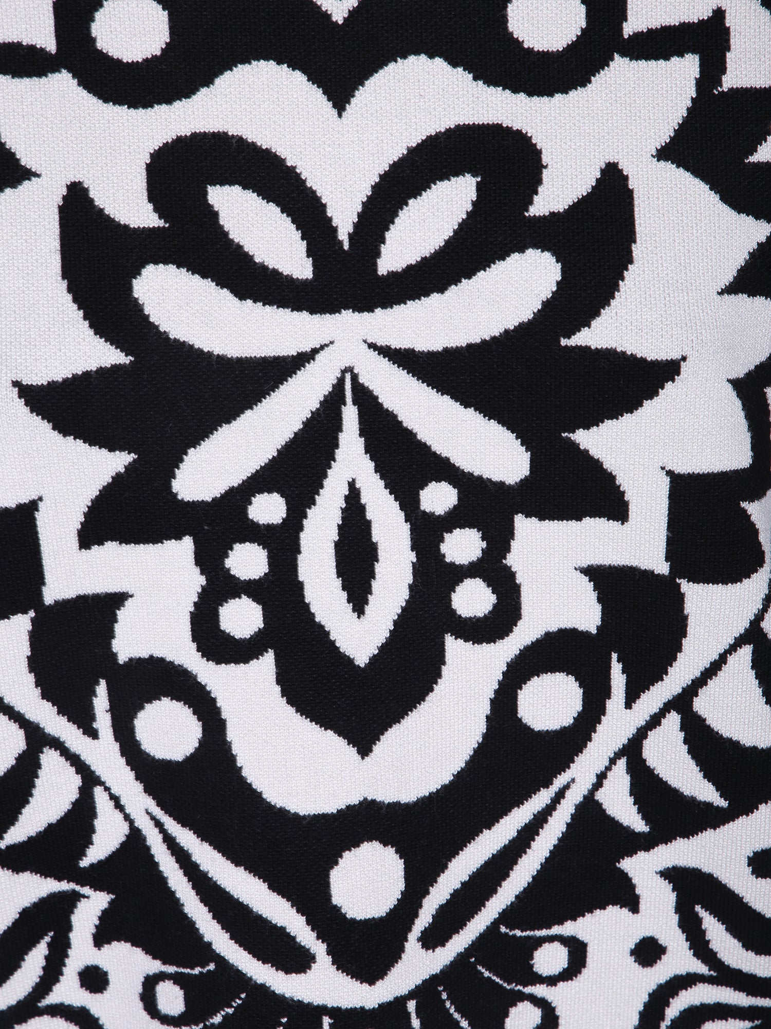 Long sleeve jacquard knit sweater. Black and white pineapple pattern. Crew neck.