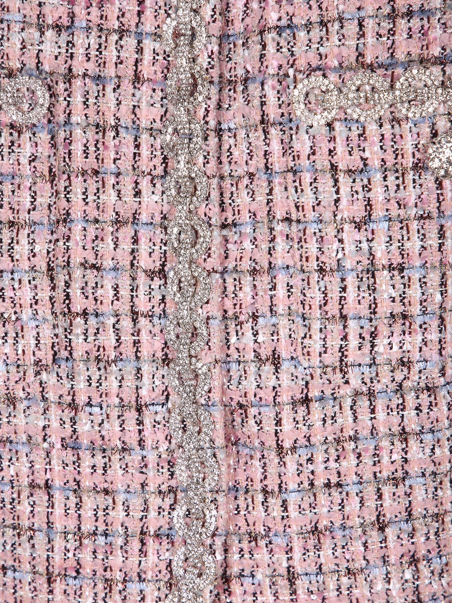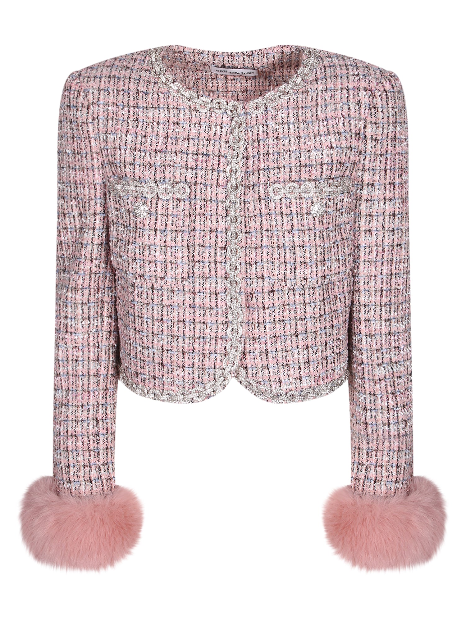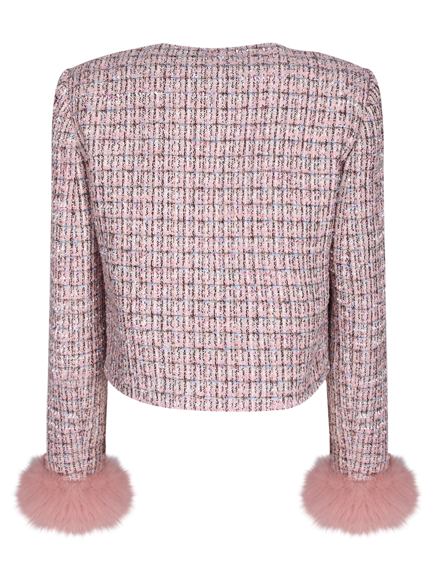 Handcrafted bouclé jacket. Synthetic fur cuffs. Silk inner lining.