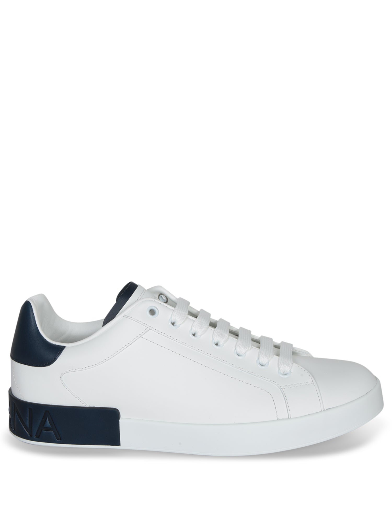 An icon of casual style, these Dolce & Gabbana white leather sneakers feature navy blue details, a sturdy sole, and the distinctive logo on the back, ideal for a distinguished everyday look.