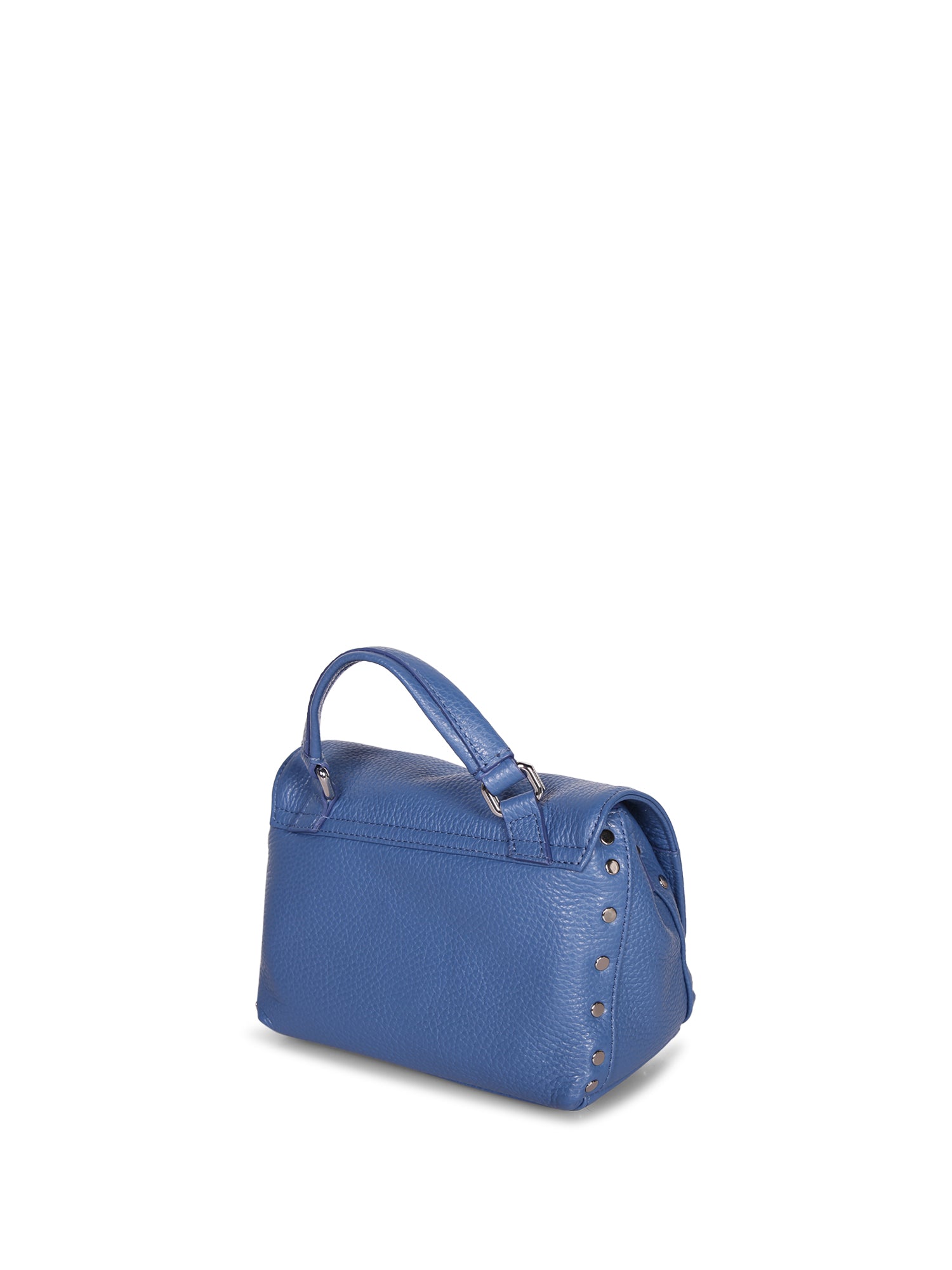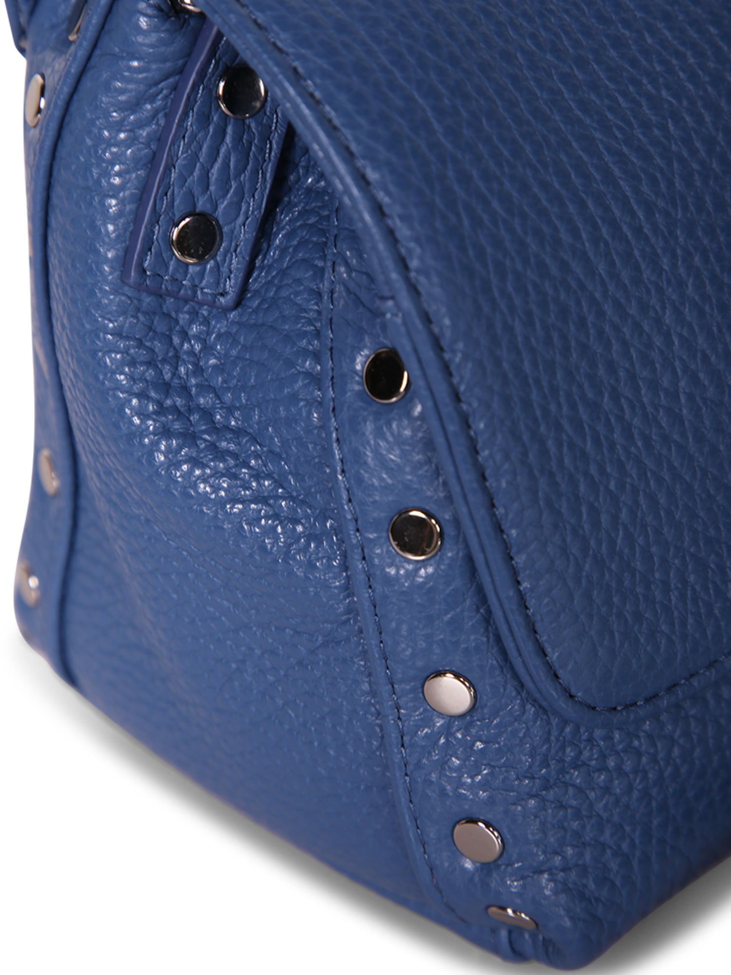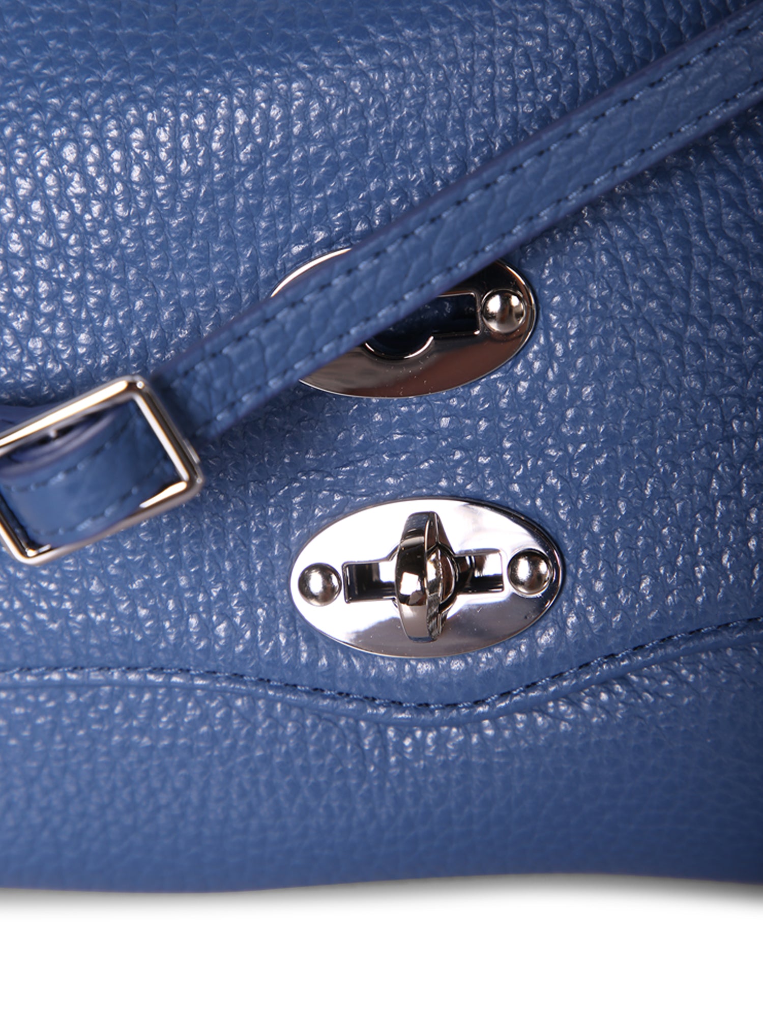 Structured leather. Adjustable and removable shoulder strap. Snap closure with logo detail.