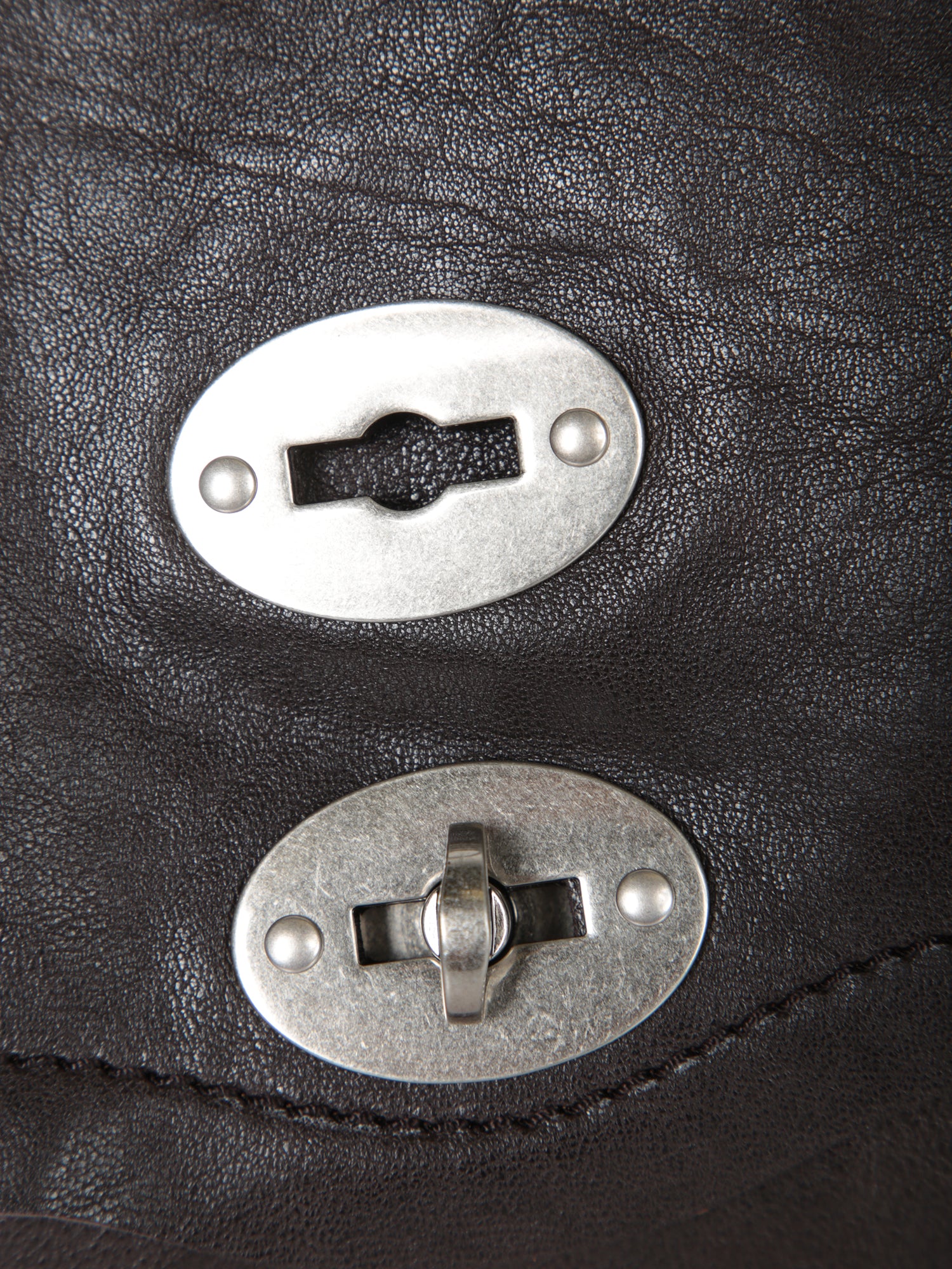 Leather bag with adjustable and removable shoulder strap. Front metal closure.
