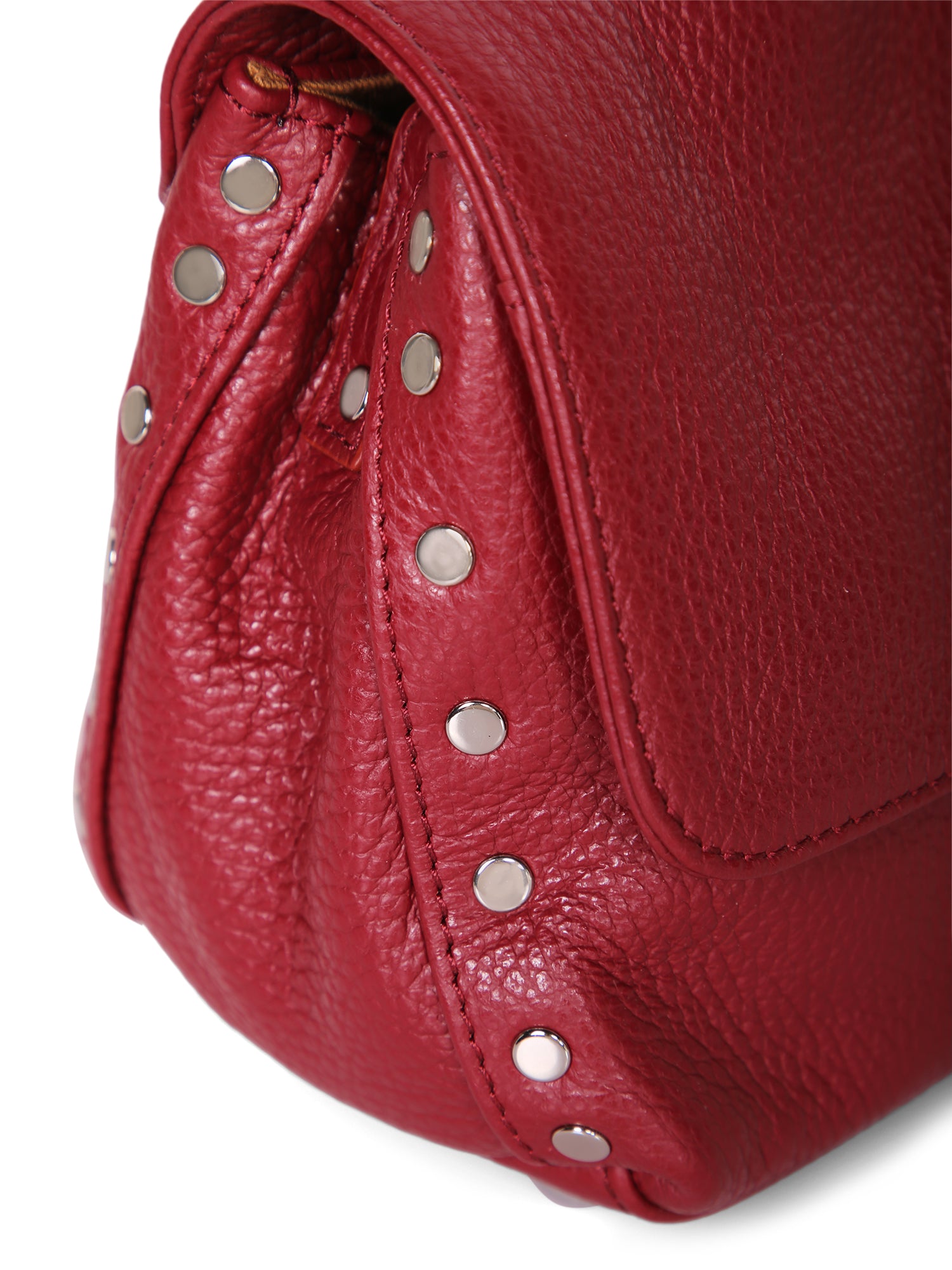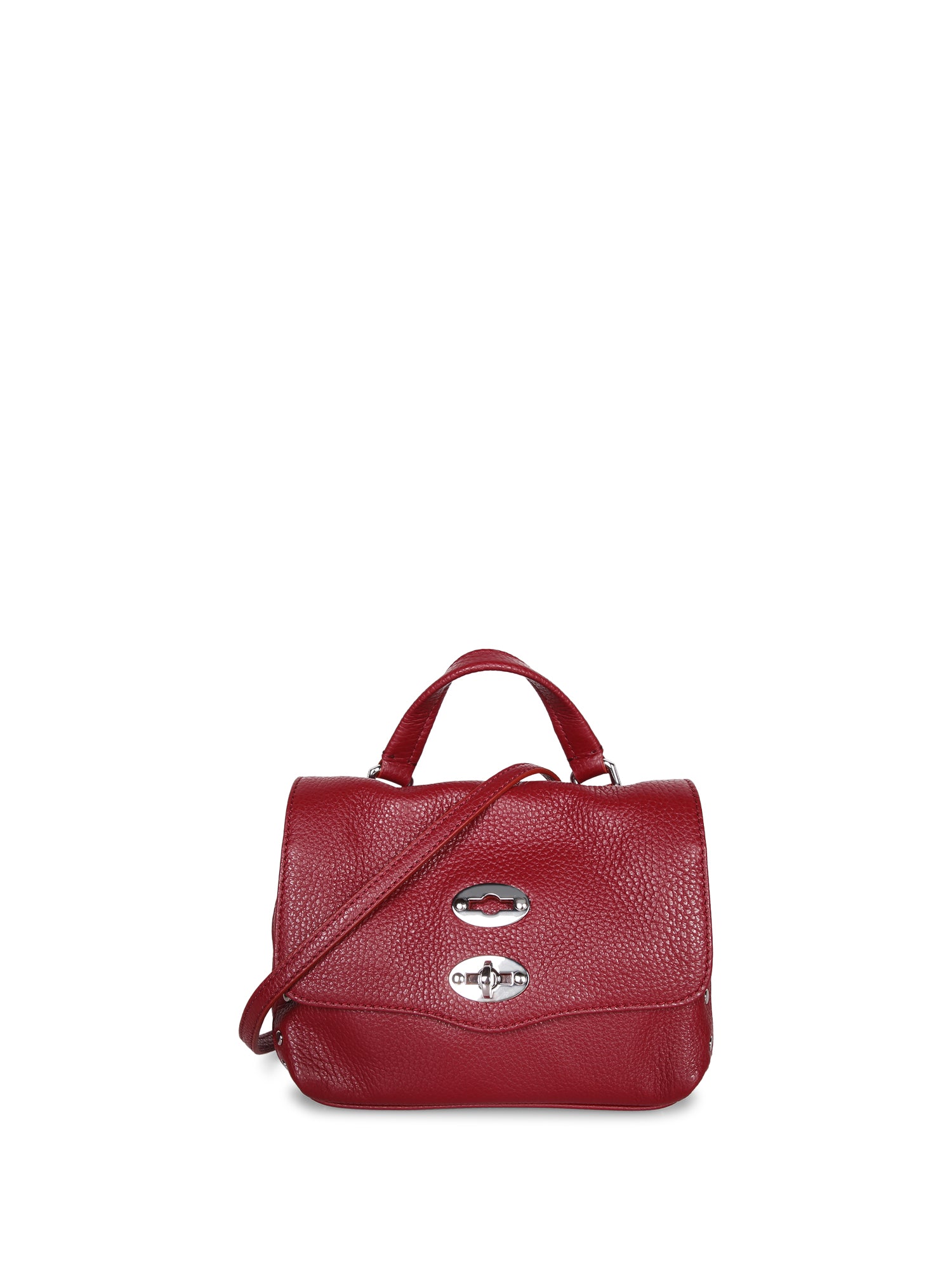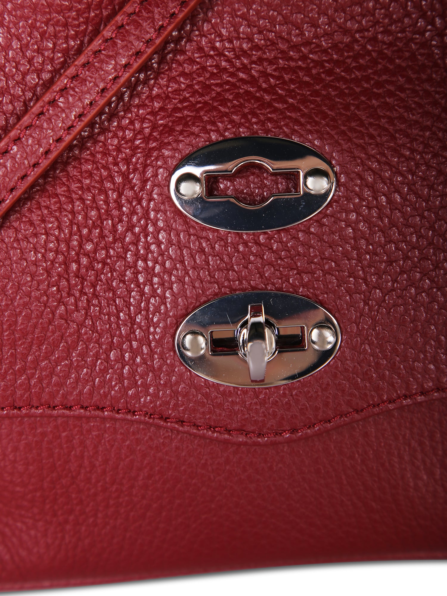 Grained leather. Swivel pin snap closure. Adjustable and removable shoulder strap.