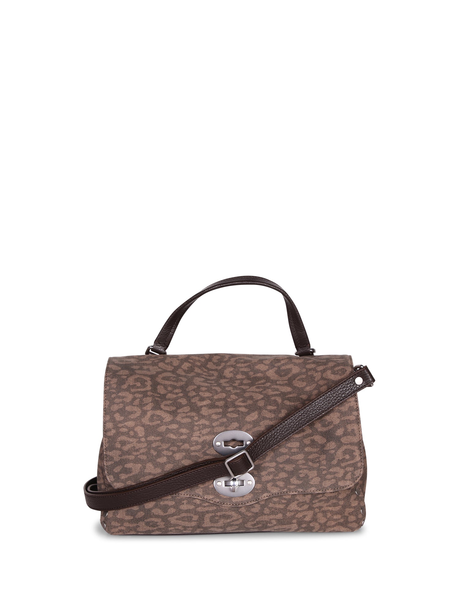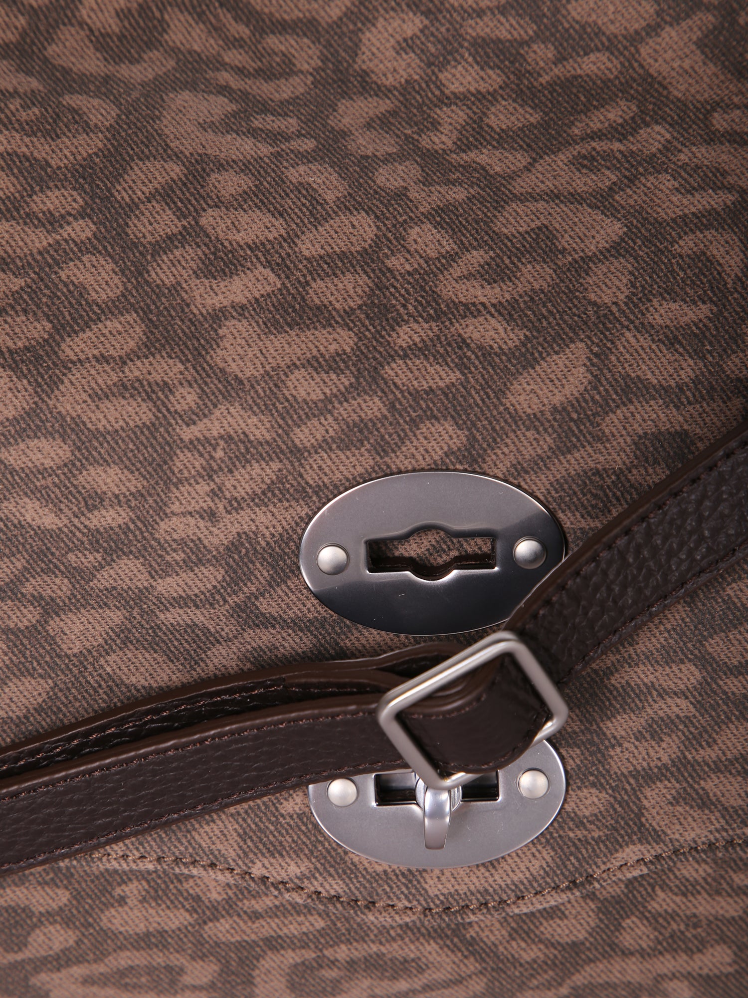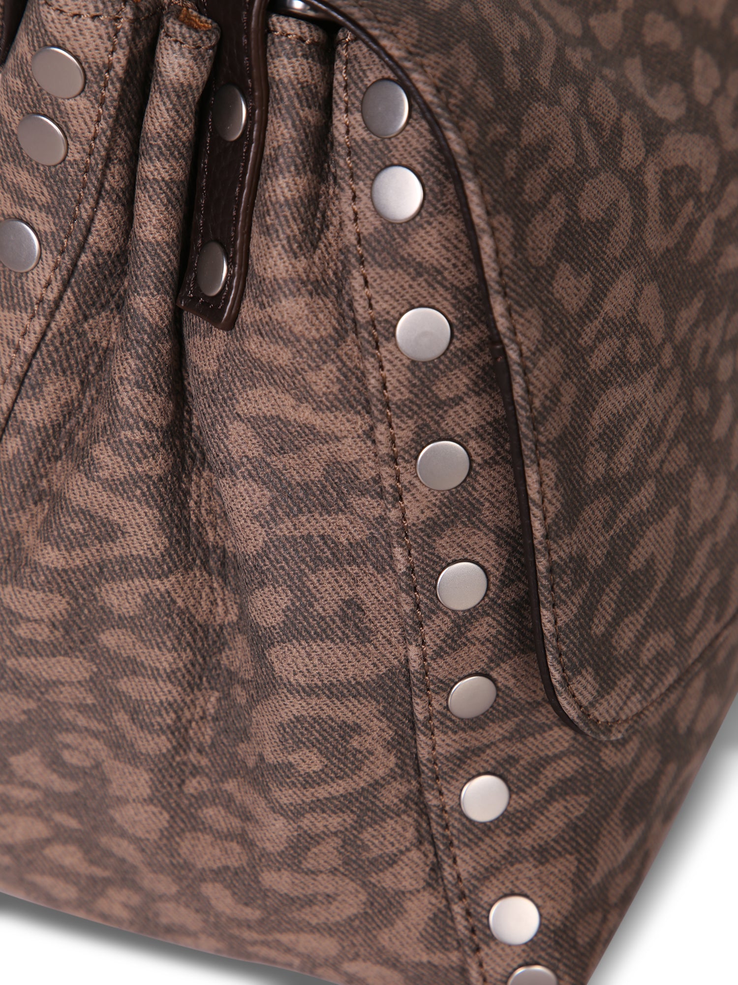 Jacquard fabric structure with logo pattern, leather handles, adjustable and removable shoulder strap, metal buckle closure.