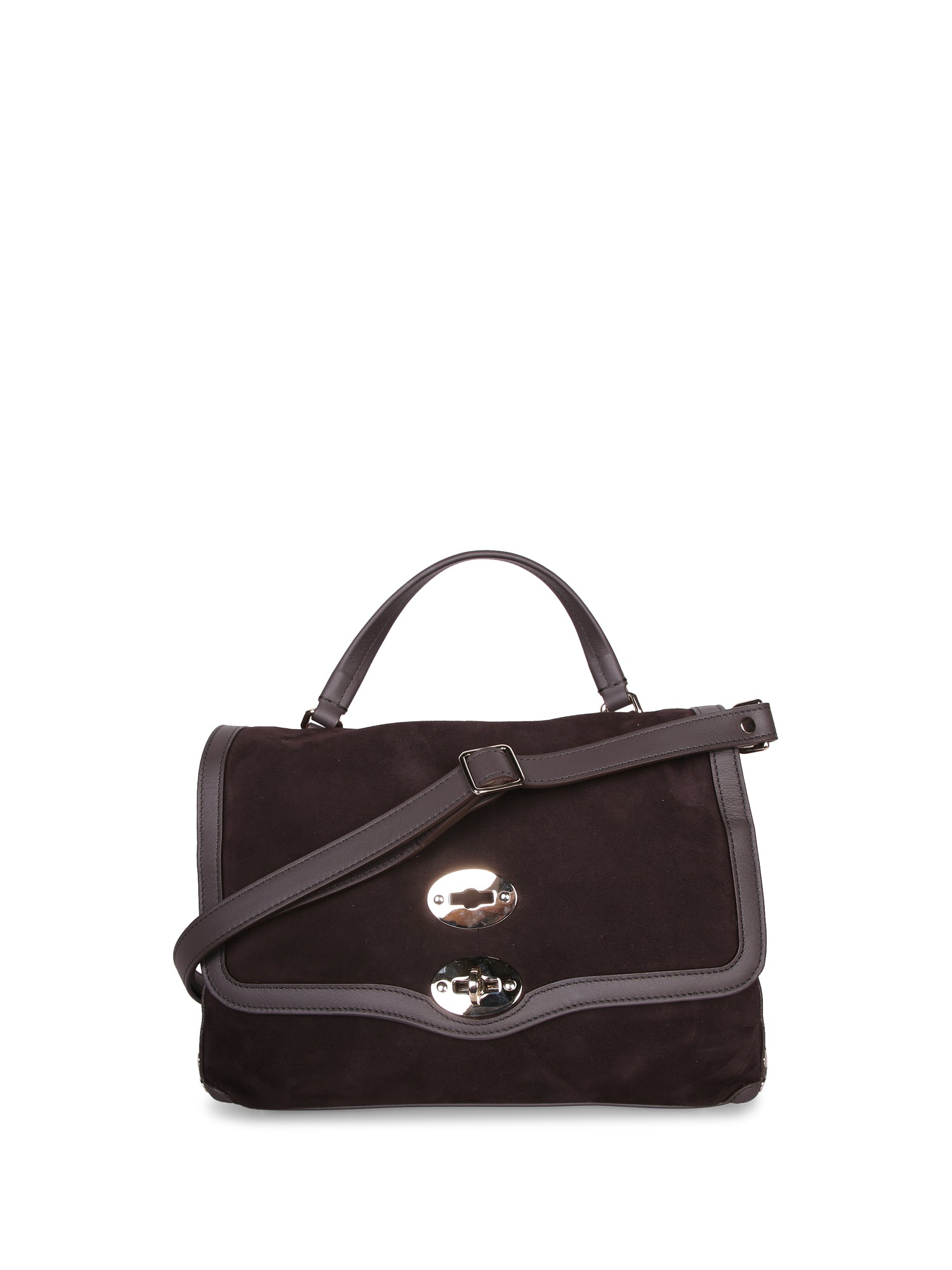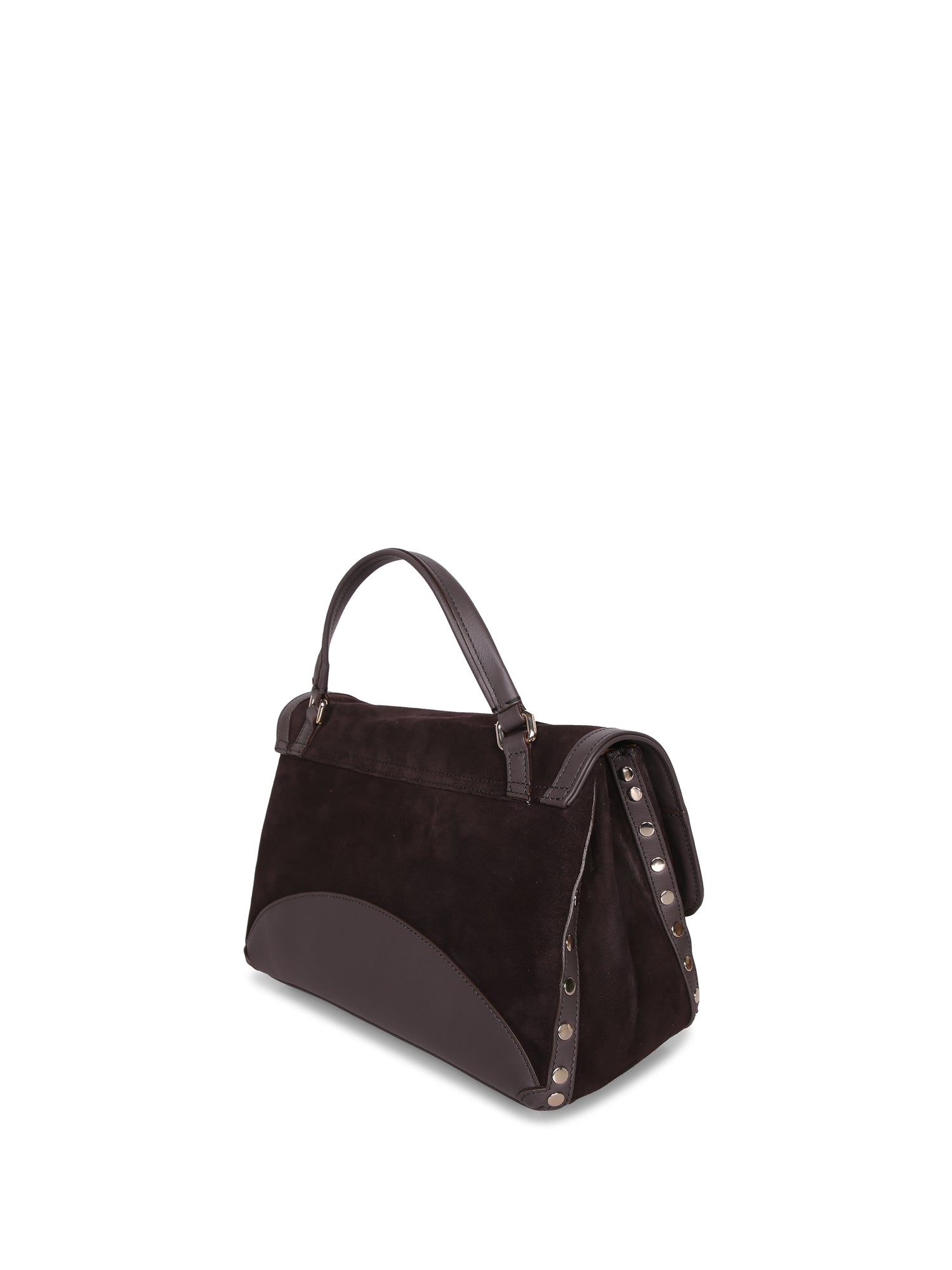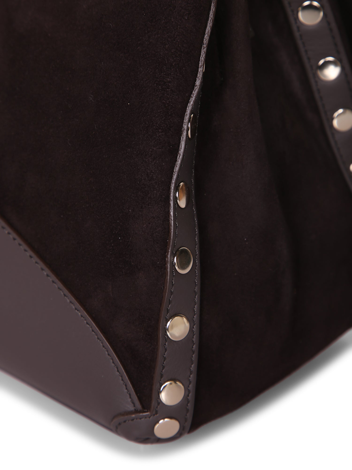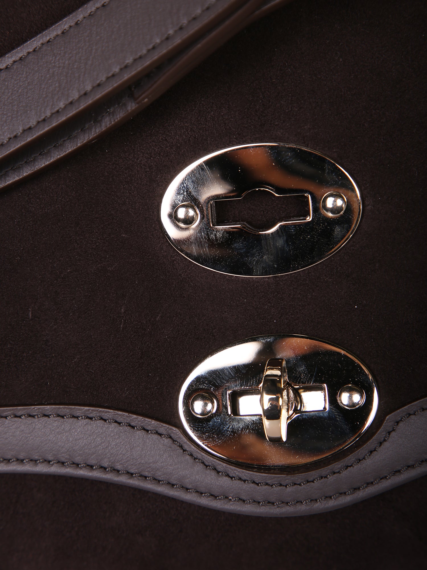 Suede bag with adjustable and removable shoulder strap. Iconic metallic front closure. Leather finishes.