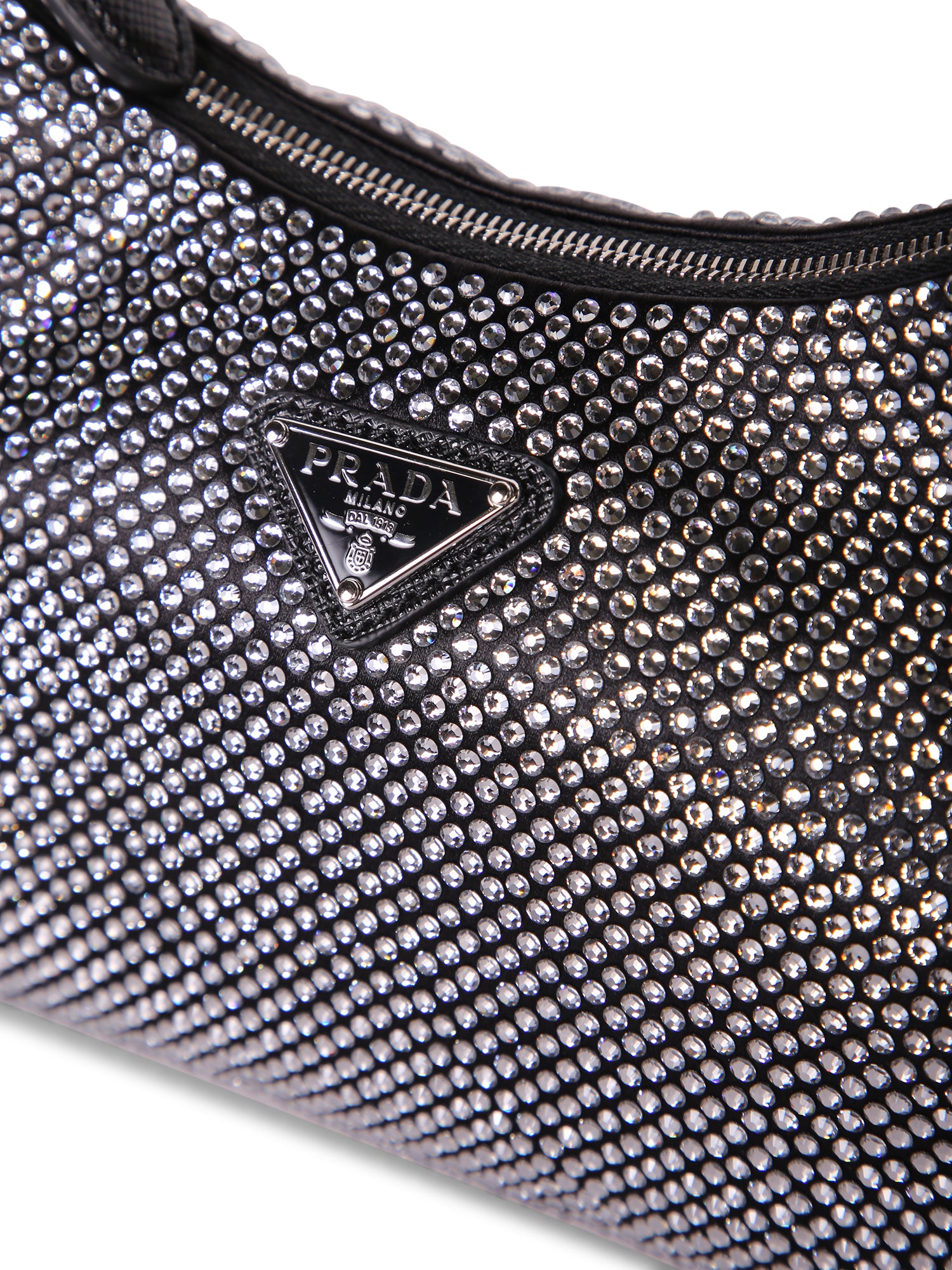 Shoulder bag covered in crystals. Silver color. Shiny metal details.