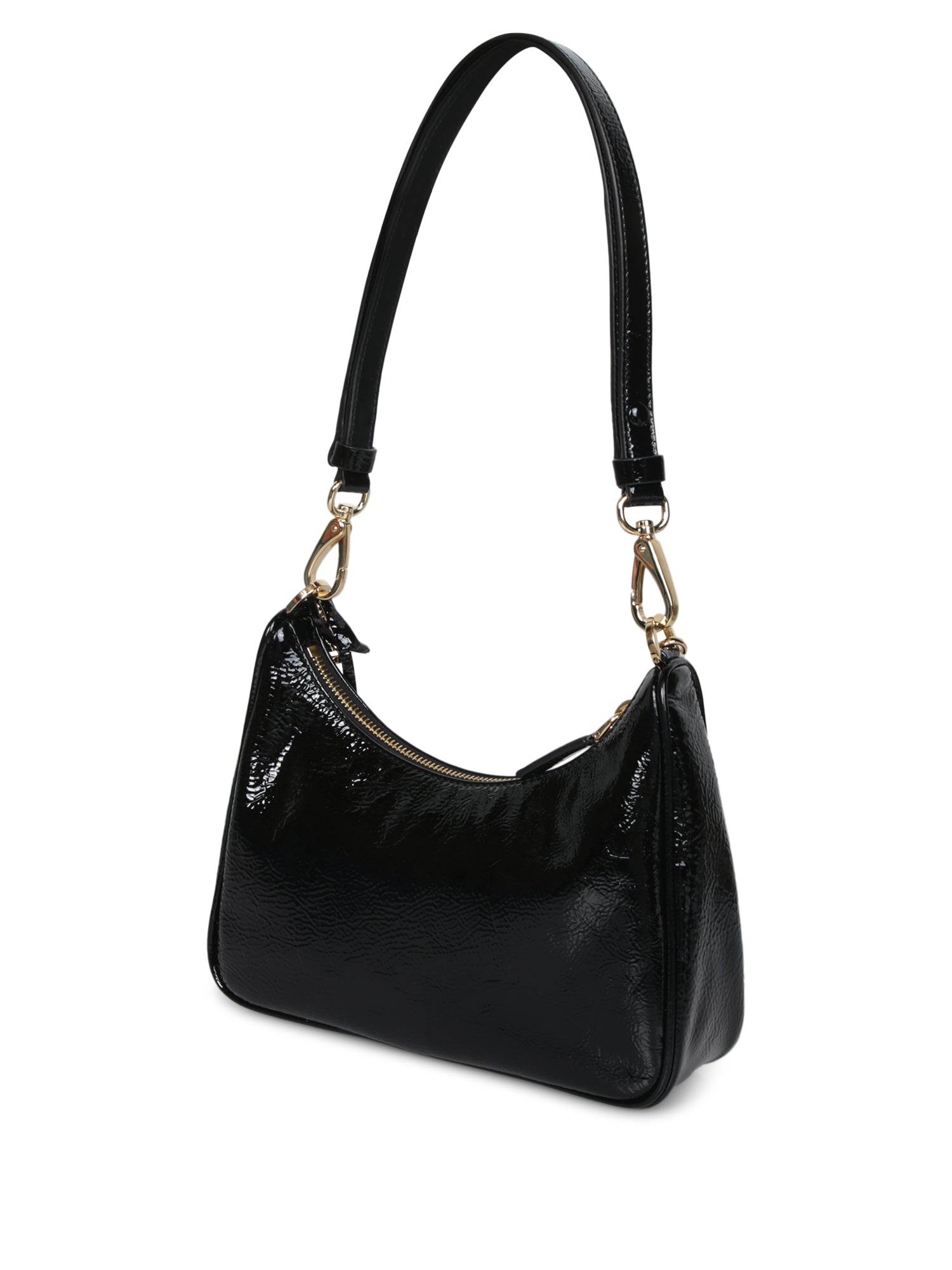Adjustable shoulder strap with golden chain details. Top zip closure. Glossy finish.