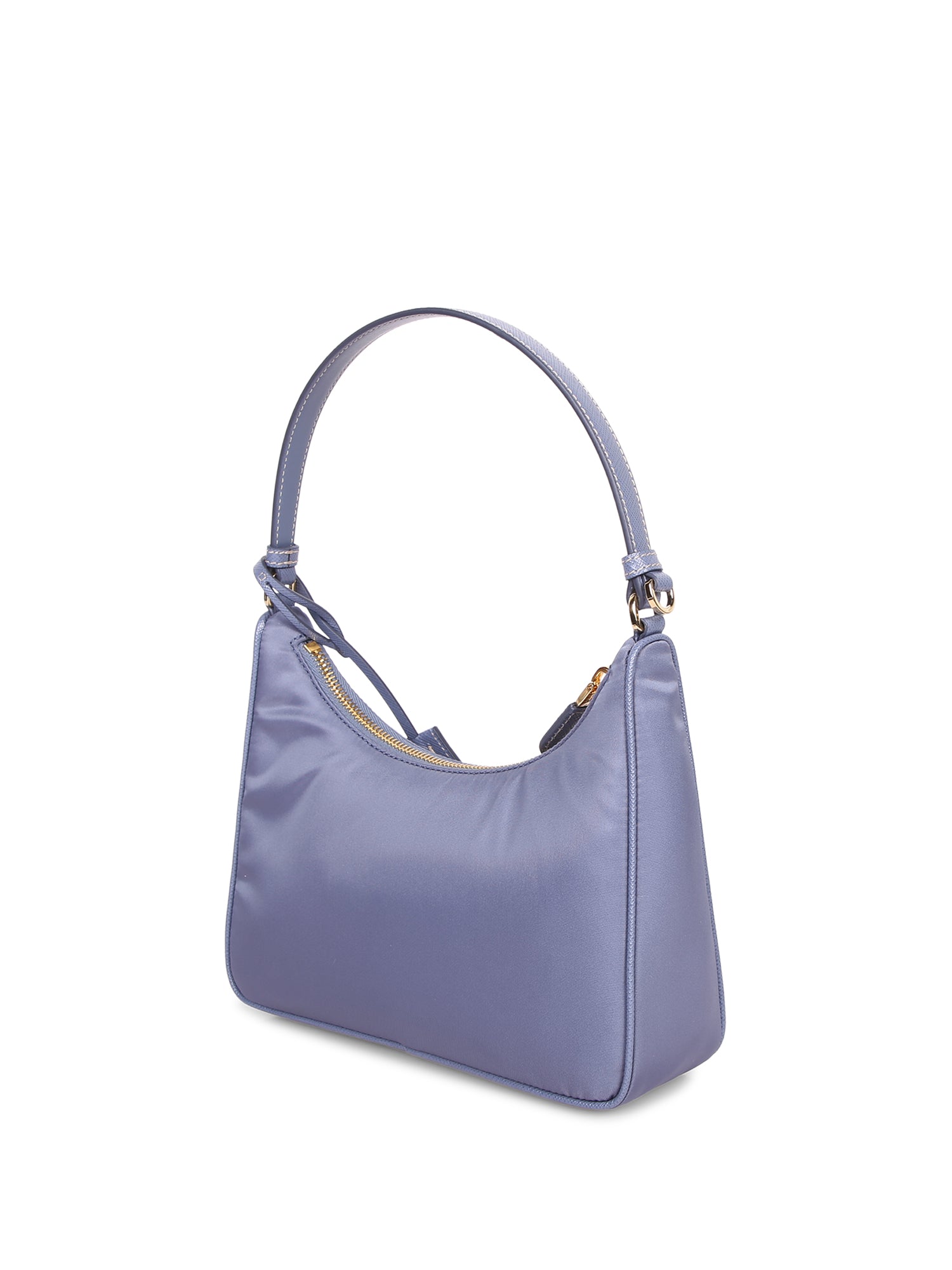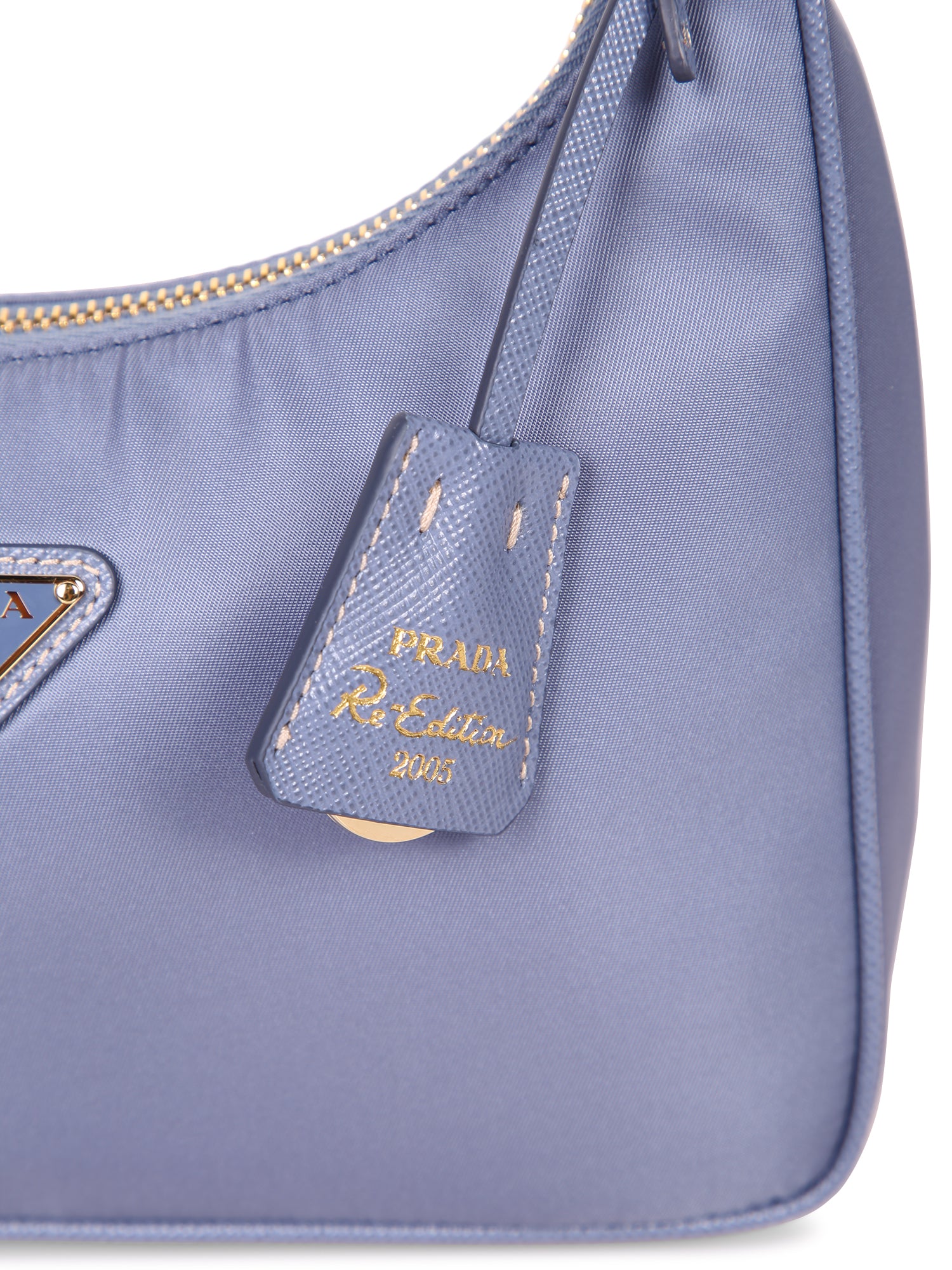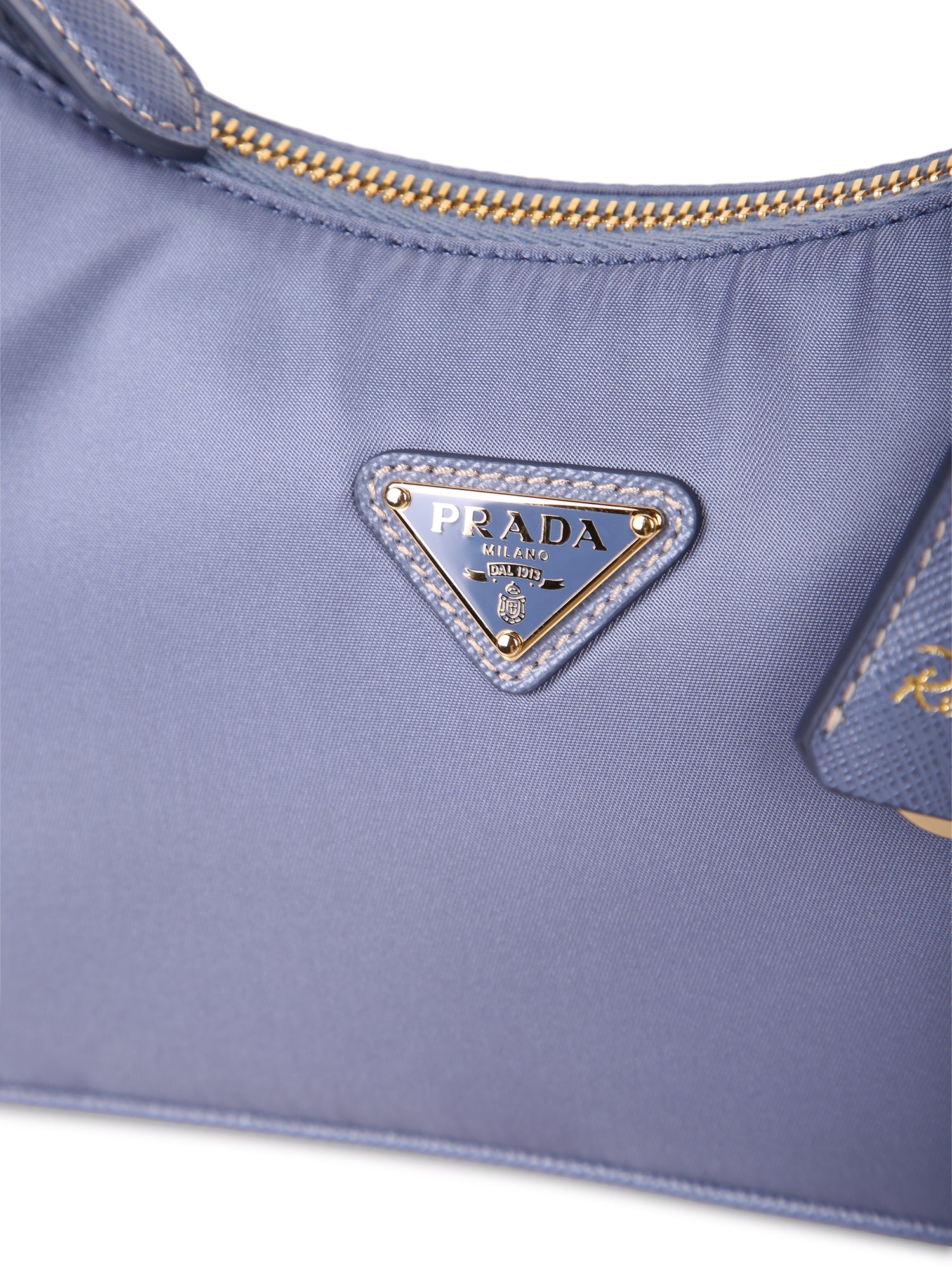 High-quality blue nylon. Saffiano leather finishes. Gold zip closure. Iconic brand details.