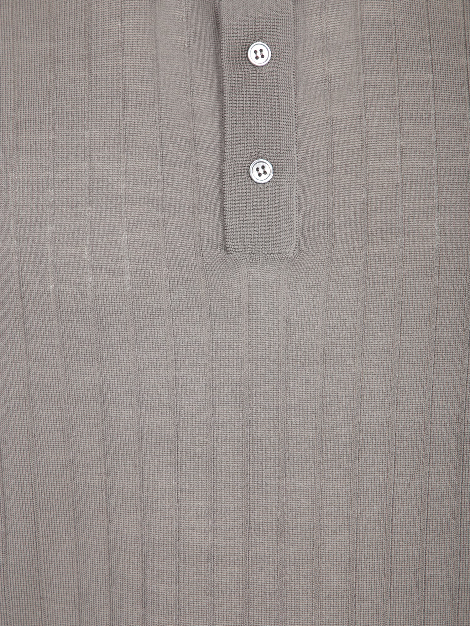 Long sleeve polo. Ribbed knit fabric. Classic collar with three-button placket.