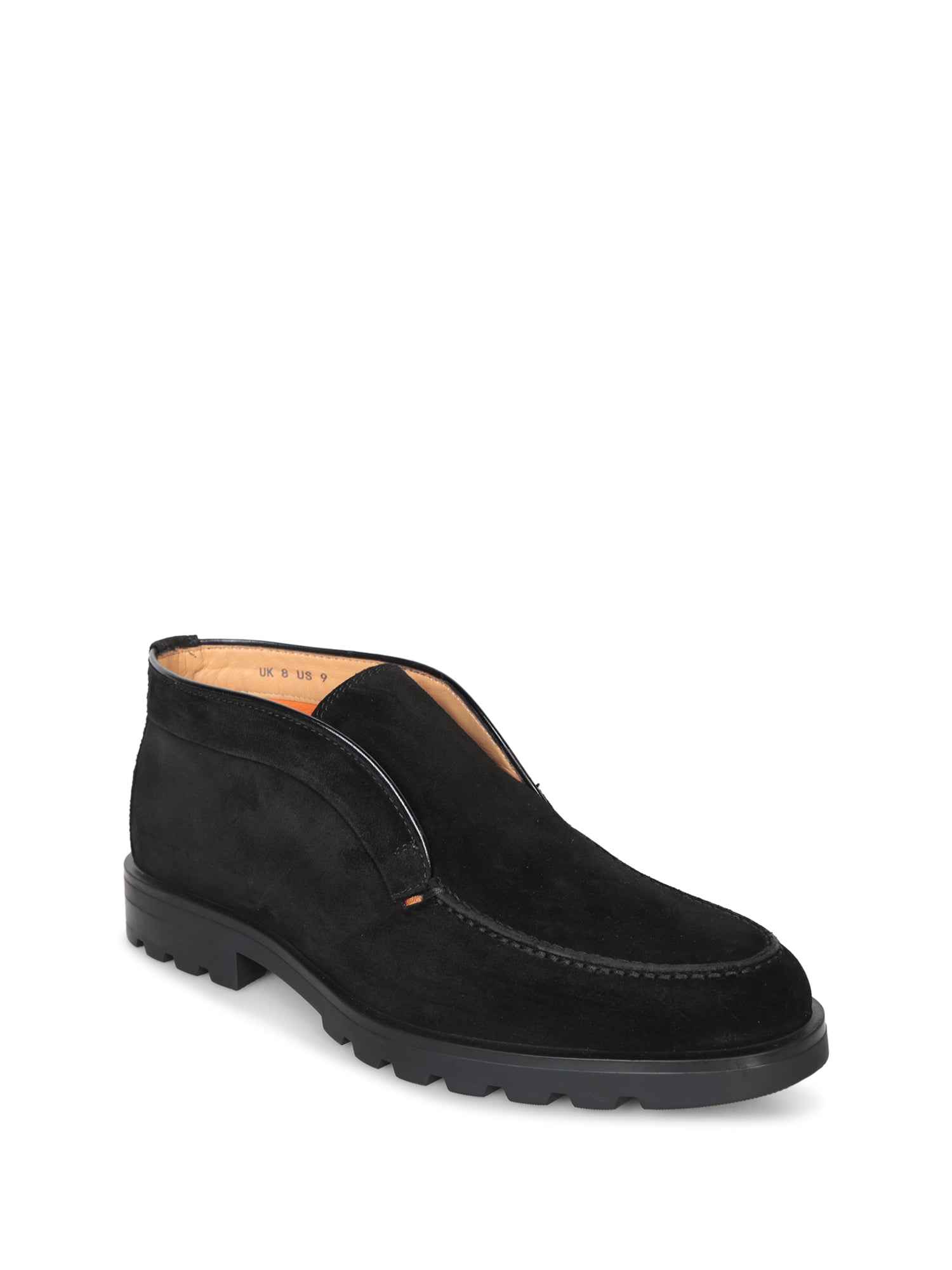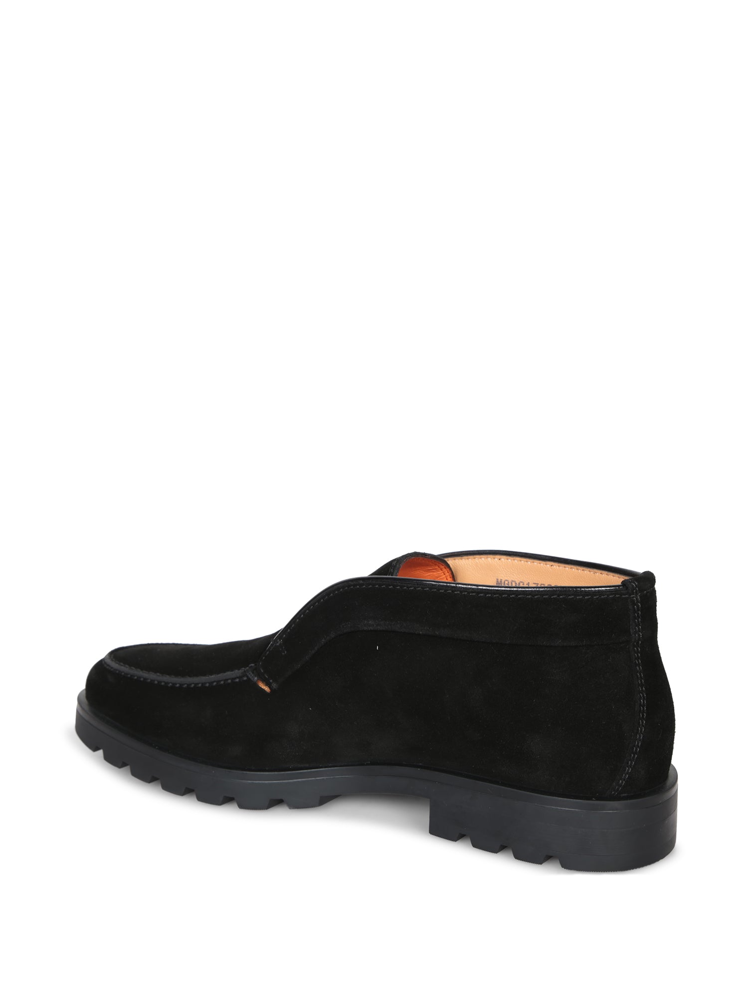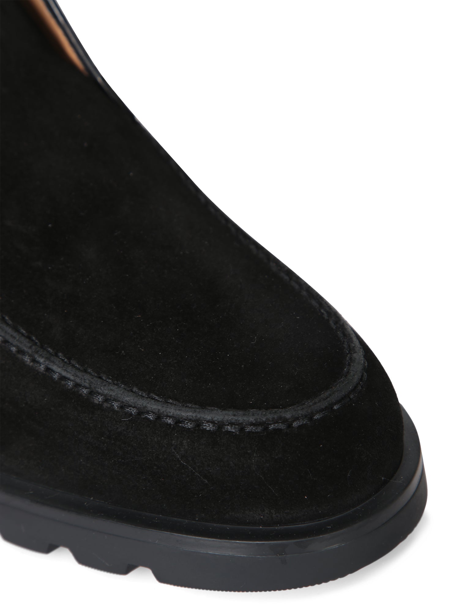 Black suede loafer. Grooved rubber sole. Slip-on design without laces.
