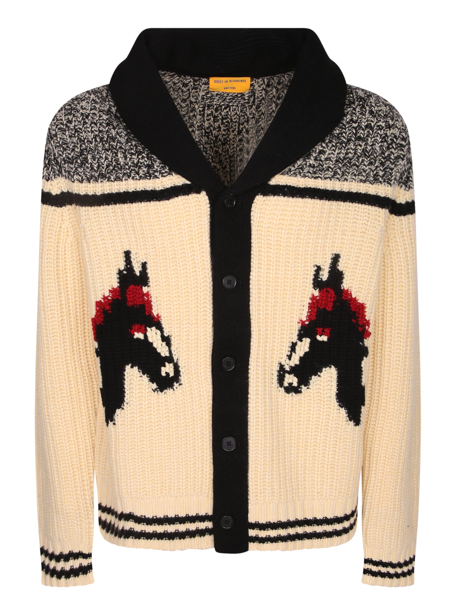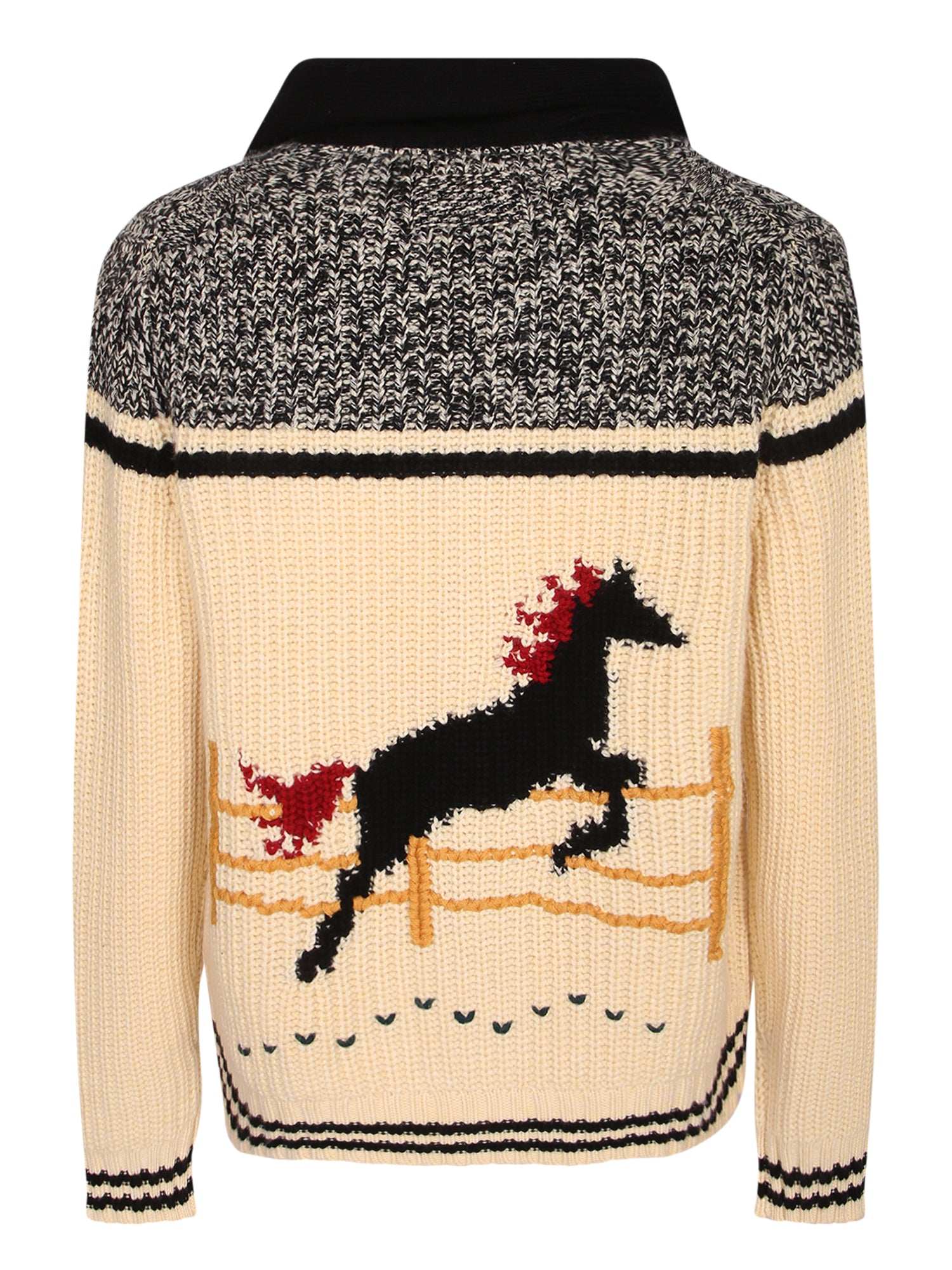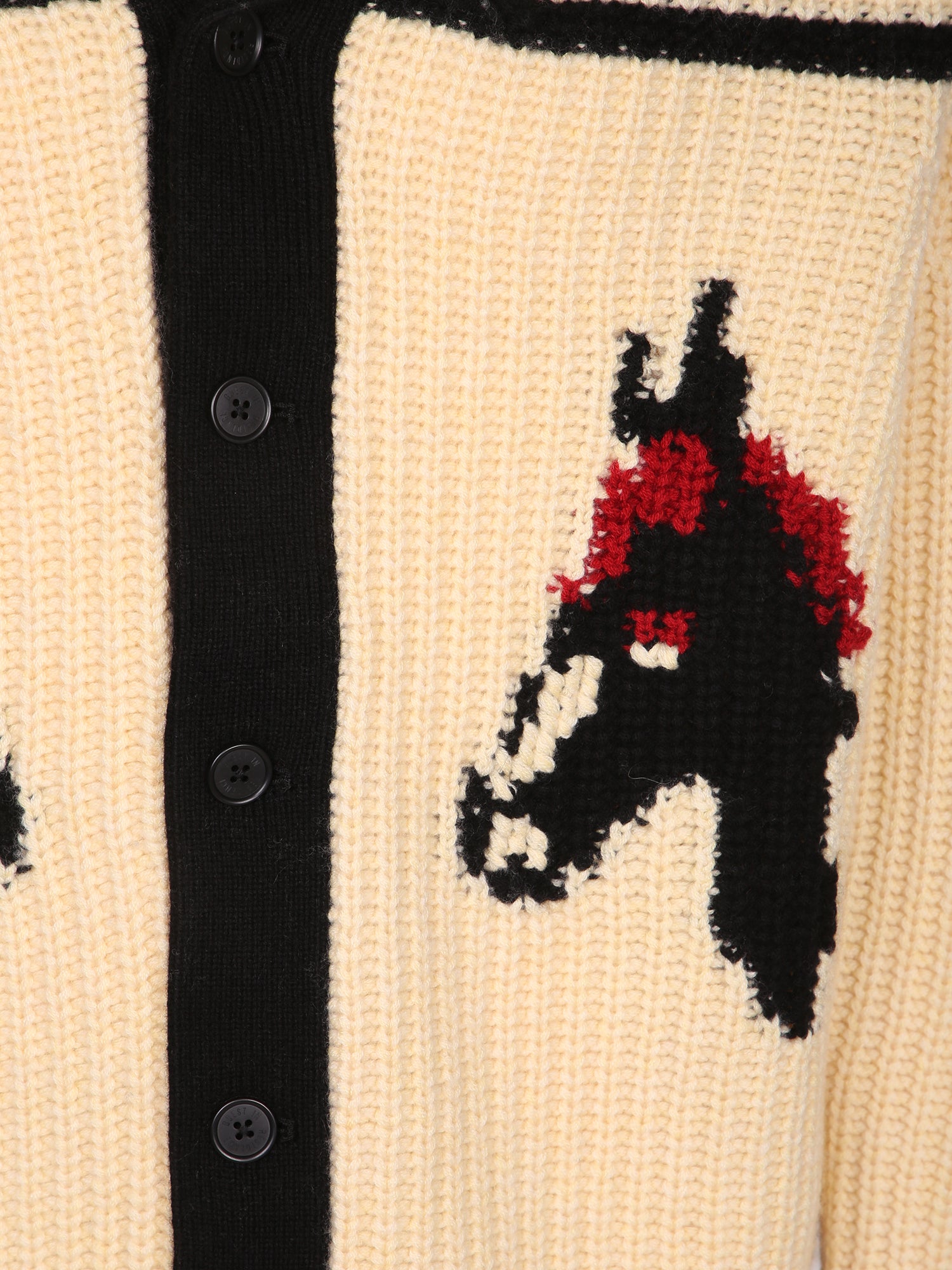 Long sleeves, front button closure, V-neck. Jacquard knit details.