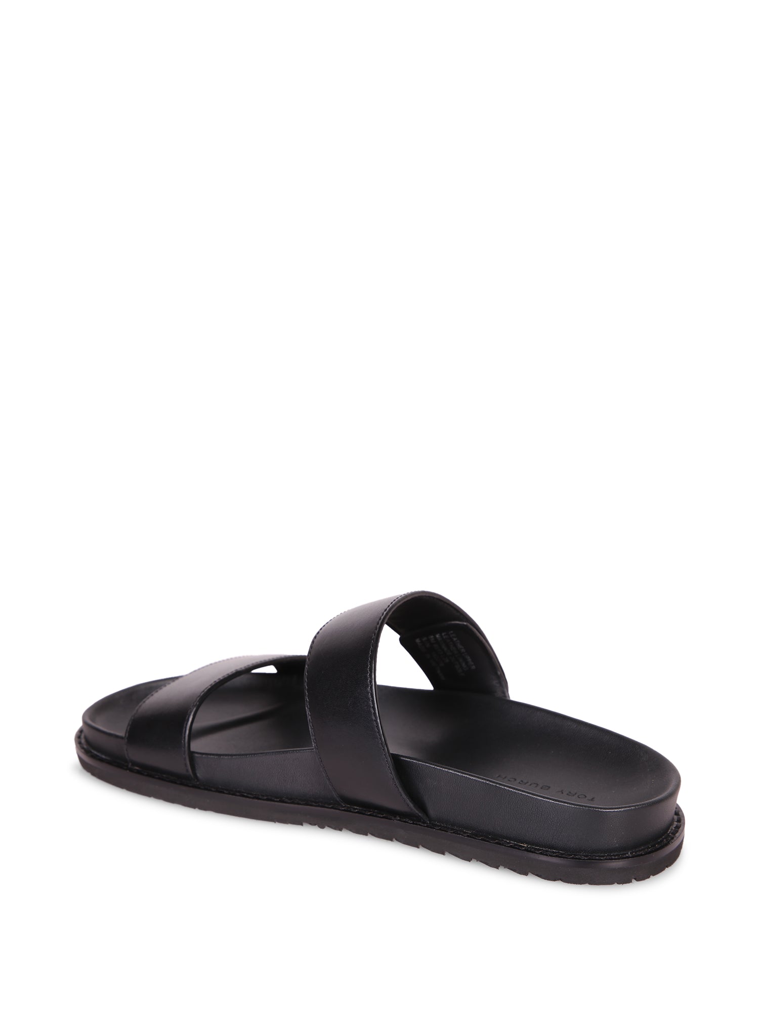 Black leather sandals. Two-strap design. Gold metallic logo.