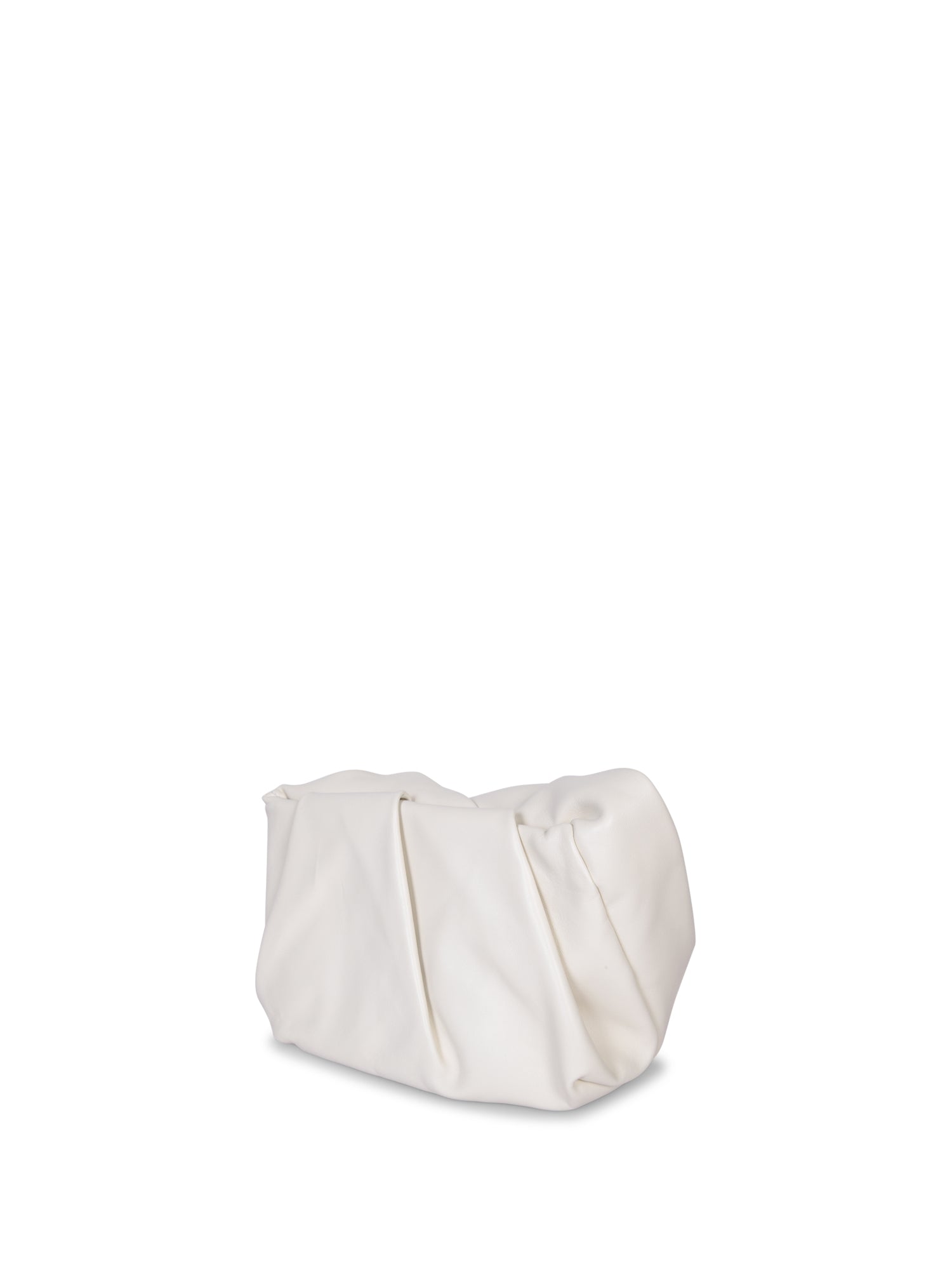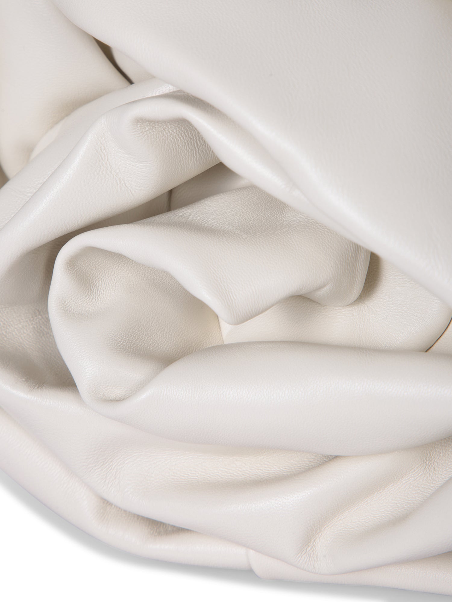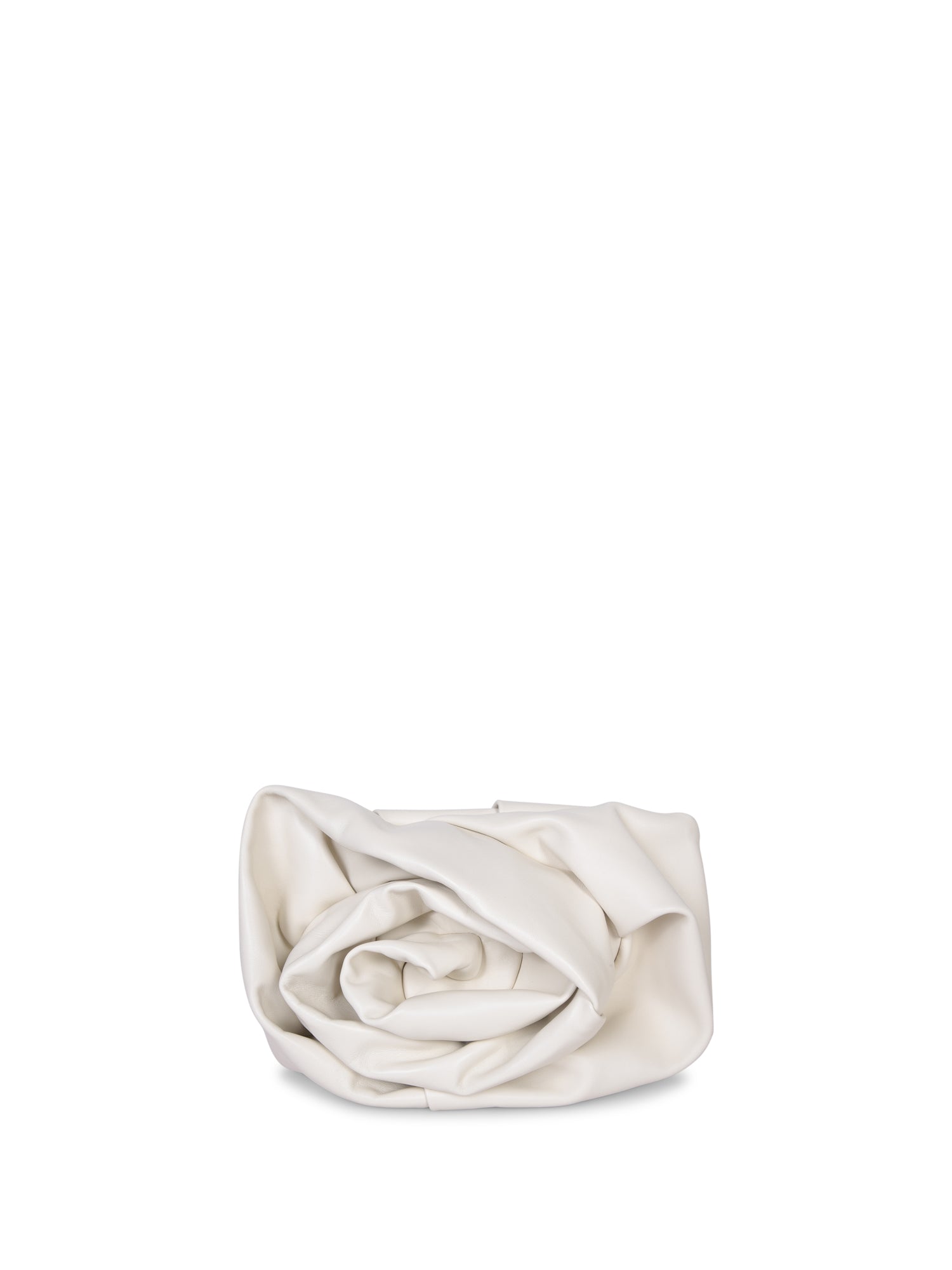 Burberry's 'Rose Clutch' in beige fabric boasts a sophisticated rose-shaped design that embodies understated elegance. Its soft, refined exterior adds a touch of glamour to any occasion.