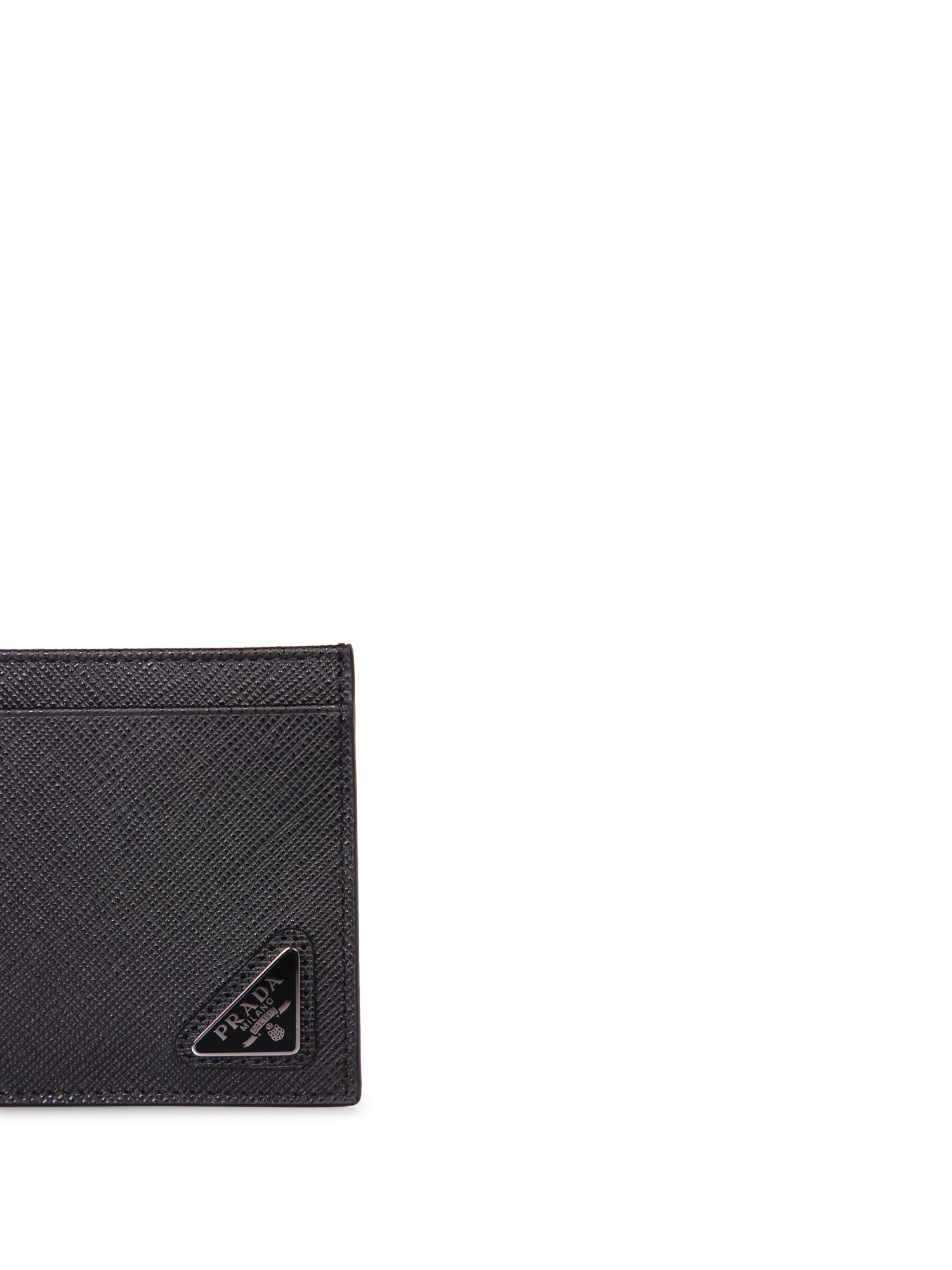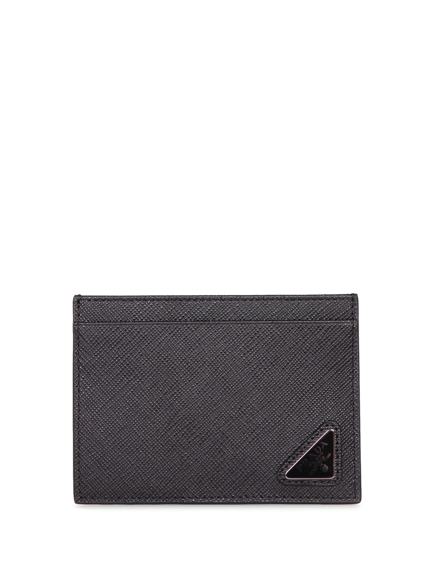 Crafted from Saffiano leather. Five card slots. Metal triangle logo.