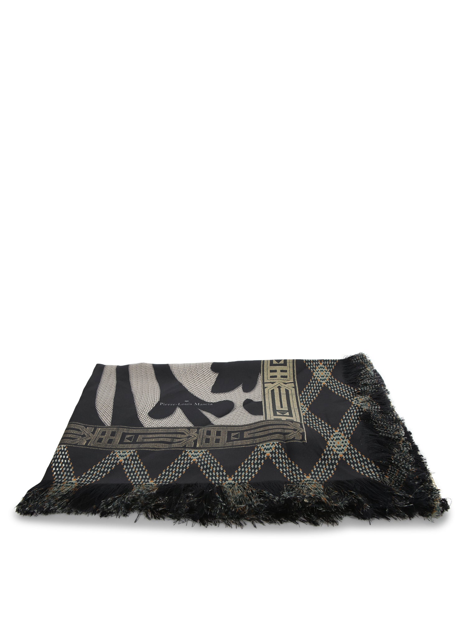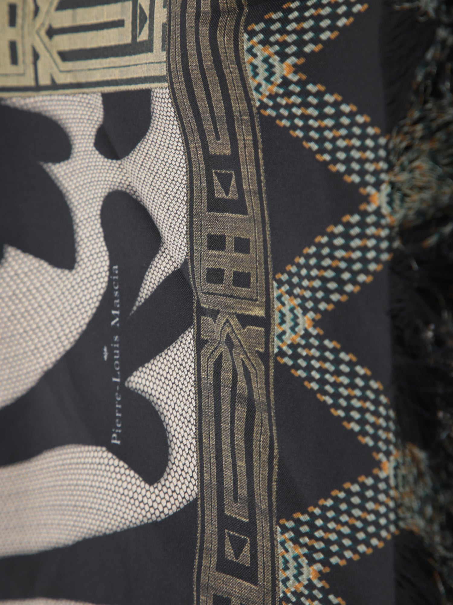 Wide scarf in jacquard fabric. Geometric and graphic patterns. Fringed finishes.