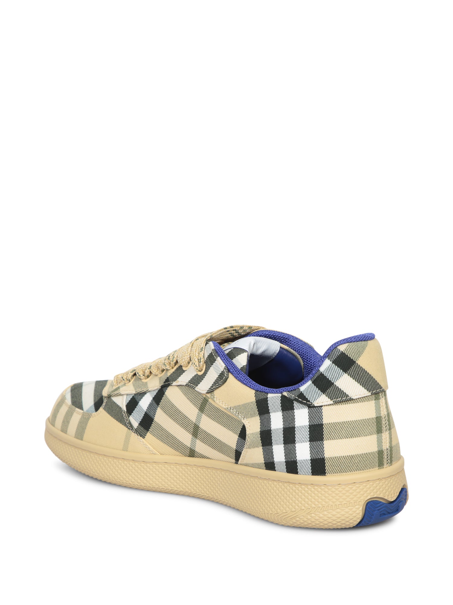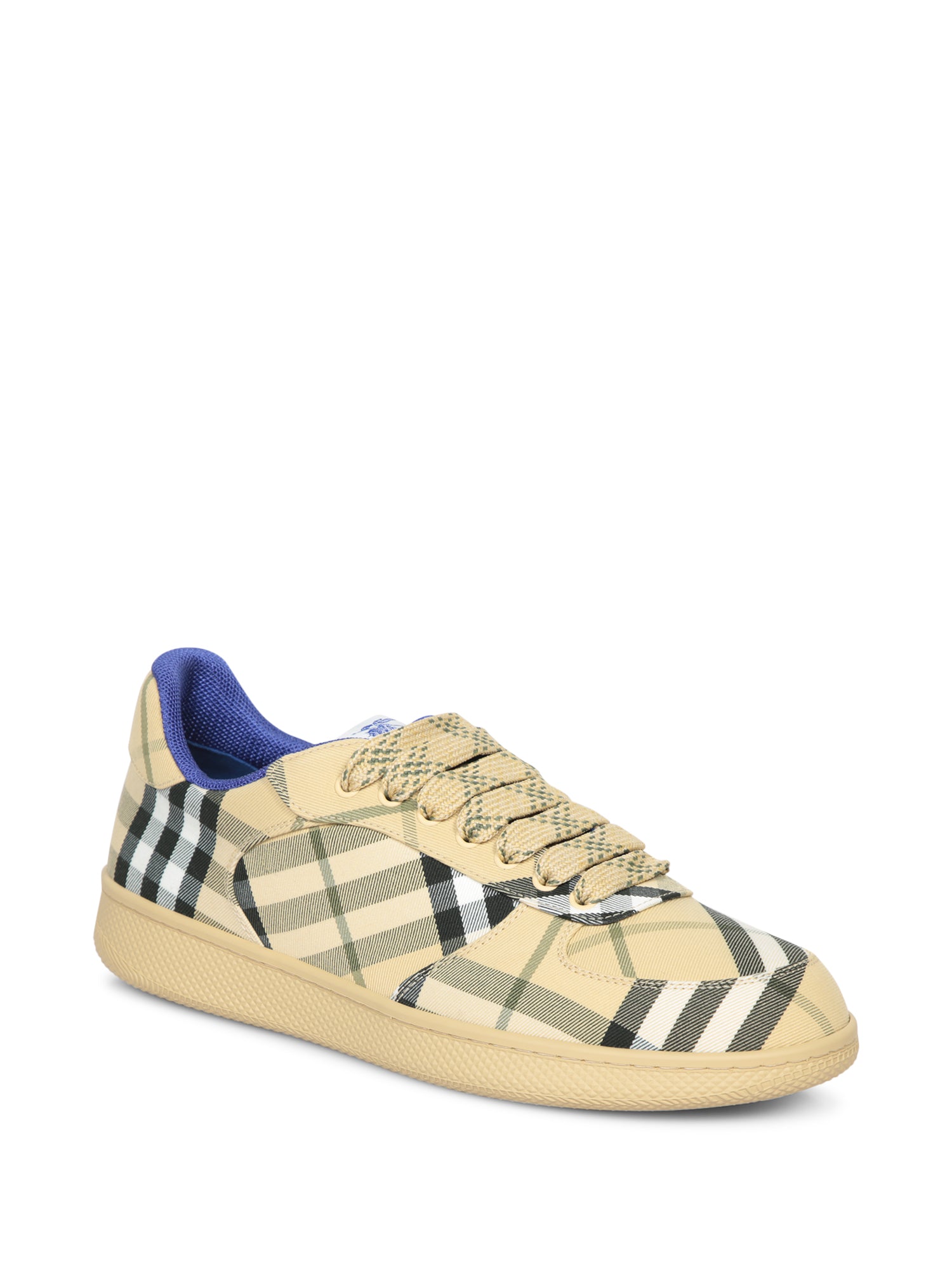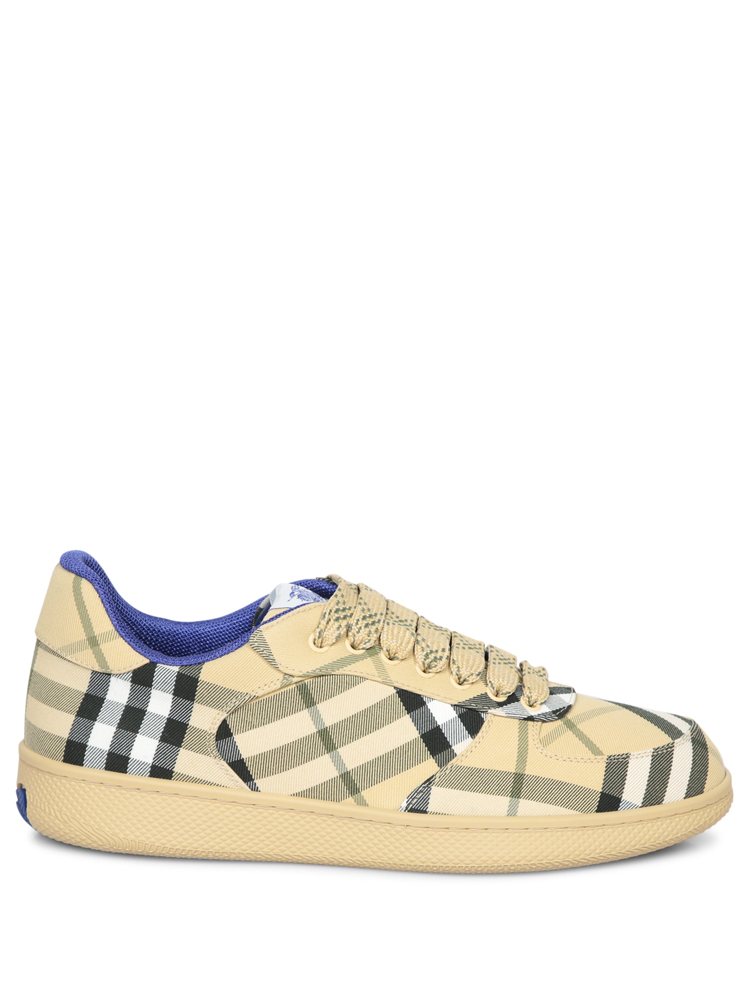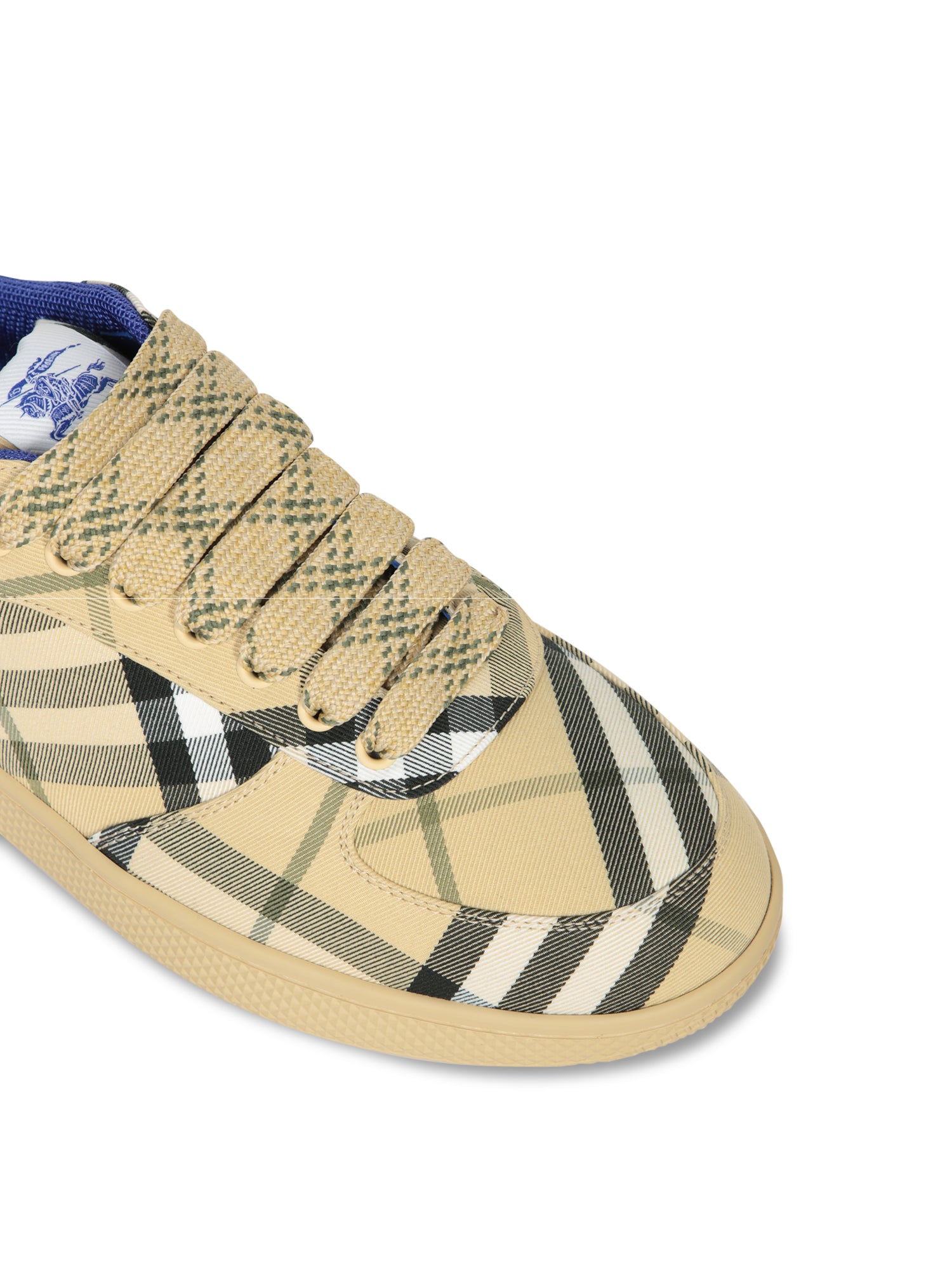 Iconic Burberry sneakers featuring the signature check pattern, enhanced with blue leather details and a textured rubber sole for ultimate comfort and enduring style.