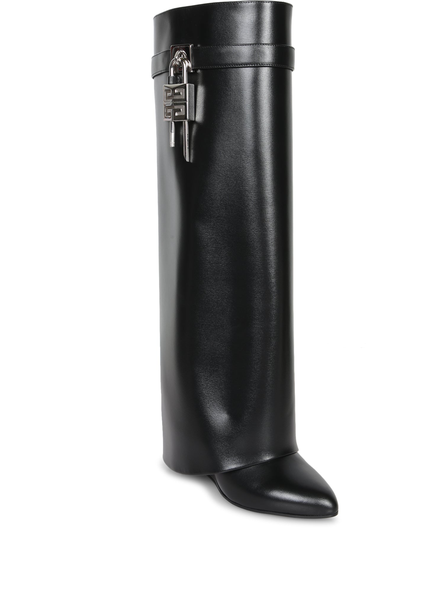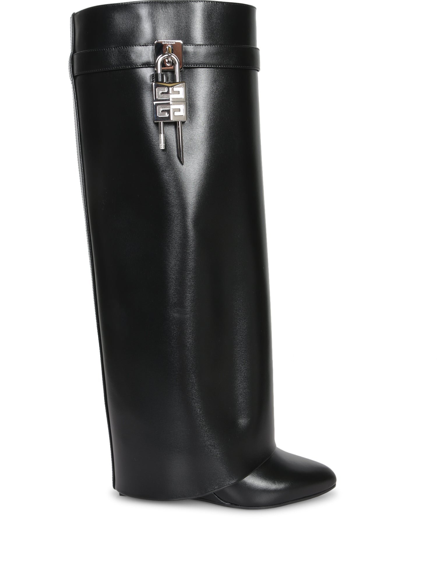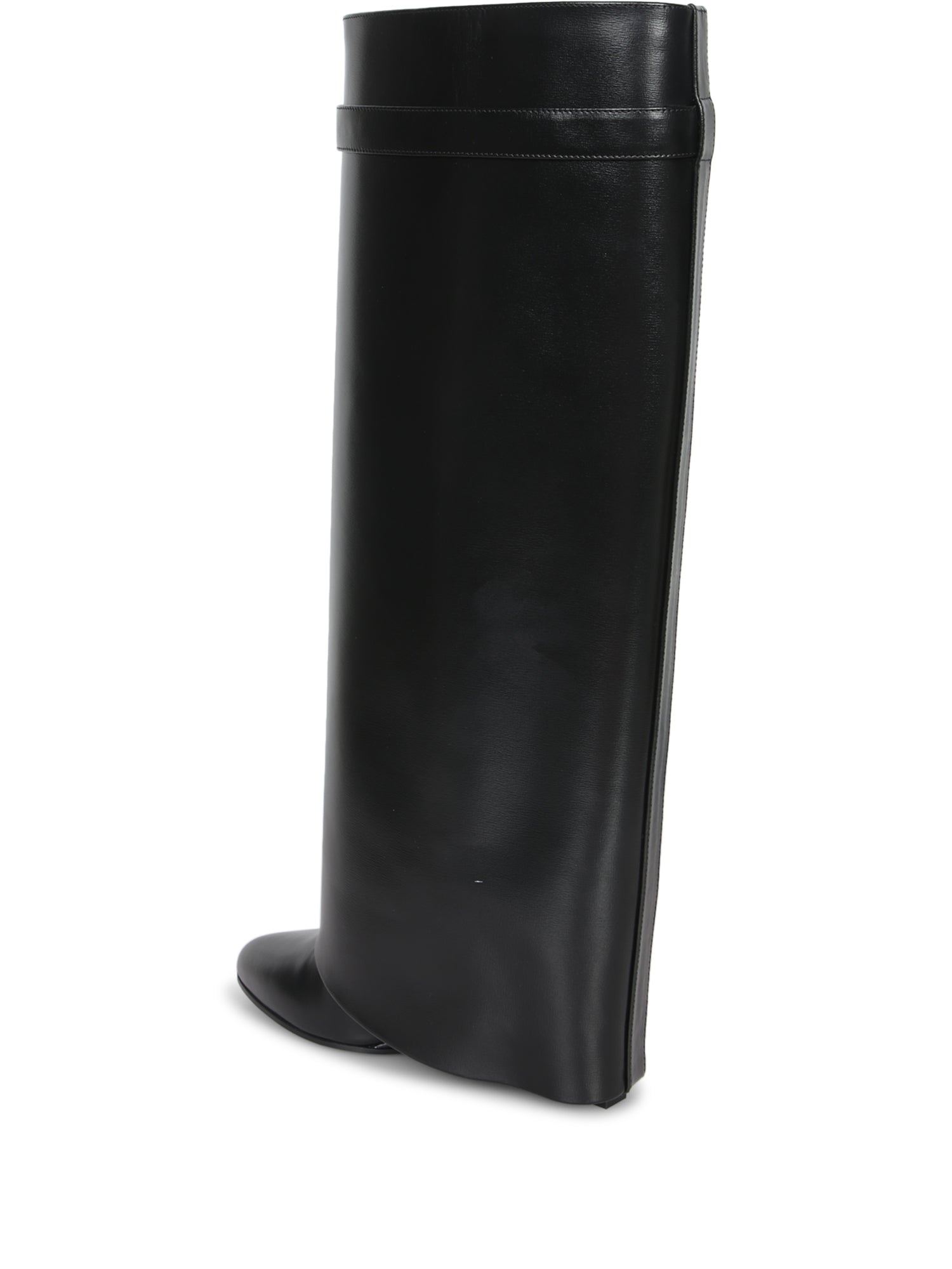 Knee-high boots in smooth leather. Features a silver logo buckle closure. Rounded toe.