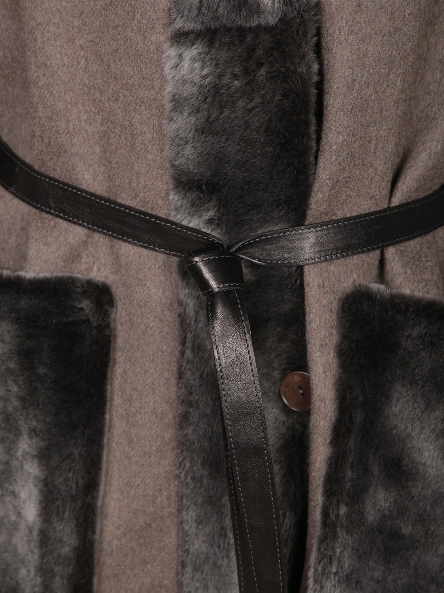 Shearling coat with wide lapel collar, patch pockets, and a waist belt.