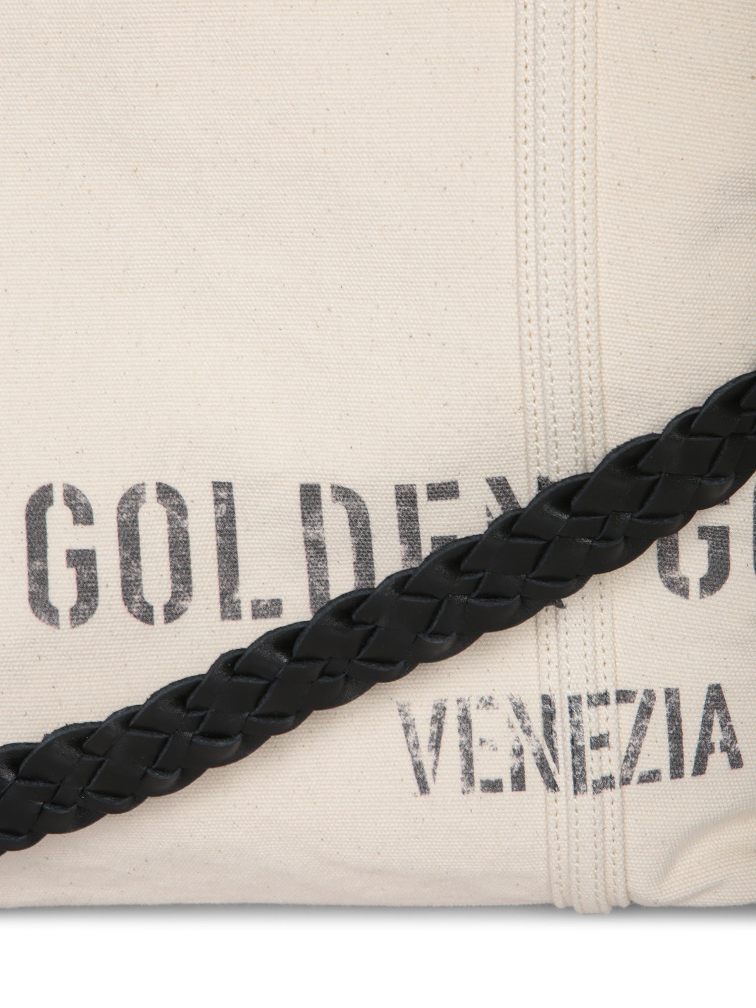 This chic Golden Goose shopping bag, crafted in durable beige canvas, is finished with a black braided shoulder strap and sophisticated leather details. Perfect for a refined and functional everyday look.
