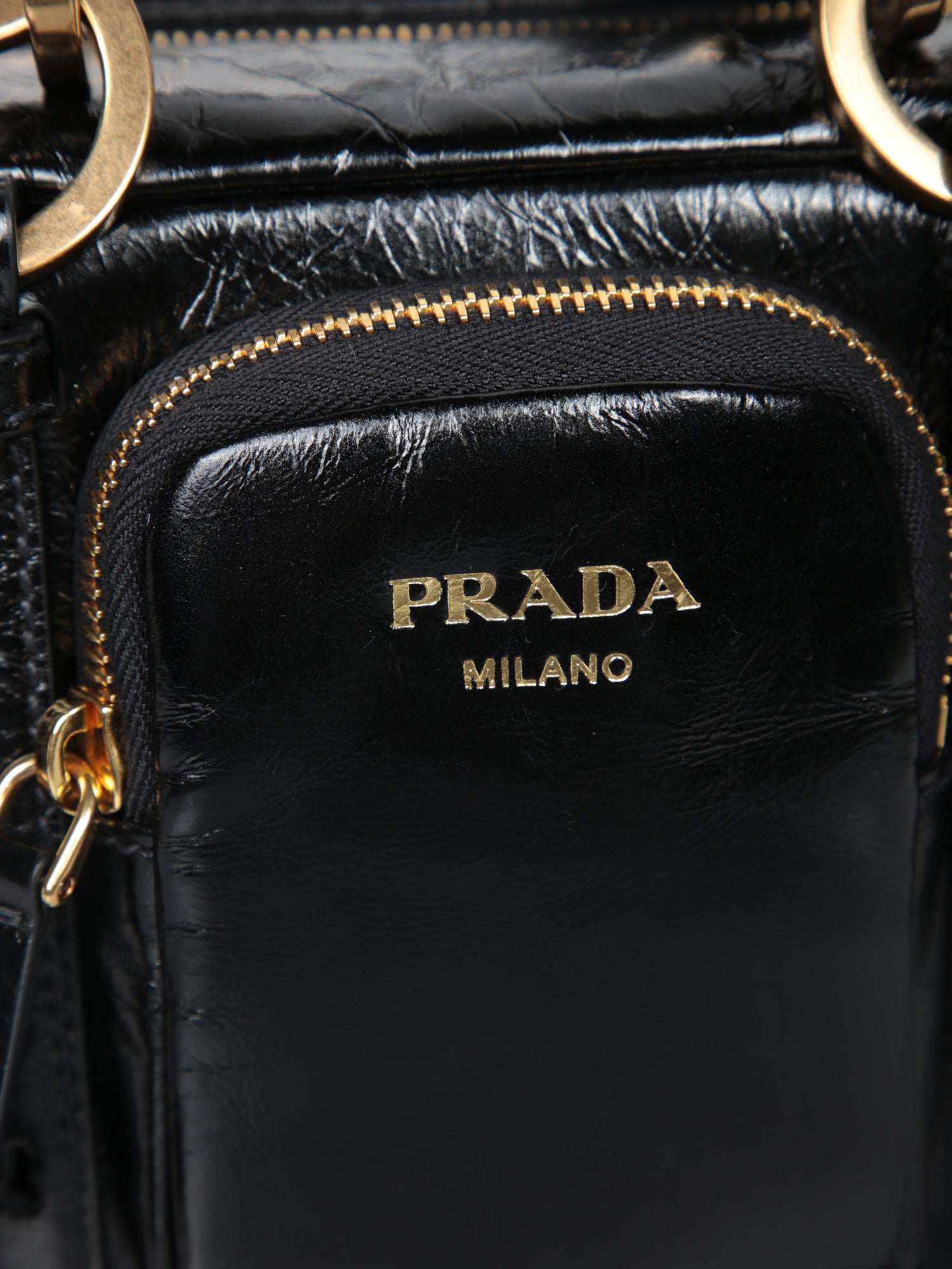 This elegant Prada handbag features a sophisticated silhouette and perfect medium size for daily use. Gold-tone accents on the handles add a touch of class, with prominent branding on the front highlighting its exclusivity.