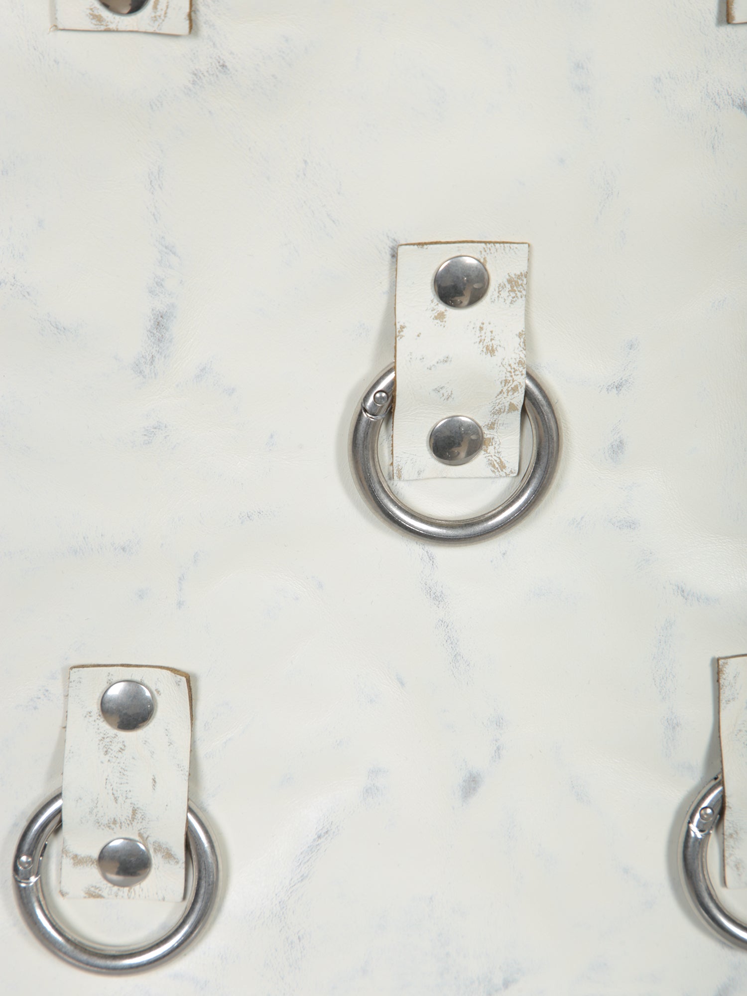 Marble-effect fabric skirt. Silver eyelet details. Brown leather belt with metallic buckle.