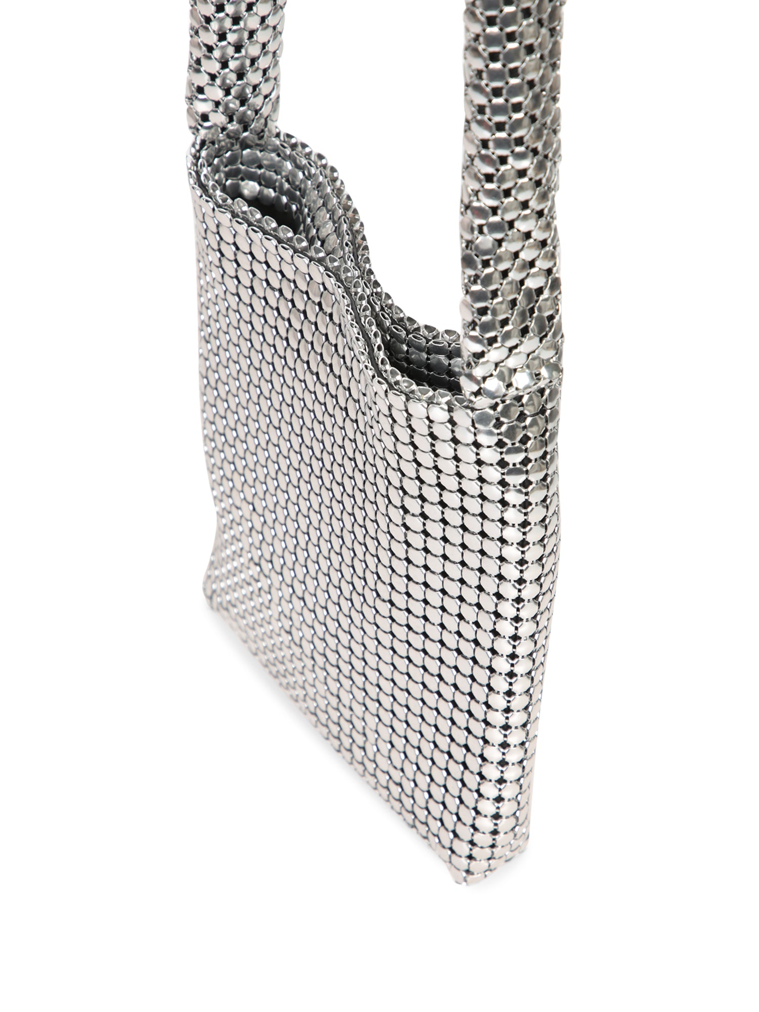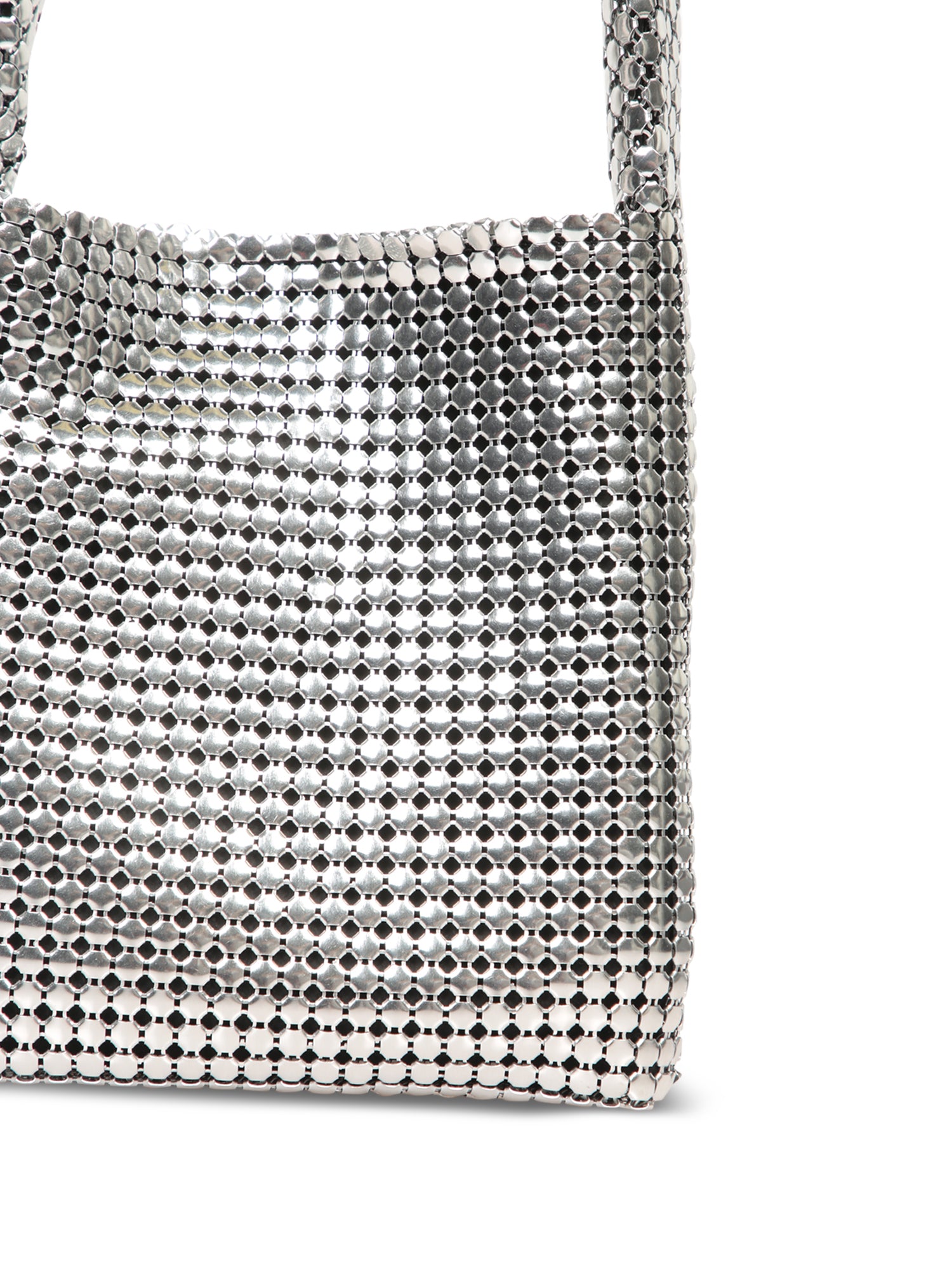 Compact shoulder bag covered in mirrored metal plates. Open top closure.