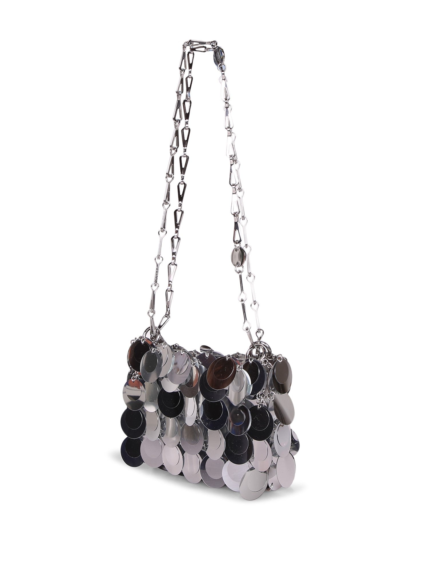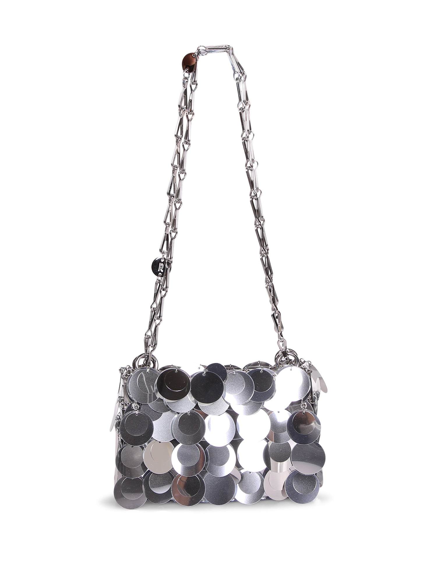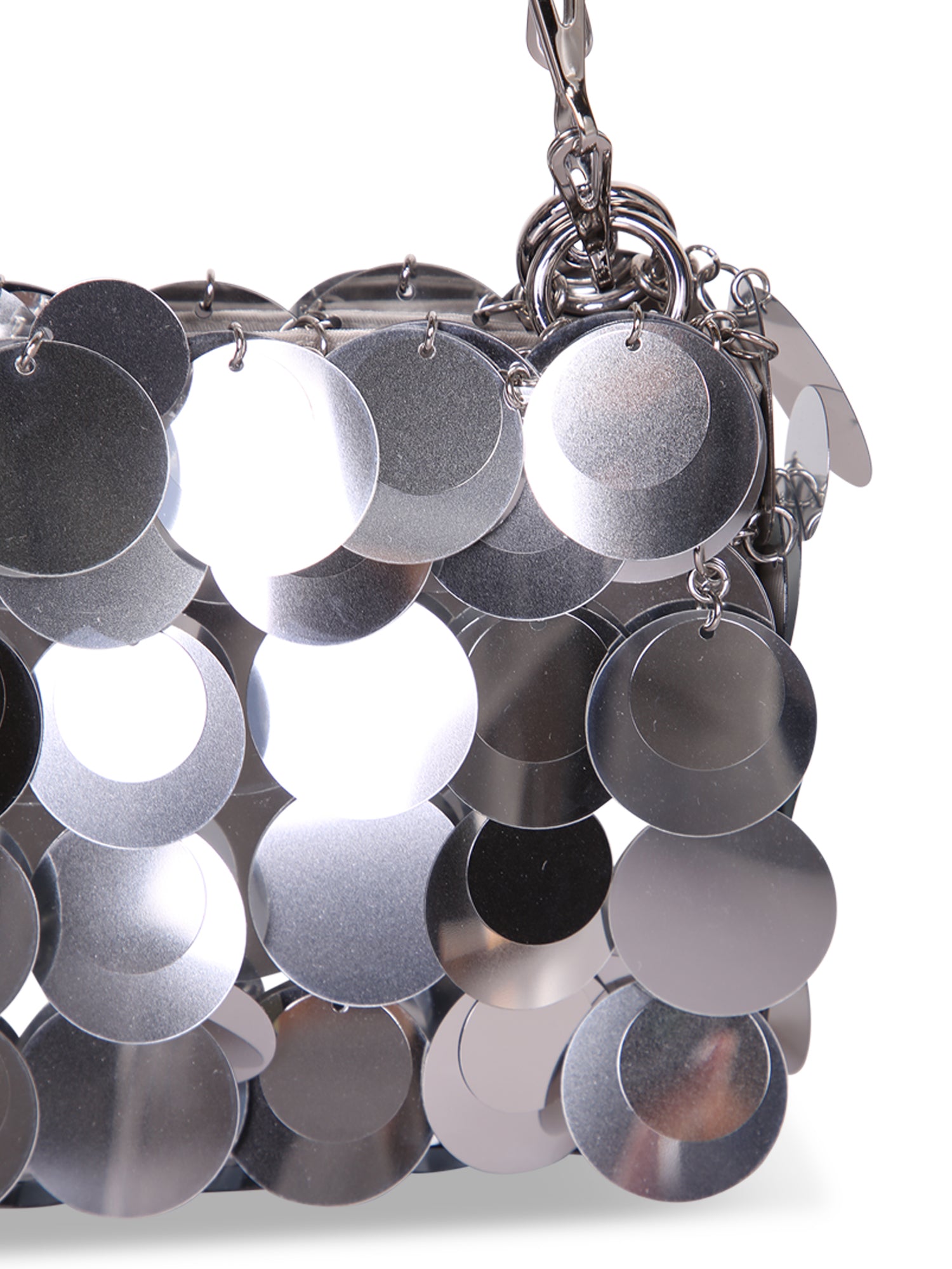 Metal chain handbag. Adorned with metallic silver discs. Snap closure.